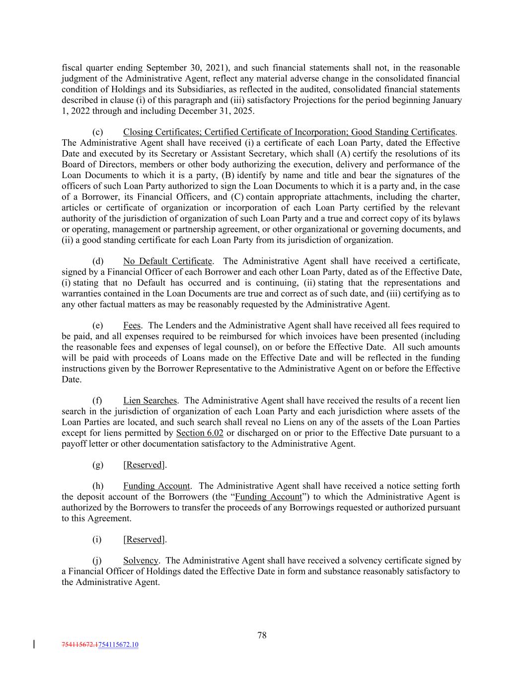 fiscal quarter ending September 30, 2021), and such financial statements shall not, in the reasonable judgment of the Administrative Agent, reflect any material adverse change in the consolidated financial condition of Holdings and its Subsidiaries, as reflected in the audited, consolidated financial statements described in clause (i) of this paragraph and (iii) satisfactory Projections for the period beginning January 1, 2022 through and including December 31, 2025. (c) Closing Certificates; Certified Certificate of Incorporation; Good Standing Certificates. The Administrative Agent shall have received (i) a certificate of each Loan Party, dated the Effective Date and executed by its Secretary or Assistant Secretary, which shall (A) certify the resolutions of its Board of Directors, members or other body authorizing the execution, delivery and performance of the Loan Documents to which it is a party, (B) identify by name and title and bear the signatures of the officers of such Loan Party authorized to sign the Loan Documents to which it is a party and, in the case of a Borrower, its Financial Officers, and (C) contain appropriate attachments, including the charter, articles or certificate of organization or incorporation of each Loan Party certified by the relevant authority of the jurisdiction of organization of such Loan Party and a true and correct copy of its bylaws or operating, management or partnership agreement, or other organizational or governing documents, and (ii) a good standing certificate for each Loan Party from its jurisdiction of organization. (d) No Default Certificate. The Administrative Agent shall have received a certificate, signed by a Financial Officer of each Borrower and each other Loan Party, dated as of the Effective Date, (i) stating that no Default has occurred and is continuing, (ii) stating that the representations and warranties contained in the Loan Documents are true and correct as of such date, and (iii) certifying as to any other factual matters as may be reasonably requested by the Administrative Agent. (e) Fees. The Lenders and the Administrative Agent shall have received all fees required to be paid, and all expenses required to be reimbursed for which invoices have been presented (including the reasonable fees and expenses of legal counsel), on or before the Effective Date. All such amounts will be paid with proceeds of Loans made on the Effective Date and will be reflected in the funding instructions given by the Borrower Representative to the Administrative Agent on or before the Effective Date. (f) Lien Searches. The Administrative Agent shall have received the results of a recent lien search in the jurisdiction of organization of each Loan Party and each jurisdiction where assets of the Loan Parties are located, and such search shall reveal no Liens on any of the assets of the Loan Parties except for liens permitted by Section 6.02 or discharged on or prior to the Effective Date pursuant to a payoff letter or other documentation satisfactory to the Administrative Agent. (g) [Reserved]. (h) Funding Account. The Administrative Agent shall have received a notice setting forth the deposit account of the Borrowers (the “Funding Account”) to which the Administrative Agent is authorized by the Borrowers to transfer the proceeds of any Borrowings requested or authorized pursuant to this Agreement. (i) [Reserved]. (j) Solvency. The Administrative Agent shall have received a solvency certificate signed by a Financial Officer of Holdings dated the Effective Date in form and substance reasonably satisfactory to the Administrative Agent. 78 754115672.1754115672.10