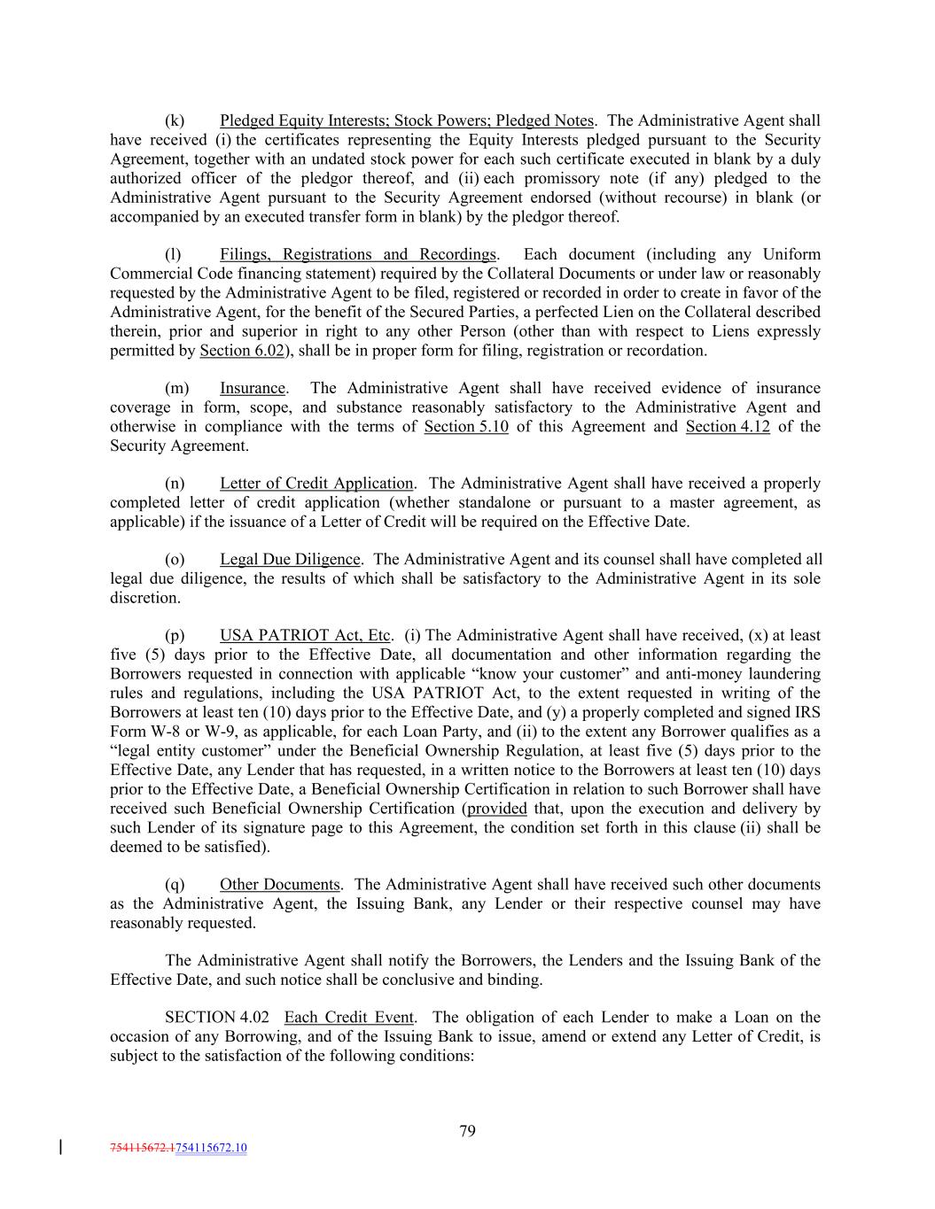 (k) Pledged Equity Interests; Stock Powers; Pledged Notes. The Administrative Agent shall have received (i) the certificates representing the Equity Interests pledged pursuant to the Security Agreement, together with an undated stock power for each such certificate executed in blank by a duly authorized officer of the pledgor thereof, and (ii) each promissory note (if any) pledged to the Administrative Agent pursuant to the Security Agreement endorsed (without recourse) in blank (or accompanied by an executed transfer form in blank) by the pledgor thereof. (l) Filings, Registrations and Recordings. Each document (including any Uniform Commercial Code financing statement) required by the Collateral Documents or under law or reasonably requested by the Administrative Agent to be filed, registered or recorded in order to create in favor of the Administrative Agent, for the benefit of the Secured Parties, a perfected Lien on the Collateral described therein, prior and superior in right to any other Person (other than with respect to Liens expressly permitted by Section 6.02), shall be in proper form for filing, registration or recordation. (m) Insurance. The Administrative Agent shall have received evidence of insurance coverage in form, scope, and substance reasonably satisfactory to the Administrative Agent and otherwise in compliance with the terms of Section 5.10 of this Agreement and Section 4.12 of the Security Agreement. (n) Letter of Credit Application. The Administrative Agent shall have received a properly completed letter of credit application (whether standalone or pursuant to a master agreement, as applicable) if the issuance of a Letter of Credit will be required on the Effective Date. (o) Legal Due Diligence. The Administrative Agent and its counsel shall have completed all legal due diligence, the results of which shall be satisfactory to the Administrative Agent in its sole discretion. (p) USA PATRIOT Act, Etc. (i) The Administrative Agent shall have received, (x) at least five (5) days prior to the Effective Date, all documentation and other information regarding the Borrowers requested in connection with applicable “know your customer” and anti-money laundering rules and regulations, including the USA PATRIOT Act, to the extent requested in writing of the Borrowers at least ten (10) days prior to the Effective Date, and (y) a properly completed and signed IRS Form W-8 or W-9, as applicable, for each Loan Party, and (ii) to the extent any Borrower qualifies as a “legal entity customer” under the Beneficial Ownership Regulation, at least five (5) days prior to the Effective Date, any Lender that has requested, in a written notice to the Borrowers at least ten (10) days prior to the Effective Date, a Beneficial Ownership Certification in relation to such Borrower shall have received such Beneficial Ownership Certification (provided that, upon the execution and delivery by such Lender of its signature page to this Agreement, the condition set forth in this clause (ii) shall be deemed to be satisfied). (q) Other Documents. The Administrative Agent shall have received such other documents as the Administrative Agent, the Issuing Bank, any Lender or their respective counsel may have reasonably requested. The Administrative Agent shall notify the Borrowers, the Lenders and the Issuing Bank of the Effective Date, and such notice shall be conclusive and binding. SECTION 4.02 Each Credit Event. The obligation of each Lender to make a Loan on the occasion of any Borrowing, and of the Issuing Bank to issue, amend or extend any Letter of Credit, is subject to the satisfaction of the following conditions: 79 754115672.1754115672.10