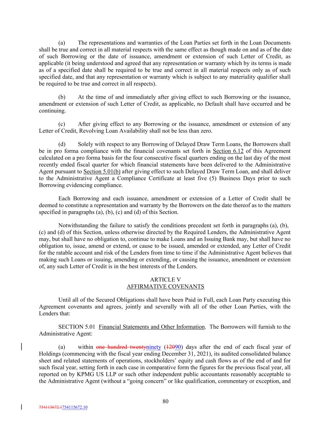 (a) The representations and warranties of the Loan Parties set forth in the Loan Documents shall be true and correct in all material respects with the same effect as though made on and as of the date of such Borrowing or the date of issuance, amendment or extension of such Letter of Credit, as applicable (it being understood and agreed that any representation or warranty which by its terms is made as of a specified date shall be required to be true and correct in all material respects only as of such specified date, and that any representation or warranty which is subject to any materiality qualifier shall be required to be true and correct in all respects). (b) At the time of and immediately after giving effect to such Borrowing or the issuance, amendment or extension of such Letter of Credit, as applicable, no Default shall have occurred and be continuing. (c) After giving effect to any Borrowing or the issuance, amendment or extension of any Letter of Credit, Revolving Loan Availability shall not be less than zero. (d) Solely with respect to any Borrowing of Delayed Draw Term Loans, the Borrowers shall be in pro forma compliance with the financial covenants set forth in Section 6.12 of this Agreement calculated on a pro forma basis for the four consecutive fiscal quarters ending on the last day of the most recently ended fiscal quarter for which financial statements have been delivered to the Administrative Agent pursuant to Section 5.01(b) after giving effect to such Delayed Draw Term Loan, and shall deliver to the Administrative Agent a Compliance Certificate at least five (5) Business Days prior to such Borrowing evidencing compliance. Each Borrowing and each issuance, amendment or extension of a Letter of Credit shall be deemed to constitute a representation and warranty by the Borrowers on the date thereof as to the matters specified in paragraphs (a), (b), (c) and (d) of this Section. Notwithstanding the failure to satisfy the conditions precedent set forth in paragraphs (a), (b), (c) and (d) of this Section, unless otherwise directed by the Required Lenders, the Administrative Agent may, but shall have no obligation to, continue to make Loans and an Issuing Bank may, but shall have no obligation to, issue, amend or extend, or cause to be issued, amended or extended, any Letter of Credit for the ratable account and risk of the Lenders from time to time if the Administrative Agent believes that making such Loans or issuing, amending or extending, or causing the issuance, amendment or extension of, any such Letter of Credit is in the best interests of the Lenders. ARTICLE V AFFIRMATIVE COVENANTS Until all of the Secured Obligations shall have been Paid in Full, each Loan Party executing this Agreement covenants and agrees, jointly and severally with all of the other Loan Parties, with the Lenders that: SECTION 5.01 Financial Statements and Other Information. The Borrowers will furnish to the Administrative Agent: (a) within one hundred twentyninety (12090) days after the end of each fiscal year of Holdings (commencing with the fiscal year ending December 31, 2021), its audited consolidated balance sheet and related statements of operations, stockholders’ equity and cash flows as of the end of and for such fiscal year, setting forth in each case in comparative form the figures for the previous fiscal year, all reported on by KPMG US LLP or such other independent public accountants reasonably acceptable to the Administrative Agent (without a “going concern” or like qualification, commentary or exception, and 80 754115672.1754115672.10
