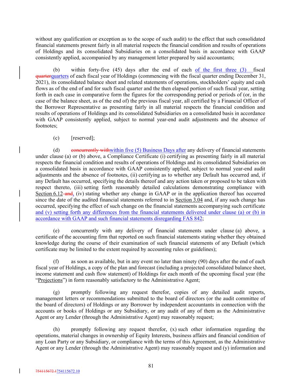 without any qualification or exception as to the scope of such audit) to the effect that such consolidated financial statements present fairly in all material respects the financial condition and results of operations of Holdings and its consolidated Subsidiaries on a consolidated basis in accordance with GAAP consistently applied, accompanied by any management letter prepared by said accountants; (b) within forty-five (45) days after the end of each of the first three (3) fiscal quarterquarters of each fiscal year of Holdings (commencing with the fiscal quarter ending December 31, 2021), its consolidated balance sheet and related statements of operations, stockholders’ equity and cash flows as of the end of and for such fiscal quarter and the then elapsed portion of such fiscal year, setting forth in each case in comparative form the figures for the corresponding period or periods of (or, in the case of the balance sheet, as of the end of) the previous fiscal year, all certified by a Financial Officer of the Borrower Representative as presenting fairly in all material respects the financial condition and results of operations of Holdings and its consolidated Subsidiaries on a consolidated basis in accordance with GAAP consistently applied, subject to normal year-end audit adjustments and the absence of footnotes; (c) [reserved]; (d) concurrently withwithin five (5) Business Days after any delivery of financial statements under clause (a) or (b) above, a Compliance Certificate (i) certifying as presenting fairly in all material respects the financial condition and results of operations of Holdings and its consolidated Subsidiaries on a consolidated basis in accordance with GAAP consistently applied, subject to normal year-end audit adjustments and the absence of footnotes, (ii) certifying as to whether any Default has occurred and, if any Default has occurred, specifying the details thereof and any action taken or proposed to be taken with respect thereto, (iii) setting forth reasonably detailed calculations demonstrating compliance with Section 6.12 and, (iv) stating whether any change in GAAP or in the application thereof has occurred since the date of the audited financial statements referred to in Section 3.04 and, if any such change has occurred, specifying the effect of such change on the financial statements accompanying such certificate and (v) setting forth any differences from the financial statements delivered under clause (a) or (b) in accordance with GAAP and such financial statements disregarding FAS 842; (e) concurrently with any delivery of financial statements under clause (a) above, a certificate of the accounting firm that reported on such financial statements stating whether they obtained knowledge during the course of their examination of such financial statements of any Default (which certificate may be limited to the extent required by accounting rules or guidelines); (f) as soon as available, but in any event no later than ninety (90) days after the end of each fiscal year of Holdings, a copy of the plan and forecast (including a projected consolidated balance sheet, income statement and cash flow statement) of Holdings for each month of the upcoming fiscal year (the “Projections”) in form reasonably satisfactory to the Administrative Agent; (g) promptly following any request therefor, copies of any detailed audit reports, management letters or recommendations submitted to the board of directors (or the audit committee of the board of directors) of Holdings or any Borrower by independent accountants in connection with the accounts or books of Holdings or any Subsidiary, or any audit of any of them as the Administrative Agent or any Lender (through the Administrative Agent) may reasonably request; (h) promptly following any request therefor, (x) such other information regarding the operations, material changes in ownership of Equity Interests, business affairs and financial condition of any Loan Party or any Subsidiary, or compliance with the terms of this Agreement, as the Administrative Agent or any Lender (through the Administrative Agent) may reasonably request and (y) information and 81 754115672.1754115672.10