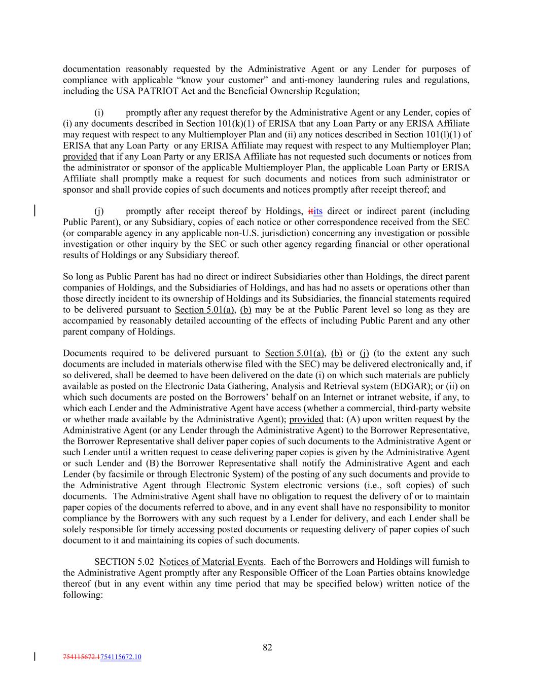 documentation reasonably requested by the Administrative Agent or any Lender for purposes of compliance with applicable “know your customer” and anti-money laundering rules and regulations, including the USA PATRIOT Act and the Beneficial Ownership Regulation; (i) promptly after any request therefor by the Administrative Agent or any Lender, copies of (i) any documents described in Section 101(k)(1) of ERISA that any Loan Party or any ERISA Affiliate may request with respect to any Multiemployer Plan and (ii) any notices described in Section 101(l)(1) of ERISA that any Loan Party or any ERISA Affiliate may request with respect to any Multiemployer Plan; provided that if any Loan Party or any ERISA Affiliate has not requested such documents or notices from the administrator or sponsor of the applicable Multiemployer Plan, the applicable Loan Party or ERISA Affiliate shall promptly make a request for such documents and notices from such administrator or sponsor and shall provide copies of such documents and notices promptly after receipt thereof; and (j) promptly after receipt thereof by Holdings, itits direct or indirect parent (including Public Parent), or any Subsidiary, copies of each notice or other correspondence received from the SEC (or comparable agency in any applicable non-U.S. jurisdiction) concerning any investigation or possible investigation or other inquiry by the SEC or such other agency regarding financial or other operational results of Holdings or any Subsidiary thereof. So long as Public Parent has had no direct or indirect Subsidiaries other than Holdings, the direct parent companies of Holdings, and the Subsidiaries of Holdings, and has had no assets or operations other than those directly incident to its ownership of Holdings and its Subsidiaries, the financial statements required to be delivered pursuant to Section 5.01(a), (b) may be at the Public Parent level so long as they are accompanied by reasonably detailed accounting of the effects of including Public Parent and any other parent company of Holdings. Documents required to be delivered pursuant to Section 5.01(a), (b) or (j) (to the extent any such documents are included in materials otherwise filed with the SEC) may be delivered electronically and, if so delivered, shall be deemed to have been delivered on the date (i) on which such materials are publicly available as posted on the Electronic Data Gathering, Analysis and Retrieval system (EDGAR); or (ii) on which such documents are posted on the Borrowers’ behalf on an Internet or intranet website, if any, to which each Lender and the Administrative Agent have access (whether a commercial, third-party website or whether made available by the Administrative Agent); provided that: (A) upon written request by the Administrative Agent (or any Lender through the Administrative Agent) to the Borrower Representative, the Borrower Representative shall deliver paper copies of such documents to the Administrative Agent or such Lender until a written request to cease delivering paper copies is given by the Administrative Agent or such Lender and (B) the Borrower Representative shall notify the Administrative Agent and each Lender (by facsimile or through Electronic System) of the posting of any such documents and provide to the Administrative Agent through Electronic System electronic versions (i.e., soft copies) of such documents. The Administrative Agent shall have no obligation to request the delivery of or to maintain paper copies of the documents referred to above, and in any event shall have no responsibility to monitor compliance by the Borrowers with any such request by a Lender for delivery, and each Lender shall be solely responsible for timely accessing posted documents or requesting delivery of paper copies of such document to it and maintaining its copies of such documents. SECTION 5.02 Notices of Material Events. Each of the Borrowers and Holdings will furnish to the Administrative Agent promptly after any Responsible Officer of the Loan Parties obtains knowledge thereof (but in any event within any time period that may be specified below) written notice of the following: 82 754115672.1754115672.10