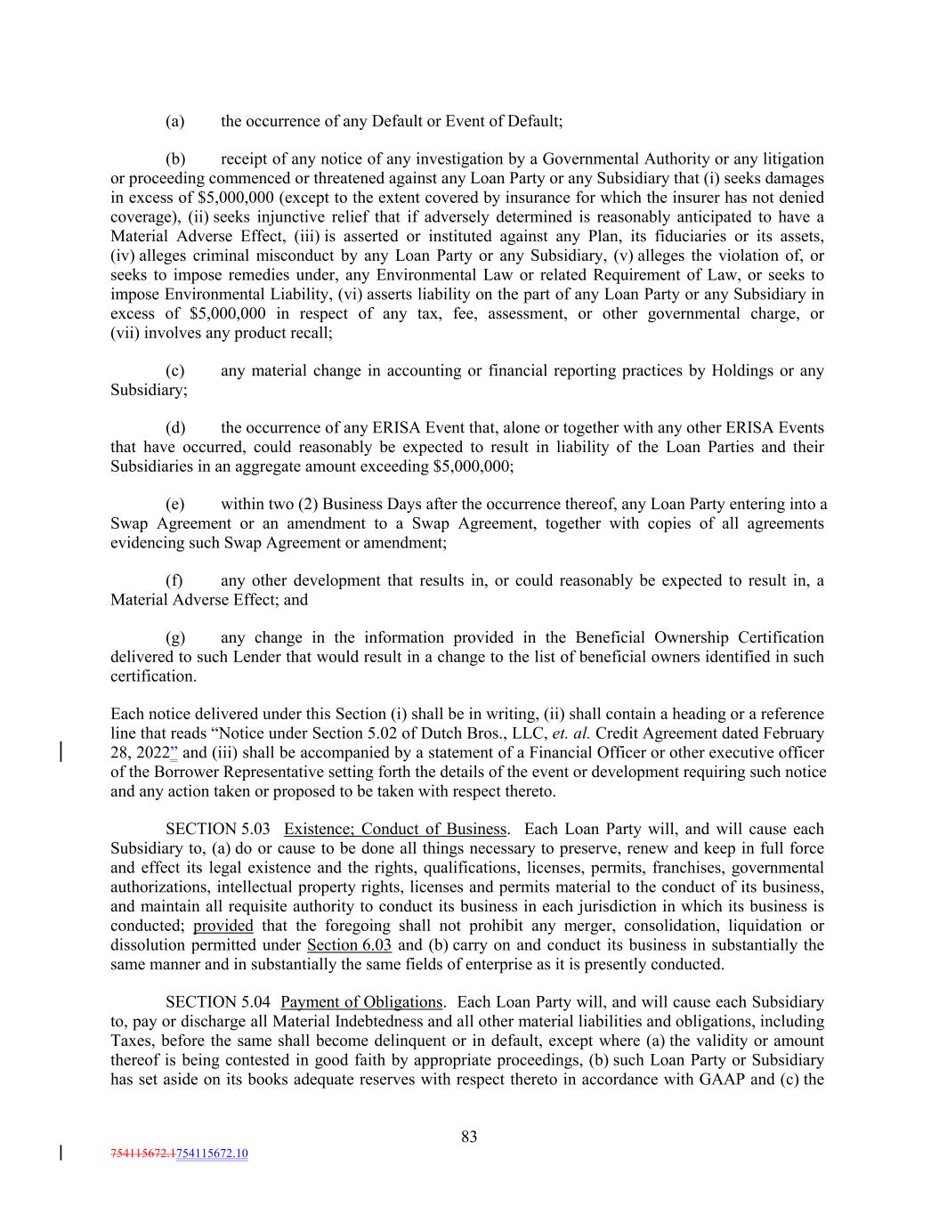 (a) the occurrence of any Default or Event of Default; (b) receipt of any notice of any investigation by a Governmental Authority or any litigation or proceeding commenced or threatened against any Loan Party or any Subsidiary that (i) seeks damages in excess of $5,000,000 (except to the extent covered by insurance for which the insurer has not denied coverage), (ii) seeks injunctive relief that if adversely determined is reasonably anticipated to have a Material Adverse Effect, (iii) is asserted or instituted against any Plan, its fiduciaries or its assets, (iv) alleges criminal misconduct by any Loan Party or any Subsidiary, (v) alleges the violation of, or seeks to impose remedies under, any Environmental Law or related Requirement of Law, or seeks to impose Environmental Liability, (vi) asserts liability on the part of any Loan Party or any Subsidiary in excess of $5,000,000 in respect of any tax, fee, assessment, or other governmental charge, or (vii) involves any product recall; (c) any material change in accounting or financial reporting practices by Holdings or any Subsidiary; (d) the occurrence of any ERISA Event that, alone or together with any other ERISA Events that have occurred, could reasonably be expected to result in liability of the Loan Parties and their Subsidiaries in an aggregate amount exceeding $5,000,000; (e) within two (2) Business Days after the occurrence thereof, any Loan Party entering into a Swap Agreement or an amendment to a Swap Agreement, together with copies of all agreements evidencing such Swap Agreement or amendment; (f) any other development that results in, or could reasonably be expected to result in, a Material Adverse Effect; and (g) any change in the information provided in the Beneficial Ownership Certification delivered to such Lender that would result in a change to the list of beneficial owners identified in such certification. Each notice delivered under this Section (i) shall be in writing, (ii) shall contain a heading or a reference line that reads “Notice under Section 5.02 of Dutch Bros., LLC, et. al. Credit Agreement dated February 28, 2022” and (iii) shall be accompanied by a statement of a Financial Officer or other executive officer of the Borrower Representative setting forth the details of the event or development requiring such notice and any action taken or proposed to be taken with respect thereto. SECTION 5.03 Existence; Conduct of Business. Each Loan Party will, and will cause each Subsidiary to, (a) do or cause to be done all things necessary to preserve, renew and keep in full force and effect its legal existence and the rights, qualifications, licenses, permits, franchises, governmental authorizations, intellectual property rights, licenses and permits material to the conduct of its business, and maintain all requisite authority to conduct its business in each jurisdiction in which its business is conducted; provided that the foregoing shall not prohibit any merger, consolidation, liquidation or dissolution permitted under Section 6.03 and (b) carry on and conduct its business in substantially the same manner and in substantially the same fields of enterprise as it is presently conducted. SECTION 5.04 Payment of Obligations. Each Loan Party will, and will cause each Subsidiary to, pay or discharge all Material Indebtedness and all other material liabilities and obligations, including Taxes, before the same shall become delinquent or in default, except where (a) the validity or amount thereof is being contested in good faith by appropriate proceedings, (b) such Loan Party or Subsidiary has set aside on its books adequate reserves with respect thereto in accordance with GAAP and (c) the 83 754115672.1754115672.10
