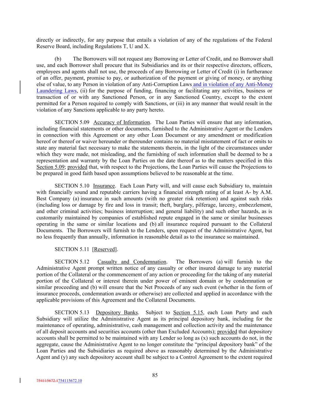 directly or indirectly, for any purpose that entails a violation of any of the regulations of the Federal Reserve Board, including Regulations T, U and X. (b) The Borrowers will not request any Borrowing or Letter of Credit, and no Borrower shall use, and each Borrower shall procure that its Subsidiaries and its or their respective directors, officers, employees and agents shall not use, the proceeds of any Borrowing or Letter of Credit (i) in furtherance of an offer, payment, promise to pay, or authorization of the payment or giving of money, or anything else of value, to any Person in violation of any Anti-Corruption Laws and in violation of any Anti-Money Laundering Laws, (ii) for the purpose of funding, financing or facilitating any activities, business or transaction of or with any Sanctioned Person, or in any Sanctioned Country, except to the extent permitted for a Person required to comply with Sanctions, or (iii) in any manner that would result in the violation of any Sanctions applicable to any party hereto. SECTION 5.09 Accuracy of Information. The Loan Parties will ensure that any information, including financial statements or other documents, furnished to the Administrative Agent or the Lenders in connection with this Agreement or any other Loan Document or any amendment or modification hereof or thereof or waiver hereunder or thereunder contains no material misstatement of fact or omits to state any material fact necessary to make the statements therein, in the light of the circumstances under which they were made, not misleading, and the furnishing of such information shall be deemed to be a representation and warranty by the Loan Parties on the date thereof as to the matters specified in this Section 5.09; provided that, with respect to the Projections, the Loan Parties will cause the Projections to be prepared in good faith based upon assumptions believed to be reasonable at the time. SECTION 5.10 Insurance. Each Loan Party will, and will cause each Subsidiary to, maintain with financially sound and reputable carriers having a financial strength rating of at least A- by A.M. Best Company (a) insurance in such amounts (with no greater risk retention) and against such risks (including loss or damage by fire and loss in transit; theft, burglary, pilferage, larceny, embezzlement, and other criminal activities; business interruption; and general liability) and such other hazards, as is customarily maintained by companies of established repute engaged in the same or similar businesses operating in the same or similar locations and (b) all insurance required pursuant to the Collateral Documents. The Borrowers will furnish to the Lenders, upon request of the Administrative Agent, but no less frequently than annually, information in reasonable detail as to the insurance so maintained. SECTION 5.11 [Reserved]. SECTION 5.12 Casualty and Condemnation. The Borrowers (a) will furnish to the Administrative Agent prompt written notice of any casualty or other insured damage to any material portion of the Collateral or the commencement of any action or proceeding for the taking of any material portion of the Collateral or interest therein under power of eminent domain or by condemnation or similar proceeding and (b) will ensure that the Net Proceeds of any such event (whether in the form of insurance proceeds, condemnation awards or otherwise) are collected and applied in accordance with the applicable provisions of this Agreement and the Collateral Documents. SECTION 5.13 Depository Banks. Subject to Section 5.15, each Loan Party and each Subsidiary will utilize the Administrative Agent as its principal depository bank, including for the maintenance of operating, administrative, cash management and collection activity and the maintenance of all deposit accounts and securities accounts (other than Excluded Accounts); provided that depository accounts shall be permitted to be maintained with any Lender so long as (x) such accounts do not, in the aggregate, cause the Administrative Agent to no longer constitute the “principal depository bank” of the Loan Parties and the Subsidiaries as required above as reasonably determined by the Administrative Agent and (y) any such depository account shall be subject to a Control Agreement to the extent required 85 754115672.1754115672.10