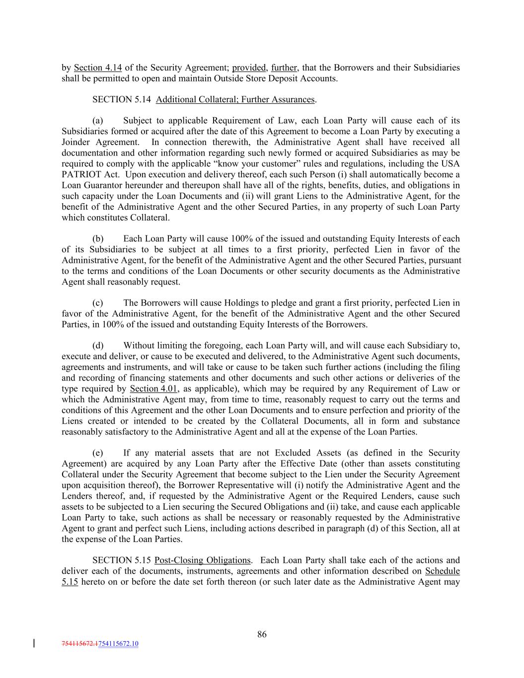 by Section 4.14 of the Security Agreement; provided, further, that the Borrowers and their Subsidiaries shall be permitted to open and maintain Outside Store Deposit Accounts. SECTION 5.14 Additional Collateral; Further Assurances. (a) Subject to applicable Requirement of Law, each Loan Party will cause each of its Subsidiaries formed or acquired after the date of this Agreement to become a Loan Party by executing a Joinder Agreement. In connection therewith, the Administrative Agent shall have received all documentation and other information regarding such newly formed or acquired Subsidiaries as may be required to comply with the applicable “know your customer” rules and regulations, including the USA PATRIOT Act. Upon execution and delivery thereof, each such Person (i) shall automatically become a Loan Guarantor hereunder and thereupon shall have all of the rights, benefits, duties, and obligations in such capacity under the Loan Documents and (ii) will grant Liens to the Administrative Agent, for the benefit of the Administrative Agent and the other Secured Parties, in any property of such Loan Party which constitutes Collateral. (b) Each Loan Party will cause 100% of the issued and outstanding Equity Interests of each of its Subsidiaries to be subject at all times to a first priority, perfected Lien in favor of the Administrative Agent, for the benefit of the Administrative Agent and the other Secured Parties, pursuant to the terms and conditions of the Loan Documents or other security documents as the Administrative Agent shall reasonably request. (c) The Borrowers will cause Holdings to pledge and grant a first priority, perfected Lien in favor of the Administrative Agent, for the benefit of the Administrative Agent and the other Secured Parties, in 100% of the issued and outstanding Equity Interests of the Borrowers. (d) Without limiting the foregoing, each Loan Party will, and will cause each Subsidiary to, execute and deliver, or cause to be executed and delivered, to the Administrative Agent such documents, agreements and instruments, and will take or cause to be taken such further actions (including the filing and recording of financing statements and other documents and such other actions or deliveries of the type required by Section 4.01, as applicable), which may be required by any Requirement of Law or which the Administrative Agent may, from time to time, reasonably request to carry out the terms and conditions of this Agreement and the other Loan Documents and to ensure perfection and priority of the Liens created or intended to be created by the Collateral Documents, all in form and substance reasonably satisfactory to the Administrative Agent and all at the expense of the Loan Parties. (e) If any material assets that are not Excluded Assets (as defined in the Security Agreement) are acquired by any Loan Party after the Effective Date (other than assets constituting Collateral under the Security Agreement that become subject to the Lien under the Security Agreement upon acquisition thereof), the Borrower Representative will (i) notify the Administrative Agent and the Lenders thereof, and, if requested by the Administrative Agent or the Required Lenders, cause such assets to be subjected to a Lien securing the Secured Obligations and (ii) take, and cause each applicable Loan Party to take, such actions as shall be necessary or reasonably requested by the Administrative Agent to grant and perfect such Liens, including actions described in paragraph (d) of this Section, all at the expense of the Loan Parties. SECTION 5.15 Post-Closing Obligations. Each Loan Party shall take each of the actions and deliver each of the documents, instruments, agreements and other information described on Schedule 5.15 hereto on or before the date set forth thereon (or such later date as the Administrative Agent may 86 754115672.1754115672.10