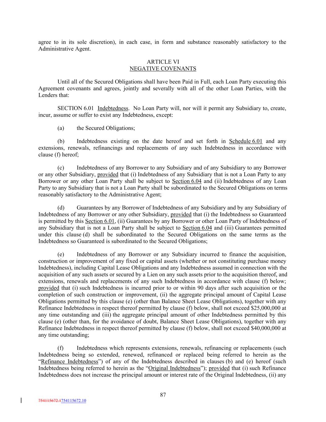 agree to in its sole discretion), in each case, in form and substance reasonably satisfactory to the Administrative Agent. ARTICLE VI NEGATIVE COVENANTS Until all of the Secured Obligations shall have been Paid in Full, each Loan Party executing this Agreement covenants and agrees, jointly and severally with all of the other Loan Parties, with the Lenders that: SECTION 6.01 Indebtedness. No Loan Party will, nor will it permit any Subsidiary to, create, incur, assume or suffer to exist any Indebtedness, except: (a) the Secured Obligations; (b) Indebtedness existing on the date hereof and set forth in Schedule 6.01 and any extensions, renewals, refinancings and replacements of any such Indebtedness in accordance with clause (f) hereof; (c) Indebtedness of any Borrower to any Subsidiary and of any Subsidiary to any Borrower or any other Subsidiary, provided that (i) Indebtedness of any Subsidiary that is not a Loan Party to any Borrower or any other Loan Party shall be subject to Section 6.04 and (ii) Indebtedness of any Loan Party to any Subsidiary that is not a Loan Party shall be subordinated to the Secured Obligations on terms reasonably satisfactory to the Administrative Agent; (d) Guarantees by any Borrower of Indebtedness of any Subsidiary and by any Subsidiary of Indebtedness of any Borrower or any other Subsidiary, provided that (i) the Indebtedness so Guaranteed is permitted by this Section 6.01, (ii) Guarantees by any Borrower or other Loan Party of Indebtedness of any Subsidiary that is not a Loan Party shall be subject to Section 6.04 and (iii) Guarantees permitted under this clause (d) shall be subordinated to the Secured Obligations on the same terms as the Indebtedness so Guaranteed is subordinated to the Secured Obligations; (e) Indebtedness of any Borrower or any Subsidiary incurred to finance the acquisition, construction or improvement of any fixed or capital assets (whether or not constituting purchase money Indebtedness), including Capital Lease Obligations and any Indebtedness assumed in connection with the acquisition of any such assets or secured by a Lien on any such assets prior to the acquisition thereof, and extensions, renewals and replacements of any such Indebtedness in accordance with clause (f) below; provided that (i) such Indebtedness is incurred prior to or within 90 days after such acquisition or the completion of such construction or improvement, (ii) the aggregate principal amount of Capital Lease Obligations permitted by this clause (e) (other than Balance Sheet Lease Obligations), together with any Refinance Indebtedness in respect thereof permitted by clause (f) below, shall not exceed $25,000,000 at any time outstanding and (iii) the aggregate principal amount of other Indebtedness permitted by this clause (e) (other than, for the avoidance of doubt, Balance Sheet Lease Obligations), together with any Refinance Indebtedness in respect thereof permitted by clause (f) below, shall not exceed $40,000,000 at any time outstanding; (f) Indebtedness which represents extensions, renewals, refinancing or replacements (such Indebtedness being so extended, renewed, refinanced or replaced being referred to herein as the “Refinance Indebtedness”) of any of the Indebtedness described in clauses (b) and (e) hereof (such Indebtedness being referred to herein as the “Original Indebtedness”); provided that (i) such Refinance Indebtedness does not increase the principal amount or interest rate of the Original Indebtedness, (ii) any 87 754115672.1754115672.10