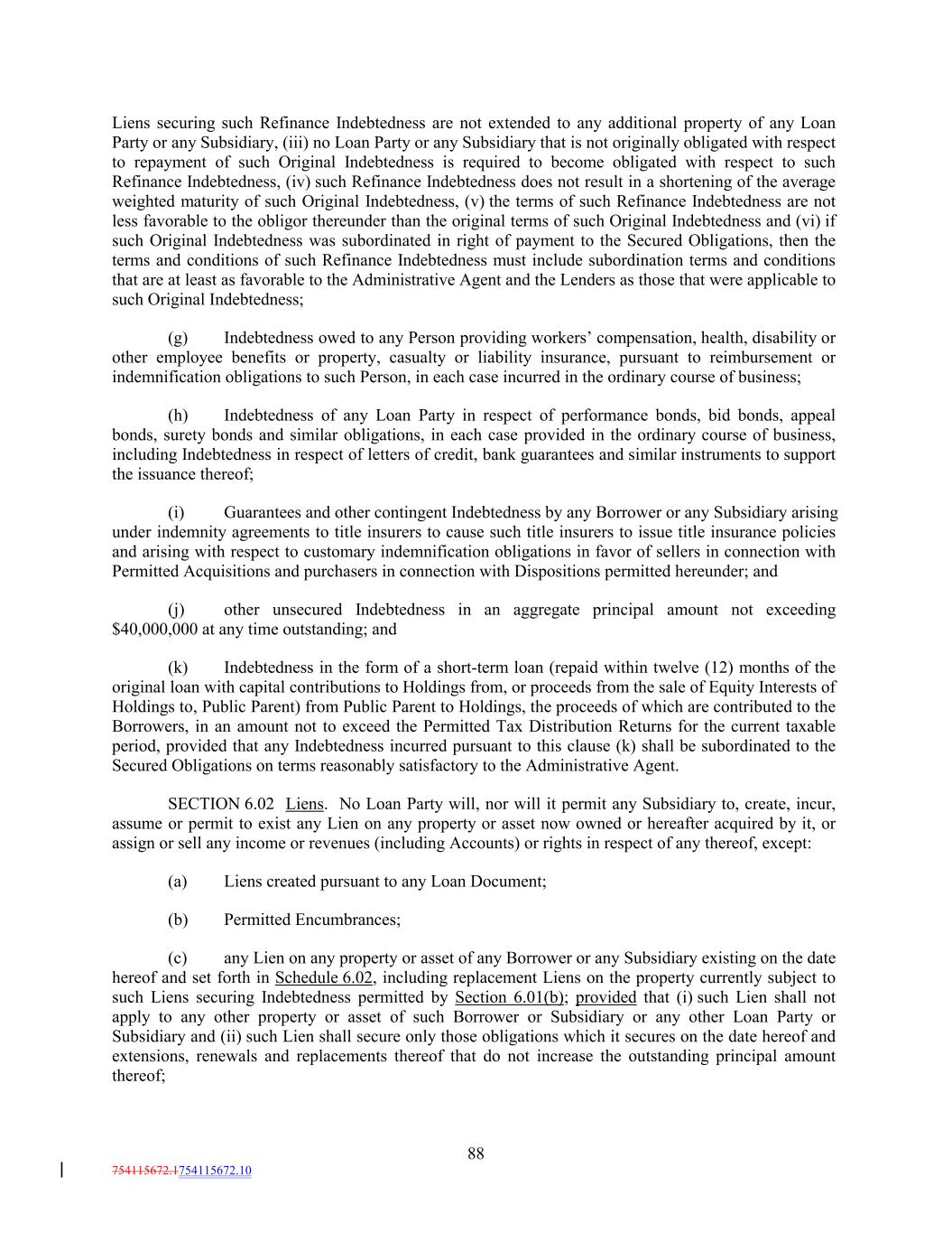 Liens securing such Refinance Indebtedness are not extended to any additional property of any Loan Party or any Subsidiary, (iii) no Loan Party or any Subsidiary that is not originally obligated with respect to repayment of such Original Indebtedness is required to become obligated with respect to such Refinance Indebtedness, (iv) such Refinance Indebtedness does not result in a shortening of the average weighted maturity of such Original Indebtedness, (v) the terms of such Refinance Indebtedness are not less favorable to the obligor thereunder than the original terms of such Original Indebtedness and (vi) if such Original Indebtedness was subordinated in right of payment to the Secured Obligations, then the terms and conditions of such Refinance Indebtedness must include subordination terms and conditions that are at least as favorable to the Administrative Agent and the Lenders as those that were applicable to such Original Indebtedness; (g) Indebtedness owed to any Person providing workers’ compensation, health, disability or other employee benefits or property, casualty or liability insurance, pursuant to reimbursement or indemnification obligations to such Person, in each case incurred in the ordinary course of business; (h) Indebtedness of any Loan Party in respect of performance bonds, bid bonds, appeal bonds, surety bonds and similar obligations, in each case provided in the ordinary course of business, including Indebtedness in respect of letters of credit, bank guarantees and similar instruments to support the issuance thereof; (i) Guarantees and other contingent Indebtedness by any Borrower or any Subsidiary arising under indemnity agreements to title insurers to cause such title insurers to issue title insurance policies and arising with respect to customary indemnification obligations in favor of sellers in connection with Permitted Acquisitions and purchasers in connection with Dispositions permitted hereunder; and (j) other unsecured Indebtedness in an aggregate principal amount not exceeding $40,000,000 at any time outstanding; and (k) Indebtedness in the form of a short-term loan (repaid within twelve (12) months of the original loan with capital contributions to Holdings from, or proceeds from the sale of Equity Interests of Holdings to, Public Parent) from Public Parent to Holdings, the proceeds of which are contributed to the Borrowers, in an amount not to exceed the Permitted Tax Distribution Returns for the current taxable period, provided that any Indebtedness incurred pursuant to this clause (k) shall be subordinated to the Secured Obligations on terms reasonably satisfactory to the Administrative Agent. SECTION 6.02 Liens. No Loan Party will, nor will it permit any Subsidiary to, create, incur, assume or permit to exist any Lien on any property or asset now owned or hereafter acquired by it, or assign or sell any income or revenues (including Accounts) or rights in respect of any thereof, except: (a) Liens created pursuant to any Loan Document; (b) Permitted Encumbrances; (c) any Lien on any property or asset of any Borrower or any Subsidiary existing on the date hereof and set forth in Schedule 6.02, including replacement Liens on the property currently subject to such Liens securing Indebtedness permitted by Section 6.01(b); provided that (i) such Lien shall not apply to any other property or asset of such Borrower or Subsidiary or any other Loan Party or Subsidiary and (ii) such Lien shall secure only those obligations which it secures on the date hereof and extensions, renewals and replacements thereof that do not increase the outstanding principal amount thereof; 88 754115672.1754115672.10