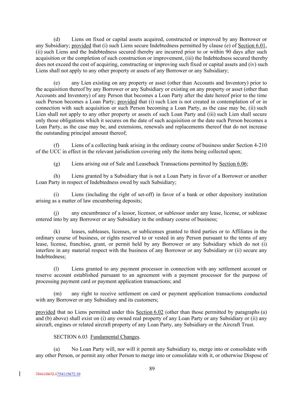 (d) Liens on fixed or capital assets acquired, constructed or improved by any Borrower or any Subsidiary; provided that (i) such Liens secure Indebtedness permitted by clause (e) of Section 6.01, (ii) such Liens and the Indebtedness secured thereby are incurred prior to or within 90 days after such acquisition or the completion of such construction or improvement, (iii) the Indebtedness secured thereby does not exceed the cost of acquiring, constructing or improving such fixed or capital assets and (iv) such Liens shall not apply to any other property or assets of any Borrower or any Subsidiary; (e) any Lien existing on any property or asset (other than Accounts and Inventory) prior to the acquisition thereof by any Borrower or any Subsidiary or existing on any property or asset (other than Accounts and Inventory) of any Person that becomes a Loan Party after the date hereof prior to the time such Person becomes a Loan Party; provided that (i) such Lien is not created in contemplation of or in connection with such acquisition or such Person becoming a Loan Party, as the case may be, (ii) such Lien shall not apply to any other property or assets of such Loan Party and (iii) such Lien shall secure only those obligations which it secures on the date of such acquisition or the date such Person becomes a Loan Party, as the case may be, and extensions, renewals and replacements thereof that do not increase the outstanding principal amount thereof; (f) Liens of a collecting bank arising in the ordinary course of business under Section 4-210 of the UCC in effect in the relevant jurisdiction covering only the items being collected upon; (g) Liens arising out of Sale and Leaseback Transactions permitted by Section 6.06; (h) Liens granted by a Subsidiary that is not a Loan Party in favor of a Borrower or another Loan Party in respect of Indebtedness owed by such Subsidiary; (i) Liens (including the right of set-off) in favor of a bank or other depository institution arising as a matter of law encumbering deposits; (j) any encumbrance of a lessor, licensor, or sublessor under any lease, license, or sublease entered into by any Borrower or any Subsidiary in the ordinary course of business; (k) leases, subleases, licenses, or sublicenses granted to third parties or to Affiliates in the ordinary course of business, or rights reserved to or vested in any Person pursuant to the terms of any lease, license, franchise, grant, or permit held by any Borrower or any Subsidiary which do not (i) interfere in any material respect with the business of any Borrower or any Subsidiary or (ii) secure any Indebtedness; (l) Liens granted to any payment processor in connection with any settlement account or reserve account established pursuant to an agreement with a payment processor for the purpose of processing payment card or payment application transactions; and (m) any right to receive settlement on card or payment application transactions conducted with any Borrower or any Subsidiary and its customers; provided that no Liens permitted under this Section 6.02 (other than those permitted by paragraphs (a) and (b) above) shall exist on (i) any owned real property of any Loan Party or any Subsidiary or (ii) any aircraft, engines or related aircraft property of any Loan Party, any Subsidiary or the Aircraft Trust. SECTION 6.03 Fundamental Changes. (a) No Loan Party will, nor will it permit any Subsidiary to, merge into or consolidate with any other Person, or permit any other Person to merge into or consolidate with it, or otherwise Dispose of 89 754115672.1754115672.10