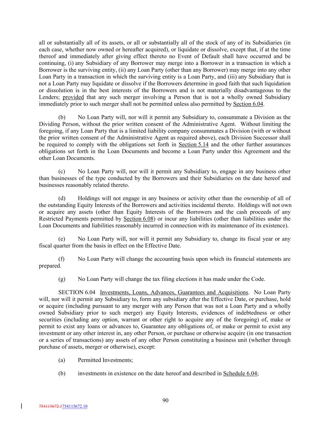 all or substantially all of its assets, or all or substantially all of the stock of any of its Subsidiaries (in each case, whether now owned or hereafter acquired), or liquidate or dissolve, except that, if at the time thereof and immediately after giving effect thereto no Event of Default shall have occurred and be continuing, (i) any Subsidiary of any Borrower may merge into a Borrower in a transaction in which a Borrower is the surviving entity, (ii) any Loan Party (other than any Borrower) may merge into any other Loan Party in a transaction in which the surviving entity is a Loan Party, and (iii) any Subsidiary that is not a Loan Party may liquidate or dissolve if the Borrowers determine in good faith that such liquidation or dissolution is in the best interests of the Borrowers and is not materially disadvantageous to the Lenders; provided that any such merger involving a Person that is not a wholly owned Subsidiary immediately prior to such merger shall not be permitted unless also permitted by Section 6.04. (b) No Loan Party will, nor will it permit any Subsidiary to, consummate a Division as the Dividing Person, without the prior written consent of the Administrative Agent. Without limiting the foregoing, if any Loan Party that is a limited liability company consummates a Division (with or without the prior written consent of the Administrative Agent as required above), each Division Successor shall be required to comply with the obligations set forth in Section 5.14 and the other further assurances obligations set forth in the Loan Documents and become a Loan Party under this Agreement and the other Loan Documents. (c) No Loan Party will, nor will it permit any Subsidiary to, engage in any business other than businesses of the type conducted by the Borrowers and their Subsidiaries on the date hereof and businesses reasonably related thereto. (d) Holdings will not engage in any business or activity other than the ownership of all of the outstanding Equity Interests of the Borrowers and activities incidental thereto. Holdings will not own or acquire any assets (other than Equity Interests of the Borrowers and the cash proceeds of any Restricted Payments permitted by Section 6.08) or incur any liabilities (other than liabilities under the Loan Documents and liabilities reasonably incurred in connection with its maintenance of its existence). (e) No Loan Party will, nor will it permit any Subsidiary to, change its fiscal year or any fiscal quarter from the basis in effect on the Effective Date. (f) No Loan Party will change the accounting basis upon which its financial statements are prepared. (g) No Loan Party will change the tax filing elections it has made under the Code. SECTION 6.04 Investments, Loans, Advances, Guarantees and Acquisitions. No Loan Party will, nor will it permit any Subsidiary to, form any subsidiary after the Effective Date, or purchase, hold or acquire (including pursuant to any merger with any Person that was not a Loan Party and a wholly owned Subsidiary prior to such merger) any Equity Interests, evidences of indebtedness or other securities (including any option, warrant or other right to acquire any of the foregoing) of, make or permit to exist any loans or advances to, Guarantee any obligations of, or make or permit to exist any investment or any other interest in, any other Person, or purchase or otherwise acquire (in one transaction or a series of transactions) any assets of any other Person constituting a business unit (whether through purchase of assets, merger or otherwise), except: (a) Permitted Investments; (b) investments in existence on the date hereof and described in Schedule 6.04; 90 754115672.1754115672.10