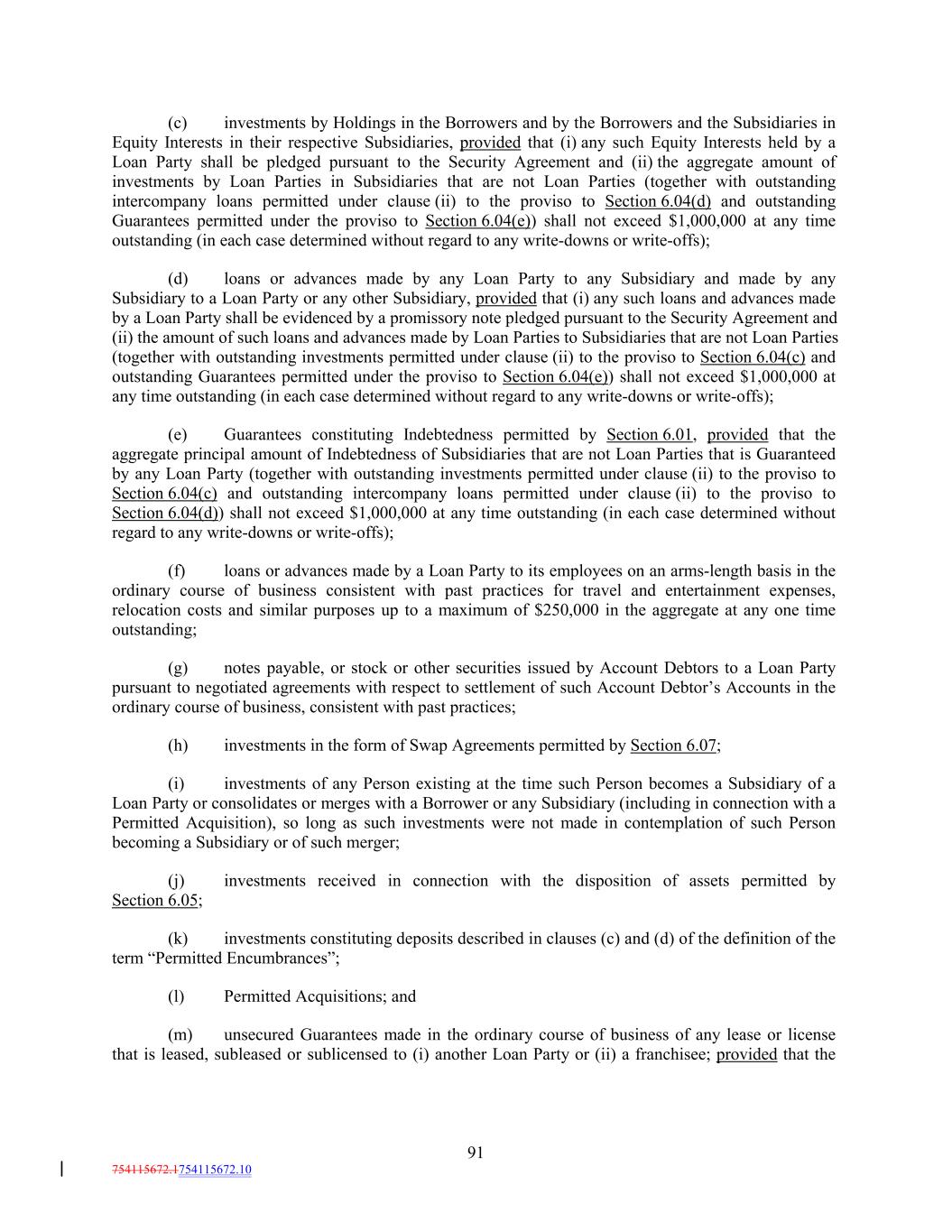 (c) investments by Holdings in the Borrowers and by the Borrowers and the Subsidiaries in Equity Interests in their respective Subsidiaries, provided that (i) any such Equity Interests held by a Loan Party shall be pledged pursuant to the Security Agreement and (ii) the aggregate amount of investments by Loan Parties in Subsidiaries that are not Loan Parties (together with outstanding intercompany loans permitted under clause (ii) to the proviso to Section 6.04(d) and outstanding Guarantees permitted under the proviso to Section 6.04(e)) shall not exceed $1,000,000 at any time outstanding (in each case determined without regard to any write-downs or write-offs); (d) loans or advances made by any Loan Party to any Subsidiary and made by any Subsidiary to a Loan Party or any other Subsidiary, provided that (i) any such loans and advances made by a Loan Party shall be evidenced by a promissory note pledged pursuant to the Security Agreement and (ii) the amount of such loans and advances made by Loan Parties to Subsidiaries that are not Loan Parties (together with outstanding investments permitted under clause (ii) to the proviso to Section 6.04(c) and outstanding Guarantees permitted under the proviso to Section 6.04(e)) shall not exceed $1,000,000 at any time outstanding (in each case determined without regard to any write-downs or write-offs); (e) Guarantees constituting Indebtedness permitted by Section 6.01, provided that the aggregate principal amount of Indebtedness of Subsidiaries that are not Loan Parties that is Guaranteed by any Loan Party (together with outstanding investments permitted under clause (ii) to the proviso to Section 6.04(c) and outstanding intercompany loans permitted under clause (ii) to the proviso to Section 6.04(d)) shall not exceed $1,000,000 at any time outstanding (in each case determined without regard to any write-downs or write-offs); (f) loans or advances made by a Loan Party to its employees on an arms-length basis in the ordinary course of business consistent with past practices for travel and entertainment expenses, relocation costs and similar purposes up to a maximum of $250,000 in the aggregate at any one time outstanding; (g) notes payable, or stock or other securities issued by Account Debtors to a Loan Party pursuant to negotiated agreements with respect to settlement of such Account Debtor’s Accounts in the ordinary course of business, consistent with past practices; (h) investments in the form of Swap Agreements permitted by Section 6.07; (i) investments of any Person existing at the time such Person becomes a Subsidiary of a Loan Party or consolidates or merges with a Borrower or any Subsidiary (including in connection with a Permitted Acquisition), so long as such investments were not made in contemplation of such Person becoming a Subsidiary or of such merger; (j) investments received in connection with the disposition of assets permitted by Section 6.05; (k) investments constituting deposits described in clauses (c) and (d) of the definition of the term “Permitted Encumbrances”; (l) Permitted Acquisitions; and (m) unsecured Guarantees made in the ordinary course of business of any lease or license that is leased, subleased or sublicensed to (i) another Loan Party or (ii) a franchisee; provided that the 91 754115672.1754115672.10