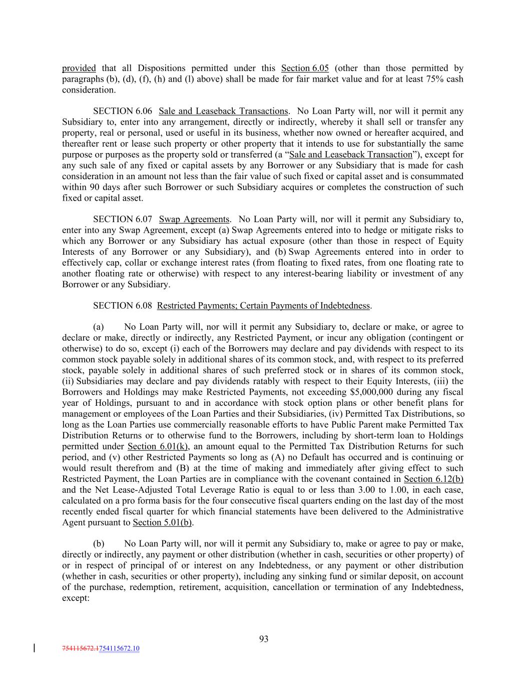 provided that all Dispositions permitted under this Section 6.05 (other than those permitted by paragraphs (b), (d), (f), (h) and (l) above) shall be made for fair market value and for at least 75% cash consideration. SECTION 6.06 Sale and Leaseback Transactions. No Loan Party will, nor will it permit any Subsidiary to, enter into any arrangement, directly or indirectly, whereby it shall sell or transfer any property, real or personal, used or useful in its business, whether now owned or hereafter acquired, and thereafter rent or lease such property or other property that it intends to use for substantially the same purpose or purposes as the property sold or transferred (a “Sale and Leaseback Transaction”), except for any such sale of any fixed or capital assets by any Borrower or any Subsidiary that is made for cash consideration in an amount not less than the fair value of such fixed or capital asset and is consummated within 90 days after such Borrower or such Subsidiary acquires or completes the construction of such fixed or capital asset. SECTION 6.07 Swap Agreements. No Loan Party will, nor will it permit any Subsidiary to, enter into any Swap Agreement, except (a) Swap Agreements entered into to hedge or mitigate risks to which any Borrower or any Subsidiary has actual exposure (other than those in respect of Equity Interests of any Borrower or any Subsidiary), and (b) Swap Agreements entered into in order to effectively cap, collar or exchange interest rates (from floating to fixed rates, from one floating rate to another floating rate or otherwise) with respect to any interest-bearing liability or investment of any Borrower or any Subsidiary. SECTION 6.08 Restricted Payments; Certain Payments of Indebtedness. (a) No Loan Party will, nor will it permit any Subsidiary to, declare or make, or agree to declare or make, directly or indirectly, any Restricted Payment, or incur any obligation (contingent or otherwise) to do so, except (i) each of the Borrowers may declare and pay dividends with respect to its common stock payable solely in additional shares of its common stock, and, with respect to its preferred stock, payable solely in additional shares of such preferred stock or in shares of its common stock, (ii) Subsidiaries may declare and pay dividends ratably with respect to their Equity Interests, (iii) the Borrowers and Holdings may make Restricted Payments, not exceeding $5,000,000 during any fiscal year of Holdings, pursuant to and in accordance with stock option plans or other benefit plans for management or employees of the Loan Parties and their Subsidiaries, (iv) Permitted Tax Distributions, so long as the Loan Parties use commercially reasonable efforts to have Public Parent make Permitted Tax Distribution Returns or to otherwise fund to the Borrowers, including by short-term loan to Holdings permitted under Section 6.01(k), an amount equal to the Permitted Tax Distribution Returns for such period, and (v) other Restricted Payments so long as (A) no Default has occurred and is continuing or would result therefrom and (B) at the time of making and immediately after giving effect to such Restricted Payment, the Loan Parties are in compliance with the covenant contained in Section 6.12(b) and the Net Lease-Adjusted Total Leverage Ratio is equal to or less than 3.00 to 1.00, in each case, calculated on a pro forma basis for the four consecutive fiscal quarters ending on the last day of the most recently ended fiscal quarter for which financial statements have been delivered to the Administrative Agent pursuant to Section 5.01(b). (b) No Loan Party will, nor will it permit any Subsidiary to, make or agree to pay or make, directly or indirectly, any payment or other distribution (whether in cash, securities or other property) of or in respect of principal of or interest on any Indebtedness, or any payment or other distribution (whether in cash, securities or other property), including any sinking fund or similar deposit, on account of the purchase, redemption, retirement, acquisition, cancellation or termination of any Indebtedness, except: 93 754115672.1754115672.10