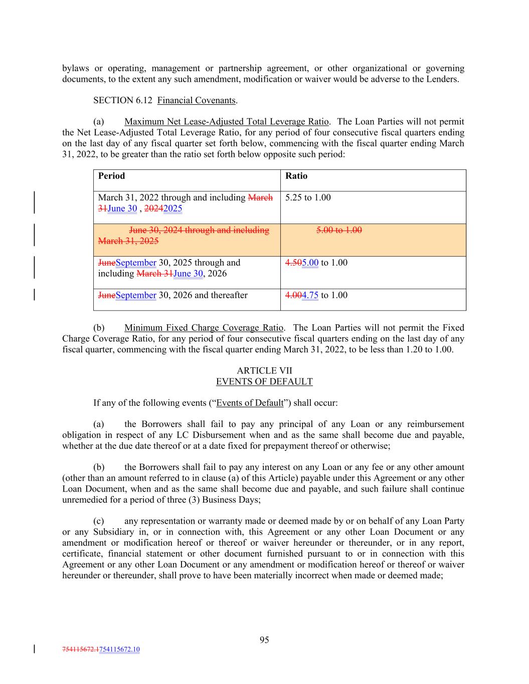 95 754115672.1754115672.10 June 30, 2024 through and including March 31, 2025 Ratio 5.00 to 1.00 bylaws or operating, management or partnership agreement, or other organizational or governing documents, to the extent any such amendment, modification or waiver would be adverse to the Lenders. SECTION 6.12 Financial Covenants. (a) Maximum Net Lease-Adjusted Total Leverage Ratio. The Loan Parties will not permit the Net Lease-Adjusted Total Leverage Ratio, for any period of four consecutive fiscal quarters ending on the last day of any fiscal quarter set forth below, commencing with the fiscal quarter ending March 31, 2022, to be greater than the ratio set forth below opposite such period: JuneSeptember 30, 2025 through and including March 31June 30, 2026 4.505.00 to 1.00 March 31, 2022 through and including March 31June 30 , 20242025 JuneSeptember 30, 2026 and thereafter 5.25 to 1.00 4.004.75 to 1.00 Period (b) Minimum Fixed Charge Coverage Ratio. The Loan Parties will not permit the Fixed Charge Coverage Ratio, for any period of four consecutive fiscal quarters ending on the last day of any fiscal quarter, commencing with the fiscal quarter ending March 31, 2022, to be less than 1.20 to 1.00. ARTICLE VII EVENTS OF DEFAULT If any of the following events (“Events of Default”) shall occur: (a) the Borrowers shall fail to pay any principal of any Loan or any reimbursement obligation in respect of any LC Disbursement when and as the same shall become due and payable, whether at the due date thereof or at a date fixed for prepayment thereof or otherwise; (b) the Borrowers shall fail to pay any interest on any Loan or any fee or any other amount (other than an amount referred to in clause (a) of this Article) payable under this Agreement or any other Loan Document, when and as the same shall become due and payable, and such failure shall continue unremedied for a period of three (3) Business Days; (c) any representation or warranty made or deemed made by or on behalf of any Loan Party or any Subsidiary in, or in connection with, this Agreement or any other Loan Document or any amendment or modification hereof or thereof or waiver hereunder or thereunder, or in any report, certificate, financial statement or other document furnished pursuant to or in connection with this Agreement or any other Loan Document or any amendment or modification hereof or thereof or waiver hereunder or thereunder, shall prove to have been materially incorrect when made or deemed made;