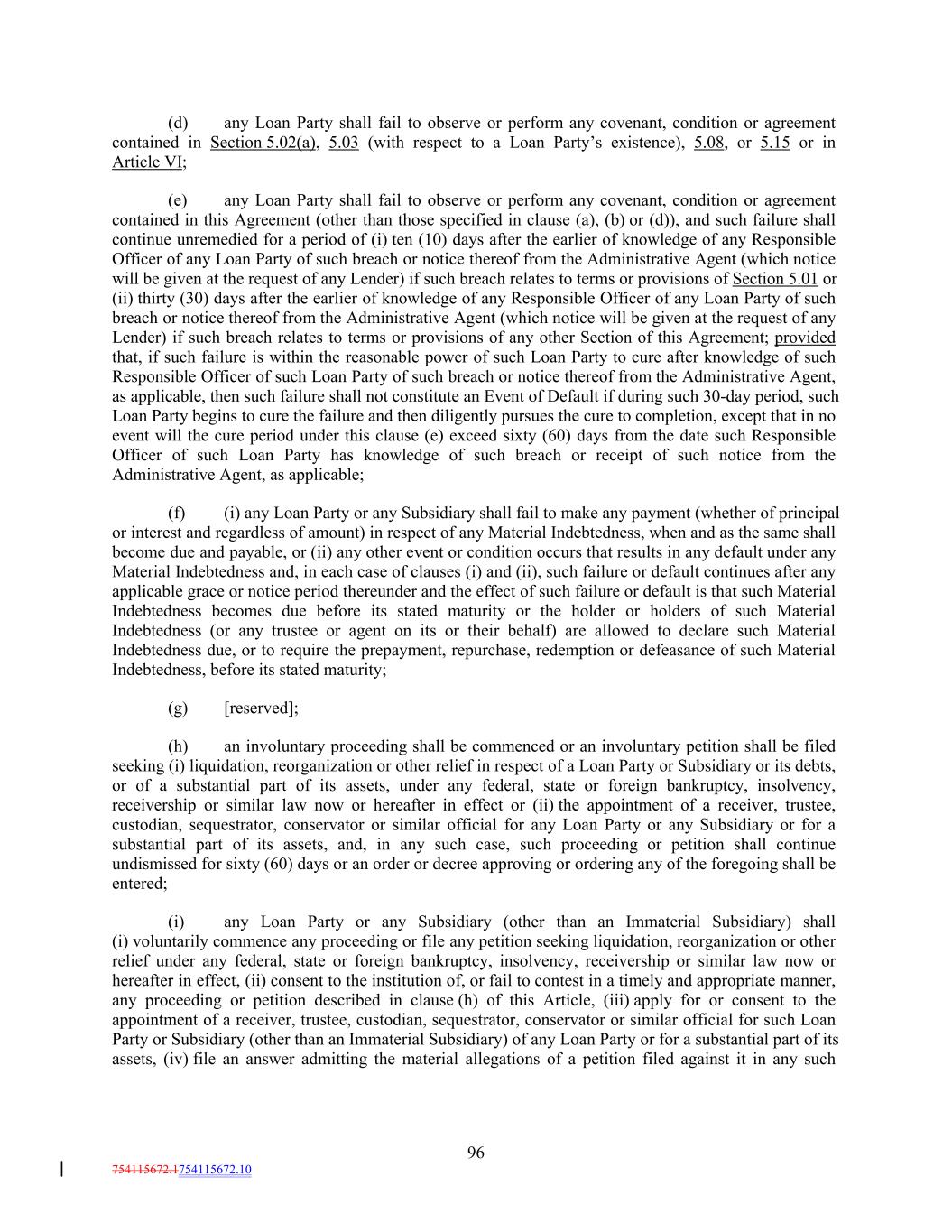 (d) any Loan Party shall fail to observe or perform any covenant, condition or agreement contained in Section 5.02(a), 5.03 (with respect to a Loan Party’s existence), 5.08, or 5.15 or in Article VI; (e) any Loan Party shall fail to observe or perform any covenant, condition or agreement contained in this Agreement (other than those specified in clause (a), (b) or (d)), and such failure shall continue unremedied for a period of (i) ten (10) days after the earlier of knowledge of any Responsible Officer of any Loan Party of such breach or notice thereof from the Administrative Agent (which notice will be given at the request of any Lender) if such breach relates to terms or provisions of Section 5.01 or (ii) thirty (30) days after the earlier of knowledge of any Responsible Officer of any Loan Party of such breach or notice thereof from the Administrative Agent (which notice will be given at the request of any Lender) if such breach relates to terms or provisions of any other Section of this Agreement; provided that, if such failure is within the reasonable power of such Loan Party to cure after knowledge of such Responsible Officer of such Loan Party of such breach or notice thereof from the Administrative Agent, as applicable, then such failure shall not constitute an Event of Default if during such 30-day period, such Loan Party begins to cure the failure and then diligently pursues the cure to completion, except that in no event will the cure period under this clause (e) exceed sixty (60) days from the date such Responsible Officer of such Loan Party has knowledge of such breach or receipt of such notice from the Administrative Agent, as applicable; (f) (i) any Loan Party or any Subsidiary shall fail to make any payment (whether of principal or interest and regardless of amount) in respect of any Material Indebtedness, when and as the same shall become due and payable, or (ii) any other event or condition occurs that results in any default under any Material Indebtedness and, in each case of clauses (i) and (ii), such failure or default continues after any applicable grace or notice period thereunder and the effect of such failure or default is that such Material Indebtedness becomes due before its stated maturity or the holder or holders of such Material Indebtedness (or any trustee or agent on its or their behalf) are allowed to declare such Material Indebtedness due, or to require the prepayment, repurchase, redemption or defeasance of such Material Indebtedness, before its stated maturity; (g) [reserved]; (h) an involuntary proceeding shall be commenced or an involuntary petition shall be filed seeking (i) liquidation, reorganization or other relief in respect of a Loan Party or Subsidiary or its debts, or of a substantial part of its assets, under any federal, state or foreign bankruptcy, insolvency, receivership or similar law now or hereafter in effect or (ii) the appointment of a receiver, trustee, custodian, sequestrator, conservator or similar official for any Loan Party or any Subsidiary or for a substantial part of its assets, and, in any such case, such proceeding or petition shall continue undismissed for sixty (60) days or an order or decree approving or ordering any of the foregoing shall be entered; (i) any Loan Party or any Subsidiary (other than an Immaterial Subsidiary) shall (i) voluntarily commence any proceeding or file any petition seeking liquidation, reorganization or other relief under any federal, state or foreign bankruptcy, insolvency, receivership or similar law now or hereafter in effect, (ii) consent to the institution of, or fail to contest in a timely and appropriate manner, any proceeding or petition described in clause (h) of this Article, (iii) apply for or consent to the appointment of a receiver, trustee, custodian, sequestrator, conservator or similar official for such Loan Party or Subsidiary (other than an Immaterial Subsidiary) of any Loan Party or for a substantial part of its assets, (iv) file an answer admitting the material allegations of a petition filed against it in any such 96 754115672.1754115672.10