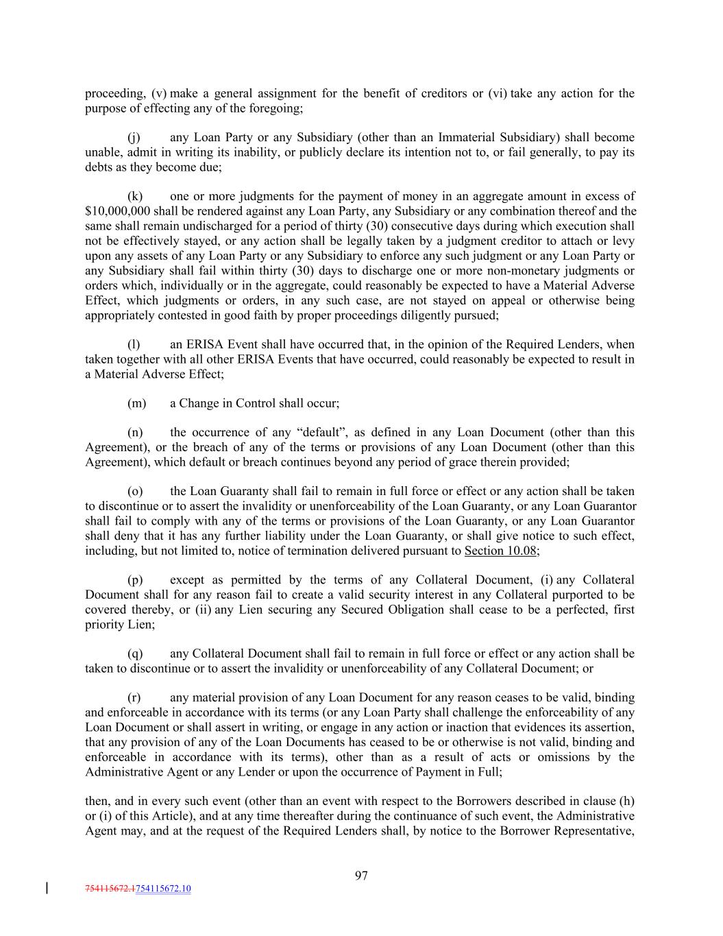 proceeding, (v) make a general assignment for the benefit of creditors or (vi) take any action for the purpose of effecting any of the foregoing; (j) any Loan Party or any Subsidiary (other than an Immaterial Subsidiary) shall become unable, admit in writing its inability, or publicly declare its intention not to, or fail generally, to pay its debts as they become due; (k) one or more judgments for the payment of money in an aggregate amount in excess of $10,000,000 shall be rendered against any Loan Party, any Subsidiary or any combination thereof and the same shall remain undischarged for a period of thirty (30) consecutive days during which execution shall not be effectively stayed, or any action shall be legally taken by a judgment creditor to attach or levy upon any assets of any Loan Party or any Subsidiary to enforce any such judgment or any Loan Party or any Subsidiary shall fail within thirty (30) days to discharge one or more non-monetary judgments or orders which, individually or in the aggregate, could reasonably be expected to have a Material Adverse Effect, which judgments or orders, in any such case, are not stayed on appeal or otherwise being appropriately contested in good faith by proper proceedings diligently pursued; (l) an ERISA Event shall have occurred that, in the opinion of the Required Lenders, when taken together with all other ERISA Events that have occurred, could reasonably be expected to result in a Material Adverse Effect; (m) a Change in Control shall occur; (n) the occurrence of any “default”, as defined in any Loan Document (other than this Agreement), or the breach of any of the terms or provisions of any Loan Document (other than this Agreement), which default or breach continues beyond any period of grace therein provided; (o) the Loan Guaranty shall fail to remain in full force or effect or any action shall be taken to discontinue or to assert the invalidity or unenforceability of the Loan Guaranty, or any Loan Guarantor shall fail to comply with any of the terms or provisions of the Loan Guaranty, or any Loan Guarantor shall deny that it has any further liability under the Loan Guaranty, or shall give notice to such effect, including, but not limited to, notice of termination delivered pursuant to Section 10.08; (p) except as permitted by the terms of any Collateral Document, (i) any Collateral Document shall for any reason fail to create a valid security interest in any Collateral purported to be covered thereby, or (ii) any Lien securing any Secured Obligation shall cease to be a perfected, first priority Lien; (q) any Collateral Document shall fail to remain in full force or effect or any action shall be taken to discontinue or to assert the invalidity or unenforceability of any Collateral Document; or (r) any material provision of any Loan Document for any reason ceases to be valid, binding and enforceable in accordance with its terms (or any Loan Party shall challenge the enforceability of any Loan Document or shall assert in writing, or engage in any action or inaction that evidences its assertion, that any provision of any of the Loan Documents has ceased to be or otherwise is not valid, binding and enforceable in accordance with its terms), other than as a result of acts or omissions by the Administrative Agent or any Lender or upon the occurrence of Payment in Full; then, and in every such event (other than an event with respect to the Borrowers described in clause (h) or (i) of this Article), and at any time thereafter during the continuance of such event, the Administrative Agent may, and at the request of the Required Lenders shall, by notice to the Borrower Representative, 97 754115672.1754115672.10