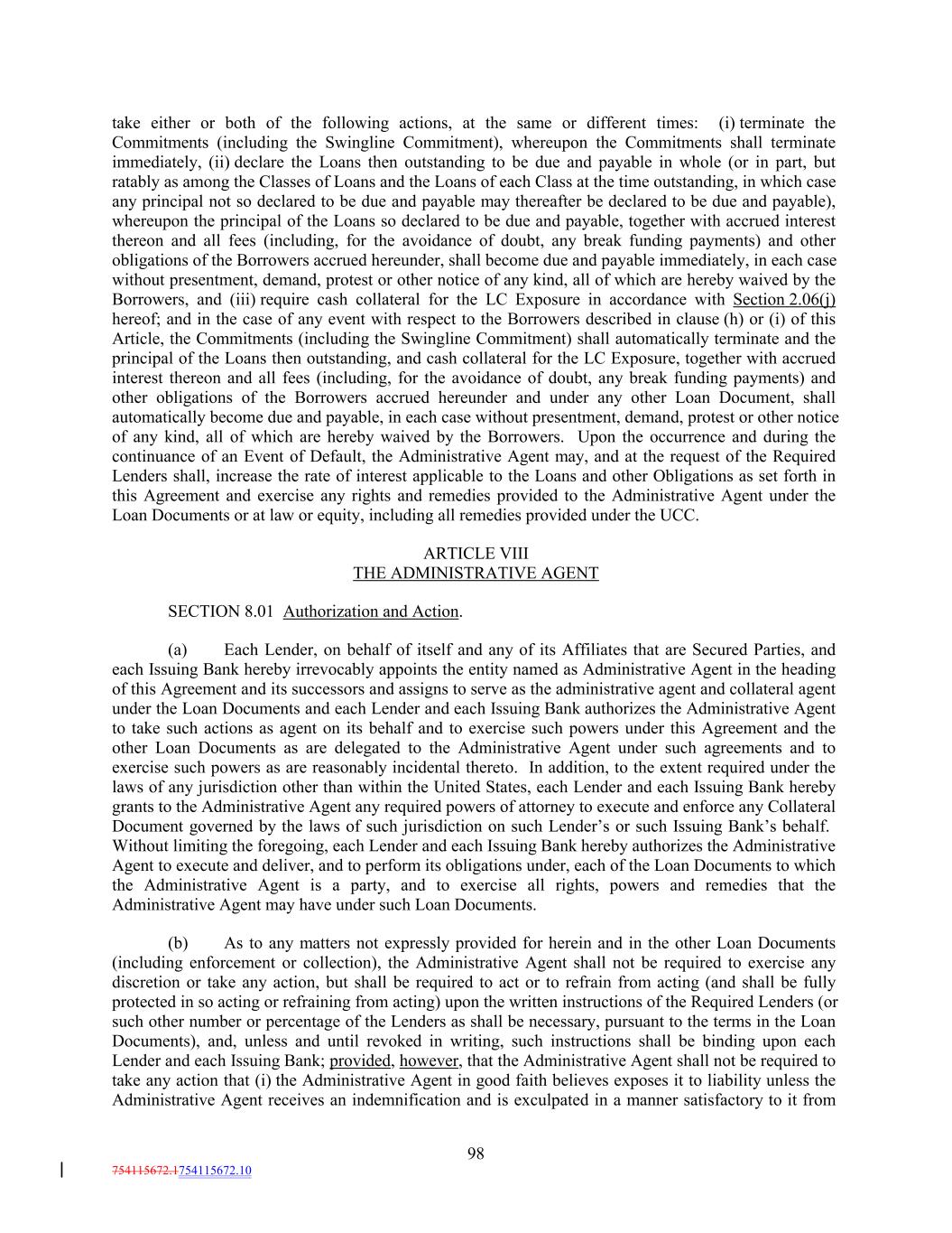 take either or both of the following actions, at the same or different times: (i) terminate the Commitments (including the Swingline Commitment), whereupon the Commitments shall terminate immediately, (ii) declare the Loans then outstanding to be due and payable in whole (or in part, but ratably as among the Classes of Loans and the Loans of each Class at the time outstanding, in which case any principal not so declared to be due and payable may thereafter be declared to be due and payable), whereupon the principal of the Loans so declared to be due and payable, together with accrued interest thereon and all fees (including, for the avoidance of doubt, any break funding payments) and other obligations of the Borrowers accrued hereunder, shall become due and payable immediately, in each case without presentment, demand, protest or other notice of any kind, all of which are hereby waived by the Borrowers, and (iii) require cash collateral for the LC Exposure in accordance with Section 2.06(j) hereof; and in the case of any event with respect to the Borrowers described in clause (h) or (i) of this Article, the Commitments (including the Swingline Commitment) shall automatically terminate and the principal of the Loans then outstanding, and cash collateral for the LC Exposure, together with accrued interest thereon and all fees (including, for the avoidance of doubt, any break funding payments) and other obligations of the Borrowers accrued hereunder and under any other Loan Document, shall automatically become due and payable, in each case without presentment, demand, protest or other notice of any kind, all of which are hereby waived by the Borrowers. Upon the occurrence and during the continuance of an Event of Default, the Administrative Agent may, and at the request of the Required Lenders shall, increase the rate of interest applicable to the Loans and other Obligations as set forth in this Agreement and exercise any rights and remedies provided to the Administrative Agent under the Loan Documents or at law or equity, including all remedies provided under the UCC. ARTICLE VIII THE ADMINISTRATIVE AGENT SECTION 8.01 Authorization and Action. (a) Each Lender, on behalf of itself and any of its Affiliates that are Secured Parties, and each Issuing Bank hereby irrevocably appoints the entity named as Administrative Agent in the heading of this Agreement and its successors and assigns to serve as the administrative agent and collateral agent under the Loan Documents and each Lender and each Issuing Bank authorizes the Administrative Agent to take such actions as agent on its behalf and to exercise such powers under this Agreement and the other Loan Documents as are delegated to the Administrative Agent under such agreements and to exercise such powers as are reasonably incidental thereto. In addition, to the extent required under the laws of any jurisdiction other than within the United States, each Lender and each Issuing Bank hereby grants to the Administrative Agent any required powers of attorney to execute and enforce any Collateral Document governed by the laws of such jurisdiction on such Lender’s or such Issuing Bank’s behalf. Without limiting the foregoing, each Lender and each Issuing Bank hereby authorizes the Administrative Agent to execute and deliver, and to perform its obligations under, each of the Loan Documents to which the Administrative Agent is a party, and to exercise all rights, powers and remedies that the Administrative Agent may have under such Loan Documents. (b) As to any matters not expressly provided for herein and in the other Loan Documents (including enforcement or collection), the Administrative Agent shall not be required to exercise any discretion or take any action, but shall be required to act or to refrain from acting (and shall be fully protected in so acting or refraining from acting) upon the written instructions of the Required Lenders (or such other number or percentage of the Lenders as shall be necessary, pursuant to the terms in the Loan Documents), and, unless and until revoked in writing, such instructions shall be binding upon each Lender and each Issuing Bank; provided, however, that the Administrative Agent shall not be required to take any action that (i) the Administrative Agent in good faith believes exposes it to liability unless the Administrative Agent receives an indemnification and is exculpated in a manner satisfactory to it from 98 754115672.1754115672.10