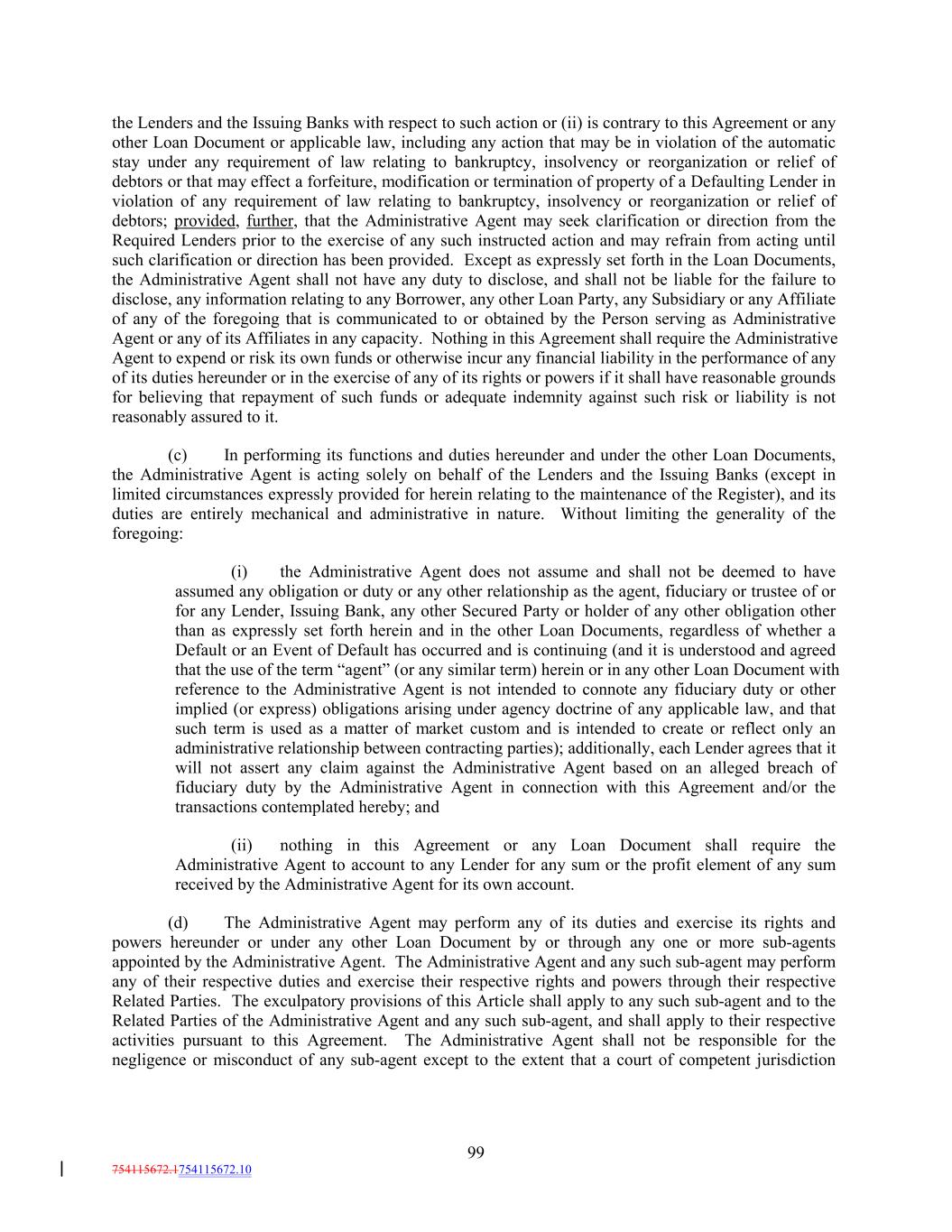 the Lenders and the Issuing Banks with respect to such action or (ii) is contrary to this Agreement or any other Loan Document or applicable law, including any action that may be in violation of the automatic stay under any requirement of law relating to bankruptcy, insolvency or reorganization or relief of debtors or that may effect a forfeiture, modification or termination of property of a Defaulting Lender in violation of any requirement of law relating to bankruptcy, insolvency or reorganization or relief of debtors; provided, further, that the Administrative Agent may seek clarification or direction from the Required Lenders prior to the exercise of any such instructed action and may refrain from acting until such clarification or direction has been provided. Except as expressly set forth in the Loan Documents, the Administrative Agent shall not have any duty to disclose, and shall not be liable for the failure to disclose, any information relating to any Borrower, any other Loan Party, any Subsidiary or any Affiliate of any of the foregoing that is communicated to or obtained by the Person serving as Administrative Agent or any of its Affiliates in any capacity. Nothing in this Agreement shall require the Administrative Agent to expend or risk its own funds or otherwise incur any financial liability in the performance of any of its duties hereunder or in the exercise of any of its rights or powers if it shall have reasonable grounds for believing that repayment of such funds or adequate indemnity against such risk or liability is not reasonably assured to it. (c) In performing its functions and duties hereunder and under the other Loan Documents, the Administrative Agent is acting solely on behalf of the Lenders and the Issuing Banks (except in limited circumstances expressly provided for herein relating to the maintenance of the Register), and its duties are entirely mechanical and administrative in nature. Without limiting the generality of the foregoing: (i) the Administrative Agent does not assume and shall not be deemed to have assumed any obligation or duty or any other relationship as the agent, fiduciary or trustee of or for any Lender, Issuing Bank, any other Secured Party or holder of any other obligation other than as expressly set forth herein and in the other Loan Documents, regardless of whether a Default or an Event of Default has occurred and is continuing (and it is understood and agreed that the use of the term “agent” (or any similar term) herein or in any other Loan Document with reference to the Administrative Agent is not intended to connote any fiduciary duty or other implied (or express) obligations arising under agency doctrine of any applicable law, and that such term is used as a matter of market custom and is intended to create or reflect only an administrative relationship between contracting parties); additionally, each Lender agrees that it will not assert any claim against the Administrative Agent based on an alleged breach of fiduciary duty by the Administrative Agent in connection with this Agreement and/or the transactions contemplated hereby; and (ii) nothing in this Agreement or any Loan Document shall require the Administrative Agent to account to any Lender for any sum or the profit element of any sum received by the Administrative Agent for its own account. (d) The Administrative Agent may perform any of its duties and exercise its rights and powers hereunder or under any other Loan Document by or through any one or more sub-agents appointed by the Administrative Agent. The Administrative Agent and any such sub-agent may perform any of their respective duties and exercise their respective rights and powers through their respective Related Parties. The exculpatory provisions of this Article shall apply to any such sub-agent and to the Related Parties of the Administrative Agent and any such sub-agent, and shall apply to their respective activities pursuant to this Agreement. The Administrative Agent shall not be responsible for the negligence or misconduct of any sub-agent except to the extent that a court of competent jurisdiction 99 754115672.1754115672.10