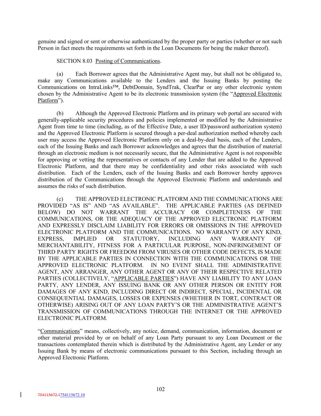 genuine and signed or sent or otherwise authenticated by the proper party or parties (whether or not such Person in fact meets the requirements set forth in the Loan Documents for being the maker thereof). SECTION 8.03 Posting of Communications. (a) Each Borrower agrees that the Administrative Agent may, but shall not be obligated to, make any Communications available to the Lenders and the Issuing Banks by posting the Communications on IntraLinks™, DebtDomain, SyndTrak, ClearPar or any other electronic system chosen by the Administrative Agent to be its electronic transmission system (the “Approved Electronic Platform”). (b) Although the Approved Electronic Platform and its primary web portal are secured with generally-applicable security procedures and policies implemented or modified by the Administrative Agent from time to time (including, as of the Effective Date, a user ID/password authorization system) and the Approved Electronic Platform is secured through a per-deal authorization method whereby each user may access the Approved Electronic Platform only on a deal-by-deal basis, each of the Lenders, each of the Issuing Banks and each Borrower acknowledges and agrees that the distribution of material through an electronic medium is not necessarily secure, that the Administrative Agent is not responsible for approving or vetting the representatives or contacts of any Lender that are added to the Approved Electronic Platform, and that there may be confidentiality and other risks associated with such distribution. Each of the Lenders, each of the Issuing Banks and each Borrower hereby approves distribution of the Communications through the Approved Electronic Platform and understands and assumes the risks of such distribution. (c) THE APPROVED ELECTRONIC PLATFORM AND THE COMMUNICATIONS ARE PROVIDED “AS IS” AND “AS AVAILABLE”. THE APPLICABLE PARTIES (AS DEFINED BELOW) DO NOT WARRANT THE ACCURACY OR COMPLETENESS OF THE COMMUNICATIONS, OR THE ADEQUACY OF THE APPROVED ELECTRONIC PLATFORM AND EXPRESSLY DISCLAIM LIABILITY FOR ERRORS OR OMISSIONS IN THE APPROVED ELECTRONIC PLATFORM AND THE COMMUNICATIONS. NO WARRANTY OF ANY KIND, EXPRESS, IMPLIED OR STATUTORY, INCLUDING ANY WARRANTY OF MERCHANTABILITY, FITNESS FOR A PARTICULAR PURPOSE, NON-INFRINGEMENT OF THIRD PARTY RIGHTS OR FREEDOM FROM VIRUSES OR OTHER CODE DEFECTS, IS MADE BY THE APPLICABLE PARTIES IN CONNECTION WITH THE COMMUNICATIONS OR THE APPROVED ELECTRONIC PLATFORM. IN NO EVENT SHALL THE ADMINISTRATIVE AGENT, ANY ARRANGER, ANY OTHER AGENT OR ANY OF THEIR RESPECTIVE RELATED PARTIES (COLLECTIVELY, “APPLICABLE PARTIES”) HAVE ANY LIABILITY TO ANY LOAN PARTY, ANY LENDER, ANY ISSUING BANK OR ANY OTHER PERSON OR ENTITY FOR DAMAGES OF ANY KIND, INCLUDING DIRECT OR INDIRECT, SPECIAL, INCIDENTAL OR CONSEQUENTIAL DAMAGES, LOSSES OR EXPENSES (WHETHER IN TORT, CONTRACT OR OTHERWISE) ARISING OUT OF ANY LOAN PARTY’S OR THE ADMINISTRATIVE AGENT’S TRANSMISSION OF COMMUNICATIONS THROUGH THE INTERNET OR THE APPROVED ELECTRONIC PLATFORM. “Communications” means, collectively, any notice, demand, communication, information, document or other material provided by or on behalf of any Loan Party pursuant to any Loan Document or the transactions contemplated therein which is distributed by the Administrative Agent, any Lender or any Issuing Bank by means of electronic communications pursuant to this Section, including through an Approved Electronic Platform. 102 754115672.1754115672.10