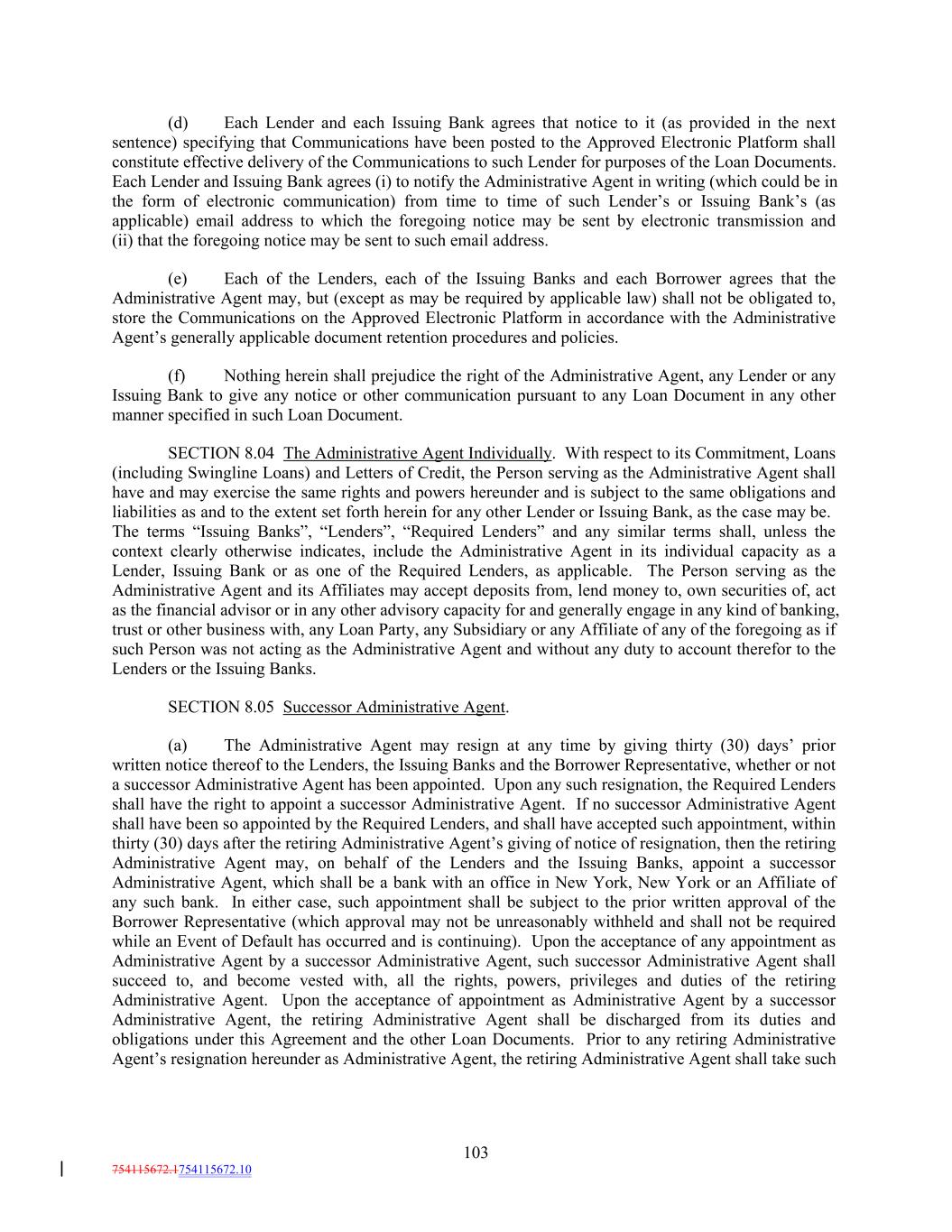 (d) Each Lender and each Issuing Bank agrees that notice to it (as provided in the next sentence) specifying that Communications have been posted to the Approved Electronic Platform shall constitute effective delivery of the Communications to such Lender for purposes of the Loan Documents. Each Lender and Issuing Bank agrees (i) to notify the Administrative Agent in writing (which could be in the form of electronic communication) from time to time of such Lender’s or Issuing Bank’s (as applicable) email address to which the foregoing notice may be sent by electronic transmission and (ii) that the foregoing notice may be sent to such email address. (e) Each of the Lenders, each of the Issuing Banks and each Borrower agrees that the Administrative Agent may, but (except as may be required by applicable law) shall not be obligated to, store the Communications on the Approved Electronic Platform in accordance with the Administrative Agent’s generally applicable document retention procedures and policies. (f) Nothing herein shall prejudice the right of the Administrative Agent, any Lender or any Issuing Bank to give any notice or other communication pursuant to any Loan Document in any other manner specified in such Loan Document. SECTION 8.04 The Administrative Agent Individually. With respect to its Commitment, Loans (including Swingline Loans) and Letters of Credit, the Person serving as the Administrative Agent shall have and may exercise the same rights and powers hereunder and is subject to the same obligations and liabilities as and to the extent set forth herein for any other Lender or Issuing Bank, as the case may be. The terms “Issuing Banks”, “Lenders”, “Required Lenders” and any similar terms shall, unless the context clearly otherwise indicates, include the Administrative Agent in its individual capacity as a Lender, Issuing Bank or as one of the Required Lenders, as applicable. The Person serving as the Administrative Agent and its Affiliates may accept deposits from, lend money to, own securities of, act as the financial advisor or in any other advisory capacity for and generally engage in any kind of banking, trust or other business with, any Loan Party, any Subsidiary or any Affiliate of any of the foregoing as if such Person was not acting as the Administrative Agent and without any duty to account therefor to the Lenders or the Issuing Banks. SECTION 8.05 Successor Administrative Agent. (a) The Administrative Agent may resign at any time by giving thirty (30) days’ prior written notice thereof to the Lenders, the Issuing Banks and the Borrower Representative, whether or not a successor Administrative Agent has been appointed. Upon any such resignation, the Required Lenders shall have the right to appoint a successor Administrative Agent. If no successor Administrative Agent shall have been so appointed by the Required Lenders, and shall have accepted such appointment, within thirty (30) days after the retiring Administrative Agent’s giving of notice of resignation, then the retiring Administrative Agent may, on behalf of the Lenders and the Issuing Banks, appoint a successor Administrative Agent, which shall be a bank with an office in New York, New York or an Affiliate of any such bank. In either case, such appointment shall be subject to the prior written approval of the Borrower Representative (which approval may not be unreasonably withheld and shall not be required while an Event of Default has occurred and is continuing). Upon the acceptance of any appointment as Administrative Agent by a successor Administrative Agent, such successor Administrative Agent shall succeed to, and become vested with, all the rights, powers, privileges and duties of the retiring Administrative Agent. Upon the acceptance of appointment as Administrative Agent by a successor Administrative Agent, the retiring Administrative Agent shall be discharged from its duties and obligations under this Agreement and the other Loan Documents. Prior to any retiring Administrative Agent’s resignation hereunder as Administrative Agent, the retiring Administrative Agent shall take such 103 754115672.1754115672.10