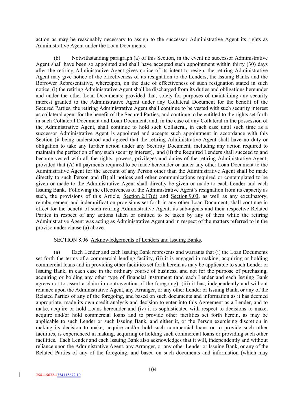 action as may be reasonably necessary to assign to the successor Administrative Agent its rights as Administrative Agent under the Loan Documents. (b) Notwithstanding paragraph (a) of this Section, in the event no successor Administrative Agent shall have been so appointed and shall have accepted such appointment within thirty (30) days after the retiring Administrative Agent gives notice of its intent to resign, the retiring Administrative Agent may give notice of the effectiveness of its resignation to the Lenders, the Issuing Banks and the Borrower Representative, whereupon, on the date of effectiveness of such resignation stated in such notice, (i) the retiring Administrative Agent shall be discharged from its duties and obligations hereunder and under the other Loan Documents; provided that, solely for purposes of maintaining any security interest granted to the Administrative Agent under any Collateral Document for the benefit of the Secured Parties, the retiring Administrative Agent shall continue to be vested with such security interest as collateral agent for the benefit of the Secured Parties, and continue to be entitled to the rights set forth in such Collateral Document and Loan Document, and, in the case of any Collateral in the possession of the Administrative Agent, shall continue to hold such Collateral, in each case until such time as a successor Administrative Agent is appointed and accepts such appointment in accordance with this Section (it being understood and agreed that the retiring Administrative Agent shall have no duty or obligation to take any further action under any Security Document, including any action required to maintain the perfection of any such security interest), and (ii) the Required Lenders shall succeed to and become vested with all the rights, powers, privileges and duties of the retiring Administrative Agent; provided that (A) all payments required to be made hereunder or under any other Loan Document to the Administrative Agent for the account of any Person other than the Administrative Agent shall be made directly to such Person and (B) all notices and other communications required or contemplated to be given or made to the Administrative Agent shall directly be given or made to each Lender and each Issuing Bank. Following the effectiveness of the Administrative Agent’s resignation from its capacity as such, the provisions of this Article, Section 2.17(d) and Section 9.03, as well as any exculpatory, reimbursement and indemnification provisions set forth in any other Loan Document, shall continue in effect for the benefit of such retiring Administrative Agent, its sub-agents and their respective Related Parties in respect of any actions taken or omitted to be taken by any of them while the retiring Administrative Agent was acting as Administrative Agent and in respect of the matters referred to in the proviso under clause (a) above. SECTION 8.06 Acknowledgements of Lenders and Issuing Banks. (a) Each Lender and each Issuing Bank represents and warrants that (i) the Loan Documents set forth the terms of a commercial lending facility, (ii) it is engaged in making, acquiring or holding commercial loans and in providing other facilities set forth herein as may be applicable to such Lender or Issuing Bank, in each case in the ordinary course of business, and not for the purpose of purchasing, acquiring or holding any other type of financial instrument (and each Lender and each Issuing Bank agrees not to assert a claim in contravention of the foregoing), (iii) it has, independently and without reliance upon the Administrative Agent, any Arranger, or any other Lender or Issuing Bank, or any of the Related Parties of any of the foregoing, and based on such documents and information as it has deemed appropriate, made its own credit analysis and decision to enter into this Agreement as a Lender, and to make, acquire or hold Loans hereunder and (iv) it is sophisticated with respect to decisions to make, acquire and/or hold commercial loans and to provide other facilities set forth herein, as may be applicable to such Lender or such Issuing Bank, and either it, or the Person exercising discretion in making its decision to make, acquire and/or hold such commercial loans or to provide such other facilities, is experienced in making, acquiring or holding such commercial loans or providing such other facilities. Each Lender and each Issuing Bank also acknowledges that it will, independently and without reliance upon the Administrative Agent, any Arranger, or any other Lender or Issuing Bank, or any of the Related Parties of any of the foregoing, and based on such documents and information (which may 104 754115672.1754115672.10