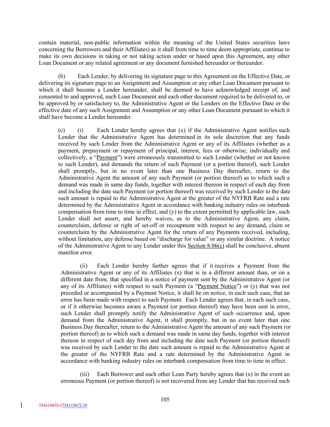 contain material, non-public information within the meaning of the United States securities laws concerning the Borrowers and their Affiliates) as it shall from time to time deem appropriate, continue to make its own decisions in taking or not taking action under or based upon this Agreement, any other Loan Document or any related agreement or any document furnished hereunder or thereunder. (b) Each Lender, by delivering its signature page to this Agreement on the Effective Date, or delivering its signature page to an Assignment and Assumption or any other Loan Document pursuant to which it shall become a Lender hereunder, shall be deemed to have acknowledged receipt of, and consented to and approved, each Loan Document and each other document required to be delivered to, or be approved by or satisfactory to, the Administrative Agent or the Lenders on the Effective Date or the effective date of any such Assignment and Assumption or any other Loan Document pursuant to which it shall have become a Lender hereunder. (c) (i) Each Lender hereby agrees that (x) if the Administrative Agent notifies such Lender that the Administrative Agent has determined in its sole discretion that any funds received by such Lender from the Administrative Agent or any of its Affiliates (whether as a payment, prepayment or repayment of principal, interest, fees or otherwise; individually and collectively, a “Payment”) were erroneously transmitted to such Lender (whether or not known to such Lender), and demands the return of such Payment (or a portion thereof), such Lender shall promptly, but in no event later than one Business Day thereafter, return to the Administrative Agent the amount of any such Payment (or portion thereof) as to which such a demand was made in same day funds, together with interest thereon in respect of each day from and including the date such Payment (or portion thereof) was received by such Lender to the date such amount is repaid to the Administrative Agent at the greater of the NYFRB Rate and a rate determined by the Administrative Agent in accordance with banking industry rules on interbank compensation from time to time in effect, and (y) to the extent permitted by applicable law, such Lender shall not assert, and hereby waives, as to the Administrative Agent, any claim, counterclaim, defense or right of set-off or recoupment with respect to any demand, claim or counterclaim by the Administrative Agent for the return of any Payments received, including, without limitation, any defense based on “discharge for value” or any similar doctrine. A notice of the Administrative Agent to any Lender under this Section 8.06(c) shall be conclusive, absent manifest error. (ii) Each Lender hereby further agrees that if it receives a Payment from the Administrative Agent or any of its Affiliates (x) that is in a different amount than, or on a different date from, that specified in a notice of payment sent by the Administrative Agent (or any of its Affiliates) with respect to such Payment (a “Payment Notice”) or (y) that was not preceded or accompanied by a Payment Notice, it shall be on notice, in each such case, that an error has been made with respect to such Payment. Each Lender agrees that, in each such case, or if it otherwise becomes aware a Payment (or portion thereof) may have been sent in error, such Lender shall promptly notify the Administrative Agent of such occurrence and, upon demand from the Administrative Agent, it shall promptly, but in no event later than one Business Day thereafter, return to the Administrative Agent the amount of any such Payment (or portion thereof) as to which such a demand was made in same day funds, together with interest thereon in respect of each day from and including the date such Payment (or portion thereof) was received by such Lender to the date such amount is repaid to the Administrative Agent at the greater of the NYFRB Rate and a rate determined by the Administrative Agent in accordance with banking industry rules on interbank compensation from time to time in effect. (iii) Each Borrower and each other Loan Party hereby agrees that (x) in the event an erroneous Payment (or portion thereof) is not recovered from any Lender that has received such 105 754115672.1754115672.10