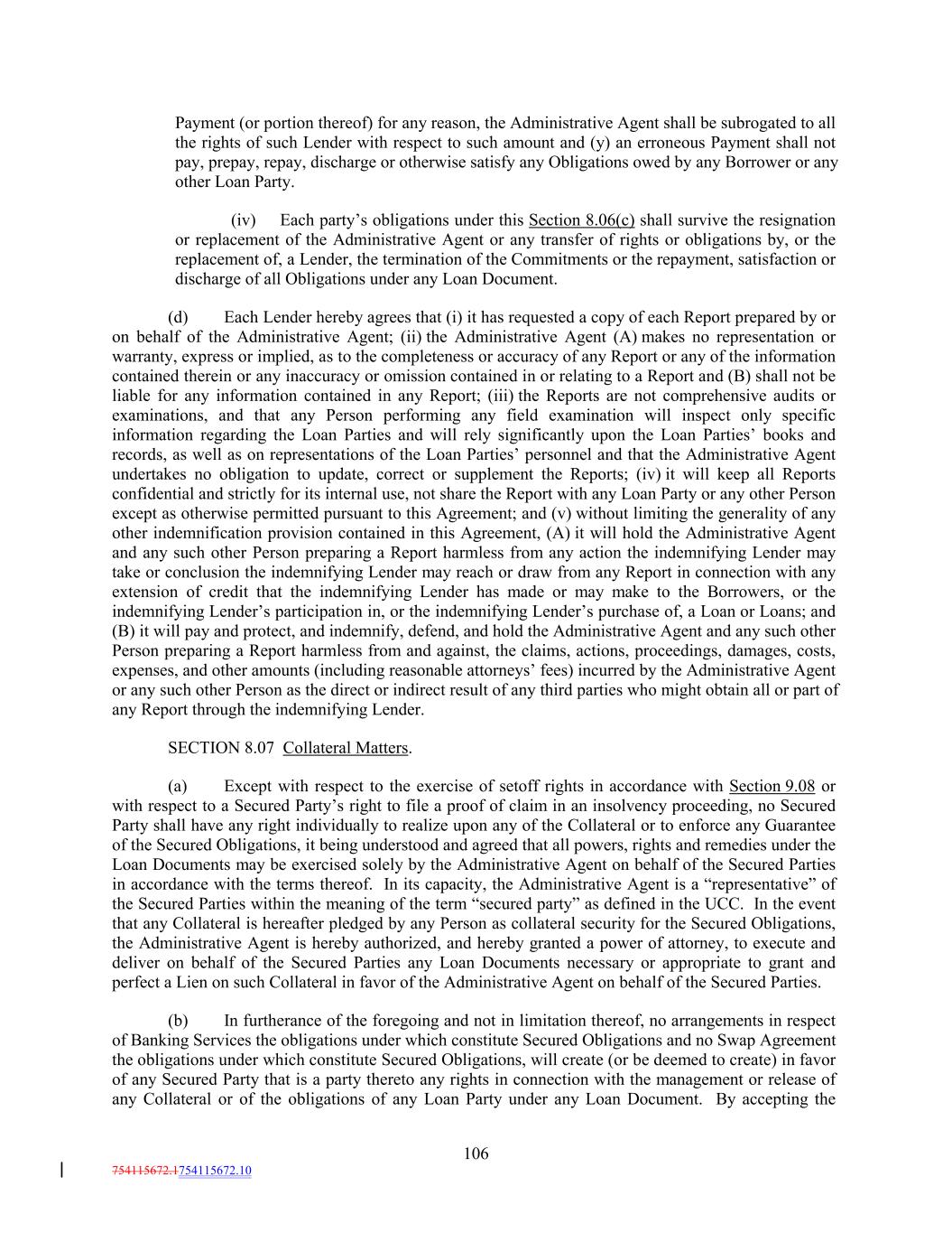 Payment (or portion thereof) for any reason, the Administrative Agent shall be subrogated to all the rights of such Lender with respect to such amount and (y) an erroneous Payment shall not pay, prepay, repay, discharge or otherwise satisfy any Obligations owed by any Borrower or any other Loan Party. (iv) Each party’s obligations under this Section 8.06(c) shall survive the resignation or replacement of the Administrative Agent or any transfer of rights or obligations by, or the replacement of, a Lender, the termination of the Commitments or the repayment, satisfaction or discharge of all Obligations under any Loan Document. (d) Each Lender hereby agrees that (i) it has requested a copy of each Report prepared by or on behalf of the Administrative Agent; (ii) the Administrative Agent (A) makes no representation or warranty, express or implied, as to the completeness or accuracy of any Report or any of the information contained therein or any inaccuracy or omission contained in or relating to a Report and (B) shall not be liable for any information contained in any Report; (iii) the Reports are not comprehensive audits or examinations, and that any Person performing any field examination will inspect only specific information regarding the Loan Parties and will rely significantly upon the Loan Parties’ books and records, as well as on representations of the Loan Parties’ personnel and that the Administrative Agent undertakes no obligation to update, correct or supplement the Reports; (iv) it will keep all Reports confidential and strictly for its internal use, not share the Report with any Loan Party or any other Person except as otherwise permitted pursuant to this Agreement; and (v) without limiting the generality of any other indemnification provision contained in this Agreement, (A) it will hold the Administrative Agent and any such other Person preparing a Report harmless from any action the indemnifying Lender may take or conclusion the indemnifying Lender may reach or draw from any Report in connection with any extension of credit that the indemnifying Lender has made or may make to the Borrowers, or the indemnifying Lender’s participation in, or the indemnifying Lender’s purchase of, a Loan or Loans; and (B) it will pay and protect, and indemnify, defend, and hold the Administrative Agent and any such other Person preparing a Report harmless from and against, the claims, actions, proceedings, damages, costs, expenses, and other amounts (including reasonable attorneys’ fees) incurred by the Administrative Agent or any such other Person as the direct or indirect result of any third parties who might obtain all or part of any Report through the indemnifying Lender. SECTION 8.07 Collateral Matters. (a) Except with respect to the exercise of setoff rights in accordance with Section 9.08 or with respect to a Secured Party’s right to file a proof of claim in an insolvency proceeding, no Secured Party shall have any right individually to realize upon any of the Collateral or to enforce any Guarantee of the Secured Obligations, it being understood and agreed that all powers, rights and remedies under the Loan Documents may be exercised solely by the Administrative Agent on behalf of the Secured Parties in accordance with the terms thereof. In its capacity, the Administrative Agent is a “representative” of the Secured Parties within the meaning of the term “secured party” as defined in the UCC. In the event that any Collateral is hereafter pledged by any Person as collateral security for the Secured Obligations, the Administrative Agent is hereby authorized, and hereby granted a power of attorney, to execute and deliver on behalf of the Secured Parties any Loan Documents necessary or appropriate to grant and perfect a Lien on such Collateral in favor of the Administrative Agent on behalf of the Secured Parties. (b) In furtherance of the foregoing and not in limitation thereof, no arrangements in respect of Banking Services the obligations under which constitute Secured Obligations and no Swap Agreement the obligations under which constitute Secured Obligations, will create (or be deemed to create) in favor of any Secured Party that is a party thereto any rights in connection with the management or release of any Collateral or of the obligations of any Loan Party under any Loan Document. By accepting the 106 754115672.1754115672.10