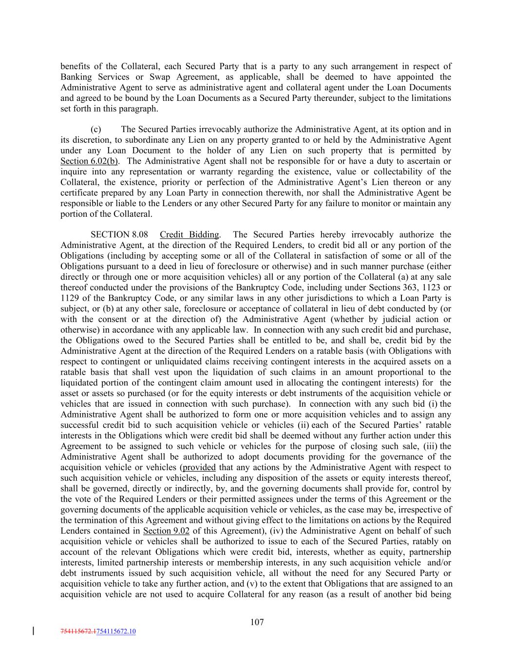 benefits of the Collateral, each Secured Party that is a party to any such arrangement in respect of Banking Services or Swap Agreement, as applicable, shall be deemed to have appointed the Administrative Agent to serve as administrative agent and collateral agent under the Loan Documents and agreed to be bound by the Loan Documents as a Secured Party thereunder, subject to the limitations set forth in this paragraph. (c) The Secured Parties irrevocably authorize the Administrative Agent, at its option and in its discretion, to subordinate any Lien on any property granted to or held by the Administrative Agent under any Loan Document to the holder of any Lien on such property that is permitted by Section 6.02(b). The Administrative Agent shall not be responsible for or have a duty to ascertain or inquire into any representation or warranty regarding the existence, value or collectability of the Collateral, the existence, priority or perfection of the Administrative Agent’s Lien thereon or any certificate prepared by any Loan Party in connection therewith, nor shall the Administrative Agent be responsible or liable to the Lenders or any other Secured Party for any failure to monitor or maintain any portion of the Collateral. SECTION 8.08 Credit Bidding. The Secured Parties hereby irrevocably authorize the Administrative Agent, at the direction of the Required Lenders, to credit bid all or any portion of the Obligations (including by accepting some or all of the Collateral in satisfaction of some or all of the Obligations pursuant to a deed in lieu of foreclosure or otherwise) and in such manner purchase (either directly or through one or more acquisition vehicles) all or any portion of the Collateral (a) at any sale thereof conducted under the provisions of the Bankruptcy Code, including under Sections 363, 1123 or 1129 of the Bankruptcy Code, or any similar laws in any other jurisdictions to which a Loan Party is subject, or (b) at any other sale, foreclosure or acceptance of collateral in lieu of debt conducted by (or with the consent or at the direction of) the Administrative Agent (whether by judicial action or otherwise) in accordance with any applicable law. In connection with any such credit bid and purchase, the Obligations owed to the Secured Parties shall be entitled to be, and shall be, credit bid by the Administrative Agent at the direction of the Required Lenders on a ratable basis (with Obligations with respect to contingent or unliquidated claims receiving contingent interests in the acquired assets on a ratable basis that shall vest upon the liquidation of such claims in an amount proportional to the liquidated portion of the contingent claim amount used in allocating the contingent interests) for the asset or assets so purchased (or for the equity interests or debt instruments of the acquisition vehicle or vehicles that are issued in connection with such purchase). In connection with any such bid (i) the Administrative Agent shall be authorized to form one or more acquisition vehicles and to assign any successful credit bid to such acquisition vehicle or vehicles (ii) each of the Secured Parties’ ratable interests in the Obligations which were credit bid shall be deemed without any further action under this Agreement to be assigned to such vehicle or vehicles for the purpose of closing such sale, (iii) the Administrative Agent shall be authorized to adopt documents providing for the governance of the acquisition vehicle or vehicles (provided that any actions by the Administrative Agent with respect to such acquisition vehicle or vehicles, including any disposition of the assets or equity interests thereof, shall be governed, directly or indirectly, by, and the governing documents shall provide for, control by the vote of the Required Lenders or their permitted assignees under the terms of this Agreement or the governing documents of the applicable acquisition vehicle or vehicles, as the case may be, irrespective of the termination of this Agreement and without giving effect to the limitations on actions by the Required Lenders contained in Section 9.02 of this Agreement), (iv) the Administrative Agent on behalf of such acquisition vehicle or vehicles shall be authorized to issue to each of the Secured Parties, ratably on account of the relevant Obligations which were credit bid, interests, whether as equity, partnership interests, limited partnership interests or membership interests, in any such acquisition vehicle and/or debt instruments issued by such acquisition vehicle, all without the need for any Secured Party or acquisition vehicle to take any further action, and (v) to the extent that Obligations that are assigned to an acquisition vehicle are not used to acquire Collateral for any reason (as a result of another bid being 107 754115672.1754115672.10