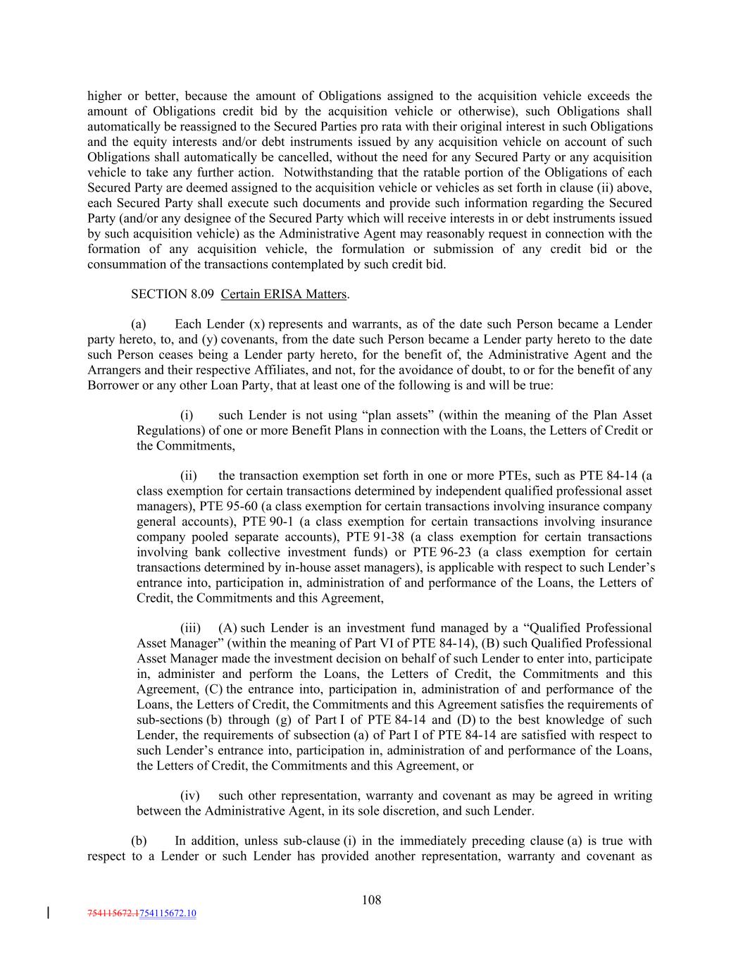 higher or better, because the amount of Obligations assigned to the acquisition vehicle exceeds the amount of Obligations credit bid by the acquisition vehicle or otherwise), such Obligations shall automatically be reassigned to the Secured Parties pro rata with their original interest in such Obligations and the equity interests and/or debt instruments issued by any acquisition vehicle on account of such Obligations shall automatically be cancelled, without the need for any Secured Party or any acquisition vehicle to take any further action. Notwithstanding that the ratable portion of the Obligations of each Secured Party are deemed assigned to the acquisition vehicle or vehicles as set forth in clause (ii) above, each Secured Party shall execute such documents and provide such information regarding the Secured Party (and/or any designee of the Secured Party which will receive interests in or debt instruments issued by such acquisition vehicle) as the Administrative Agent may reasonably request in connection with the formation of any acquisition vehicle, the formulation or submission of any credit bid or the consummation of the transactions contemplated by such credit bid. SECTION 8.09 Certain ERISA Matters. (a) Each Lender (x) represents and warrants, as of the date such Person became a Lender party hereto, to, and (y) covenants, from the date such Person became a Lender party hereto to the date such Person ceases being a Lender party hereto, for the benefit of, the Administrative Agent and the Arrangers and their respective Affiliates, and not, for the avoidance of doubt, to or for the benefit of any Borrower or any other Loan Party, that at least one of the following is and will be true: (i) such Lender is not using “plan assets” (within the meaning of the Plan Asset Regulations) of one or more Benefit Plans in connection with the Loans, the Letters of Credit or the Commitments, (ii) the transaction exemption set forth in one or more PTEs, such as PTE 84-14 (a class exemption for certain transactions determined by independent qualified professional asset managers), PTE 95-60 (a class exemption for certain transactions involving insurance company general accounts), PTE 90-1 (a class exemption for certain transactions involving insurance company pooled separate accounts), PTE 91-38 (a class exemption for certain transactions involving bank collective investment funds) or PTE 96-23 (a class exemption for certain transactions determined by in-house asset managers), is applicable with respect to such Lender’s entrance into, participation in, administration of and performance of the Loans, the Letters of Credit, the Commitments and this Agreement, (iii) (A) such Lender is an investment fund managed by a “Qualified Professional Asset Manager” (within the meaning of Part VI of PTE 84-14), (B) such Qualified Professional Asset Manager made the investment decision on behalf of such Lender to enter into, participate in, administer and perform the Loans, the Letters of Credit, the Commitments and this Agreement, (C) the entrance into, participation in, administration of and performance of the Loans, the Letters of Credit, the Commitments and this Agreement satisfies the requirements of sub-sections (b) through (g) of Part I of PTE 84-14 and (D) to the best knowledge of such Lender, the requirements of subsection (a) of Part I of PTE 84-14 are satisfied with respect to such Lender’s entrance into, participation in, administration of and performance of the Loans, the Letters of Credit, the Commitments and this Agreement, or (iv) such other representation, warranty and covenant as may be agreed in writing between the Administrative Agent, in its sole discretion, and such Lender. (b) In addition, unless sub-clause (i) in the immediately preceding clause (a) is true with respect to a Lender or such Lender has provided another representation, warranty and covenant as 108 754115672.1754115672.10