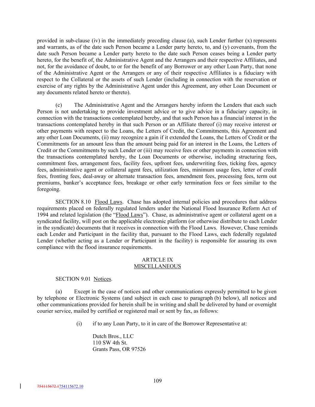 provided in sub-clause (iv) in the immediately preceding clause (a), such Lender further (x) represents and warrants, as of the date such Person became a Lender party hereto, to, and (y) covenants, from the date such Person became a Lender party hereto to the date such Person ceases being a Lender party hereto, for the benefit of, the Administrative Agent and the Arrangers and their respective Affiliates, and not, for the avoidance of doubt, to or for the benefit of any Borrower or any other Loan Party, that none of the Administrative Agent or the Arrangers or any of their respective Affiliates is a fiduciary with respect to the Collateral or the assets of such Lender (including in connection with the reservation or exercise of any rights by the Administrative Agent under this Agreement, any other Loan Document or any documents related hereto or thereto). (c) The Administrative Agent and the Arrangers hereby inform the Lenders that each such Person is not undertaking to provide investment advice or to give advice in a fiduciary capacity, in connection with the transactions contemplated hereby, and that such Person has a financial interest in the transactions contemplated hereby in that such Person or an Affiliate thereof (i) may receive interest or other payments with respect to the Loans, the Letters of Credit, the Commitments, this Agreement and any other Loan Documents, (ii) may recognize a gain if it extended the Loans, the Letters of Credit or the Commitments for an amount less than the amount being paid for an interest in the Loans, the Letters of Credit or the Commitments by such Lender or (iii) may receive fees or other payments in connection with the transactions contemplated hereby, the Loan Documents or otherwise, including structuring fees, commitment fees, arrangement fees, facility fees, upfront fees, underwriting fees, ticking fees, agency fees, administrative agent or collateral agent fees, utilization fees, minimum usage fees, letter of credit fees, fronting fees, deal-away or alternate transaction fees, amendment fees, processing fees, term out premiums, banker’s acceptance fees, breakage or other early termination fees or fees similar to the foregoing. SECTION 8.10 Flood Laws. Chase has adopted internal policies and procedures that address requirements placed on federally regulated lenders under the National Flood Insurance Reform Act of 1994 and related legislation (the “Flood Laws”). Chase, as administrative agent or collateral agent on a syndicated facility, will post on the applicable electronic platform (or otherwise distribute to each Lender in the syndicate) documents that it receives in connection with the Flood Laws. However, Chase reminds each Lender and Participant in the facility that, pursuant to the Flood Laws, each federally regulated Lender (whether acting as a Lender or Participant in the facility) is responsible for assuring its own compliance with the flood insurance requirements. ARTICLE IX MISCELLANEOUS SECTION 9.01 Notices. (a) Except in the case of notices and other communications expressly permitted to be given by telephone or Electronic Systems (and subject in each case to paragraph (b) below), all notices and other communications provided for herein shall be in writing and shall be delivered by hand or overnight courier service, mailed by certified or registered mail or sent by fax, as follows: (i) if to any Loan Party, to it in care of the Borrower Representative at: Dutch Bros., LLC 110 SW 4th St. Grants Pass, OR 97526 109 754115672.1754115672.10