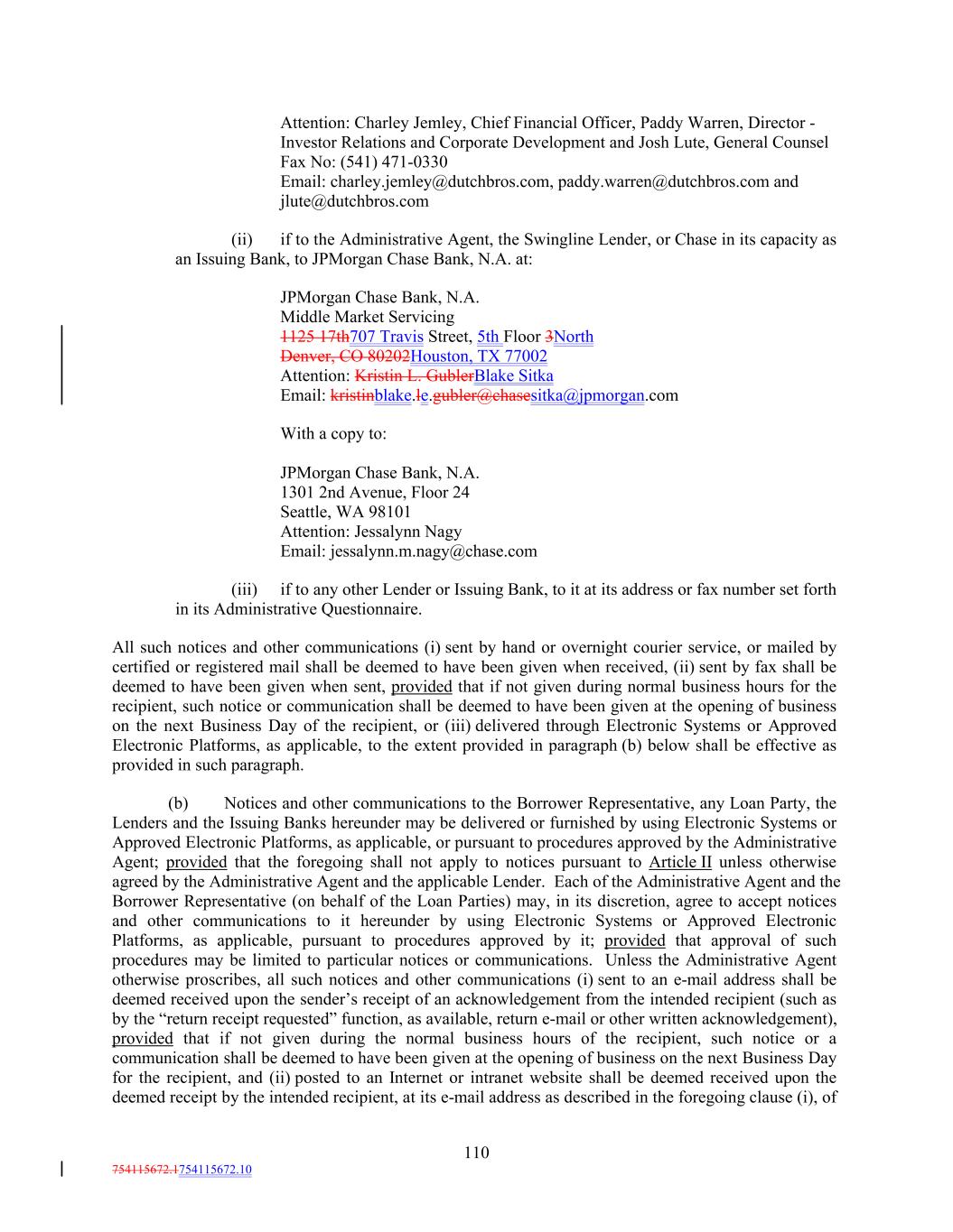 Attention: Charley Jemley, Chief Financial Officer, Paddy Warren, Director - Investor Relations and Corporate Development and Josh Lute, General Counsel Fax No: (541) 471-0330 Email: charley.jemley@dutchbros.com, paddy.warren@dutchbros.com and jlute@dutchbros.com (ii) if to the Administrative Agent, the Swingline Lender, or Chase in its capacity as an Issuing Bank, to JPMorgan Chase Bank, N.A. at: JPMorgan Chase Bank, N.A. Middle Market Servicing 1125 17th707 Travis Street, 5th Floor 3North Denver, CO 80202Houston, TX 77002 Attention: Kristin L. GublerBlake Sitka Email: kristinblake.le.gubler@chasesitka@jpmorgan.com With a copy to: JPMorgan Chase Bank, N.A. 1301 2nd Avenue, Floor 24 Seattle, WA 98101 Attention: Jessalynn Nagy Email: jessalynn.m.nagy@chase.com (iii) if to any other Lender or Issuing Bank, to it at its address or fax number set forth in its Administrative Questionnaire. All such notices and other communications (i) sent by hand or overnight courier service, or mailed by certified or registered mail shall be deemed to have been given when received, (ii) sent by fax shall be deemed to have been given when sent, provided that if not given during normal business hours for the recipient, such notice or communication shall be deemed to have been given at the opening of business on the next Business Day of the recipient, or (iii) delivered through Electronic Systems or Approved Electronic Platforms, as applicable, to the extent provided in paragraph (b) below shall be effective as provided in such paragraph. (b) Notices and other communications to the Borrower Representative, any Loan Party, the Lenders and the Issuing Banks hereunder may be delivered or furnished by using Electronic Systems or Approved Electronic Platforms, as applicable, or pursuant to procedures approved by the Administrative Agent; provided that the foregoing shall not apply to notices pursuant to Article II unless otherwise agreed by the Administrative Agent and the applicable Lender. Each of the Administrative Agent and the Borrower Representative (on behalf of the Loan Parties) may, in its discretion, agree to accept notices and other communications to it hereunder by using Electronic Systems or Approved Electronic Platforms, as applicable, pursuant to procedures approved by it; provided that approval of such procedures may be limited to particular notices or communications. Unless the Administrative Agent otherwise proscribes, all such notices and other communications (i) sent to an e-mail address shall be deemed received upon the sender’s receipt of an acknowledgement from the intended recipient (such as by the “return receipt requested” function, as available, return e-mail or other written acknowledgement), provided that if not given during the normal business hours of the recipient, such notice or a communication shall be deemed to have been given at the opening of business on the next Business Day for the recipient, and (ii) posted to an Internet or intranet website shall be deemed received upon the deemed receipt by the intended recipient, at its e-mail address as described in the foregoing clause (i), of 110 754115672.1754115672.10