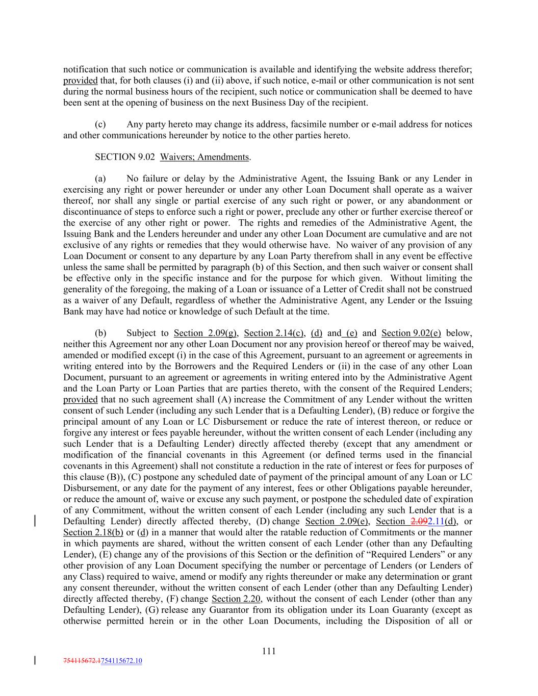 notification that such notice or communication is available and identifying the website address therefor; provided that, for both clauses (i) and (ii) above, if such notice, e-mail or other communication is not sent during the normal business hours of the recipient, such notice or communication shall be deemed to have been sent at the opening of business on the next Business Day of the recipient. (c) Any party hereto may change its address, facsimile number or e-mail address for notices and other communications hereunder by notice to the other parties hereto. SECTION 9.02 Waivers; Amendments. (a) No failure or delay by the Administrative Agent, the Issuing Bank or any Lender in exercising any right or power hereunder or under any other Loan Document shall operate as a waiver thereof, nor shall any single or partial exercise of any such right or power, or any abandonment or discontinuance of steps to enforce such a right or power, preclude any other or further exercise thereof or the exercise of any other right or power. The rights and remedies of the Administrative Agent, the Issuing Bank and the Lenders hereunder and under any other Loan Document are cumulative and are not exclusive of any rights or remedies that they would otherwise have. No waiver of any provision of any Loan Document or consent to any departure by any Loan Party therefrom shall in any event be effective unless the same shall be permitted by paragraph (b) of this Section, and then such waiver or consent shall be effective only in the specific instance and for the purpose for which given. Without limiting the generality of the foregoing, the making of a Loan or issuance of a Letter of Credit shall not be construed as a waiver of any Default, regardless of whether the Administrative Agent, any Lender or the Issuing Bank may have had notice or knowledge of such Default at the time. (b) Subject to Section 2.09(g), Section 2.14(c), (d) and (e) and Section 9.02(e) below, neither this Agreement nor any other Loan Document nor any provision hereof or thereof may be waived, amended or modified except (i) in the case of this Agreement, pursuant to an agreement or agreements in writing entered into by the Borrowers and the Required Lenders or (ii) in the case of any other Loan Document, pursuant to an agreement or agreements in writing entered into by the Administrative Agent and the Loan Party or Loan Parties that are parties thereto, with the consent of the Required Lenders; provided that no such agreement shall (A) increase the Commitment of any Lender without the written consent of such Lender (including any such Lender that is a Defaulting Lender), (B) reduce or forgive the principal amount of any Loan or LC Disbursement or reduce the rate of interest thereon, or reduce or forgive any interest or fees payable hereunder, without the written consent of each Lender (including any such Lender that is a Defaulting Lender) directly affected thereby (except that any amendment or modification of the financial covenants in this Agreement (or defined terms used in the financial covenants in this Agreement) shall not constitute a reduction in the rate of interest or fees for purposes of this clause (B)), (C) postpone any scheduled date of payment of the principal amount of any Loan or LC Disbursement, or any date for the payment of any interest, fees or other Obligations payable hereunder, or reduce the amount of, waive or excuse any such payment, or postpone the scheduled date of expiration of any Commitment, without the written consent of each Lender (including any such Lender that is a Defaulting Lender) directly affected thereby, (D) change Section 2.09(e), Section 2.092.11(d), or Section 2.18(b) or (d) in a manner that would alter the ratable reduction of Commitments or the manner in which payments are shared, without the written consent of each Lender (other than any Defaulting Lender), (E) change any of the provisions of this Section or the definition of “Required Lenders” or any other provision of any Loan Document specifying the number or percentage of Lenders (or Lenders of any Class) required to waive, amend or modify any rights thereunder or make any determination or grant any consent thereunder, without the written consent of each Lender (other than any Defaulting Lender) directly affected thereby, (F) change Section 2.20, without the consent of each Lender (other than any Defaulting Lender), (G) release any Guarantor from its obligation under its Loan Guaranty (except as otherwise permitted herein or in the other Loan Documents, including the Disposition of all or 111 754115672.1754115672.10