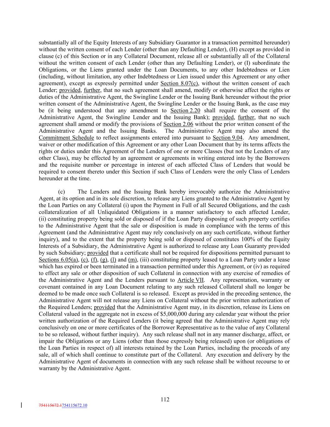 substantially all of the Equity Interests of any Subsidiary Guarantor in a transaction permitted hereunder) without the written consent of each Lender (other than any Defaulting Lender), (H) except as provided in clause (c) of this Section or in any Collateral Document, release all or substantially all of the Collateral without the written consent of each Lender (other than any Defaulting Lender), or (I) subordinate the Obligations, or the Liens granted under the Loan Documents, to any other Indebtedness or Lien (including, without limitation, any other Indebtedness or Lien issued under this Agreement or any other agreement), except as expressly permitted under Section 8.07(c), without the written consent of each Lender; provided, further, that no such agreement shall amend, modify or otherwise affect the rights or duties of the Administrative Agent, the Swingline Lender or the Issuing Bank hereunder without the prior written consent of the Administrative Agent, the Swingline Lender or the Issuing Bank, as the case may be (it being understood that any amendment to Section 2.20 shall require the consent of the Administrative Agent, the Swingline Lender and the Issuing Bank); provided, further, that no such agreement shall amend or modify the provisions of Section 2.06 without the prior written consent of the Administrative Agent and the Issuing Banks. The Administrative Agent may also amend the Commitment Schedule to reflect assignments entered into pursuant to Section 9.04. Any amendment, waiver or other modification of this Agreement or any other Loan Document that by its terms affects the rights or duties under this Agreement of the Lenders of one or more Classes (but not the Lenders of any other Class), may be effected by an agreement or agreements in writing entered into by the Borrowers and the requisite number or percentage in interest of each affected Class of Lenders that would be required to consent thereto under this Section if such Class of Lenders were the only Class of Lenders hereunder at the time. (c) The Lenders and the Issuing Bank hereby irrevocably authorize the Administrative Agent, at its option and in its sole discretion, to release any Liens granted to the Administrative Agent by the Loan Parties on any Collateral (i) upon the Payment in Full of all Secured Obligations, and the cash collateralization of all Unliquidated Obligations in a manner satisfactory to each affected Lender, (ii) constituting property being sold or disposed of if the Loan Party disposing of such property certifies to the Administrative Agent that the sale or disposition is made in compliance with the terms of this Agreement (and the Administrative Agent may rely conclusively on any such certificate, without further inquiry), and to the extent that the property being sold or disposed of constitutes 100% of the Equity Interests of a Subsidiary, the Administrative Agent is authorized to release any Loan Guaranty provided by such Subsidiary; provided that a certificate shall not be required for dispositions permitted pursuant to Sections 6.05(a), (c), (f), (g), (l) and (m), (iii) constituting property leased to a Loan Party under a lease which has expired or been terminated in a transaction permitted under this Agreement, or (iv) as required to effect any sale or other disposition of such Collateral in connection with any exercise of remedies of the Administrative Agent and the Lenders pursuant to Article VII. Any representation, warranty or covenant contained in any Loan Document relating to any such released Collateral shall no longer be deemed to be made once such Collateral is so released. Except as provided in the preceding sentence, the Administrative Agent will not release any Liens on Collateral without the prior written authorization of the Required Lenders; provided that the Administrative Agent may, in its discretion, release its Liens on Collateral valued in the aggregate not in excess of $5,000,000 during any calendar year without the prior written authorization of the Required Lenders (it being agreed that the Administrative Agent may rely conclusively on one or more certificates of the Borrower Representative as to the value of any Collateral to be so released, without further inquiry). Any such release shall not in any manner discharge, affect, or impair the Obligations or any Liens (other than those expressly being released) upon (or obligations of the Loan Parties in respect of) all interests retained by the Loan Parties, including the proceeds of any sale, all of which shall continue to constitute part of the Collateral. Any execution and delivery by the Administrative Agent of documents in connection with any such release shall be without recourse to or warranty by the Administrative Agent. 112 754115672.1754115672.10