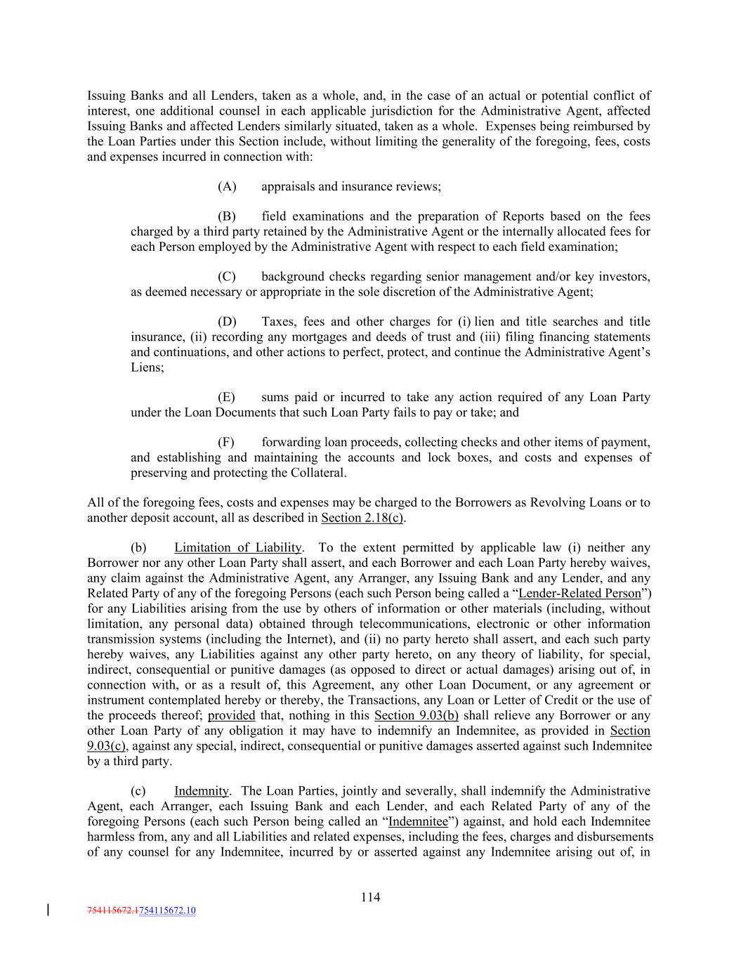 Issuing Banks and all Lenders, taken as a whole, and, in the case of an actual or potential conflict of interest, one additional counsel in each applicable jurisdiction for the Administrative Agent, affected Issuing Banks and affected Lenders similarly situated, taken as a whole. Expenses being reimbursed by the Loan Parties under this Section include, without limiting the generality of the foregoing, fees, costs and expenses incurred in connection with: (A) appraisals and insurance reviews; (B) field examinations and the preparation of Reports based on the fees charged by a third party retained by the Administrative Agent or the internally allocated fees for each Person employed by the Administrative Agent with respect to each field examination; (C) background checks regarding senior management and/or key investors, as deemed necessary or appropriate in the sole discretion of the Administrative Agent; (D) Taxes, fees and other charges for (i) lien and title searches and title insurance, (ii) recording any mortgages and deeds of trust and (iii) filing financing statements and continuations, and other actions to perfect, protect, and continue the Administrative Agent’s Liens; (E) sums paid or incurred to take any action required of any Loan Party under the Loan Documents that such Loan Party fails to pay or take; and (F) forwarding loan proceeds, collecting checks and other items of payment, and establishing and maintaining the accounts and lock boxes, and costs and expenses of preserving and protecting the Collateral. All of the foregoing fees, costs and expenses may be charged to the Borrowers as Revolving Loans or to another deposit account, all as described in Section 2.18(c). (b) Limitation of Liability. To the extent permitted by applicable law (i) neither any Borrower nor any other Loan Party shall assert, and each Borrower and each Loan Party hereby waives, any claim against the Administrative Agent, any Arranger, any Issuing Bank and any Lender, and any Related Party of any of the foregoing Persons (each such Person being called a “Lender-Related Person”) for any Liabilities arising from the use by others of information or other materials (including, without limitation, any personal data) obtained through telecommunications, electronic or other information transmission systems (including the Internet), and (ii) no party hereto shall assert, and each such party hereby waives, any Liabilities against any other party hereto, on any theory of liability, for special, indirect, consequential or punitive damages (as opposed to direct or actual damages) arising out of, in connection with, or as a result of, this Agreement, any other Loan Document, or any agreement or instrument contemplated hereby or thereby, the Transactions, any Loan or Letter of Credit or the use of the proceeds thereof; provided that, nothing in this Section 9.03(b) shall relieve any Borrower or any other Loan Party of any obligation it may have to indemnify an Indemnitee, as provided in Section 9.03(c), against any special, indirect, consequential or punitive damages asserted against such Indemnitee by a third party. (c) Indemnity. The Loan Parties, jointly and severally, shall indemnify the Administrative Agent, each Arranger, each Issuing Bank and each Lender, and each Related Party of any of the foregoing Persons (each such Person being called an “Indemnitee”) against, and hold each Indemnitee harmless from, any and all Liabilities and related expenses, including the fees, charges and disbursements of any counsel for any Indemnitee, incurred by or asserted against any Indemnitee arising out of, in 114 754115672.1754115672.10