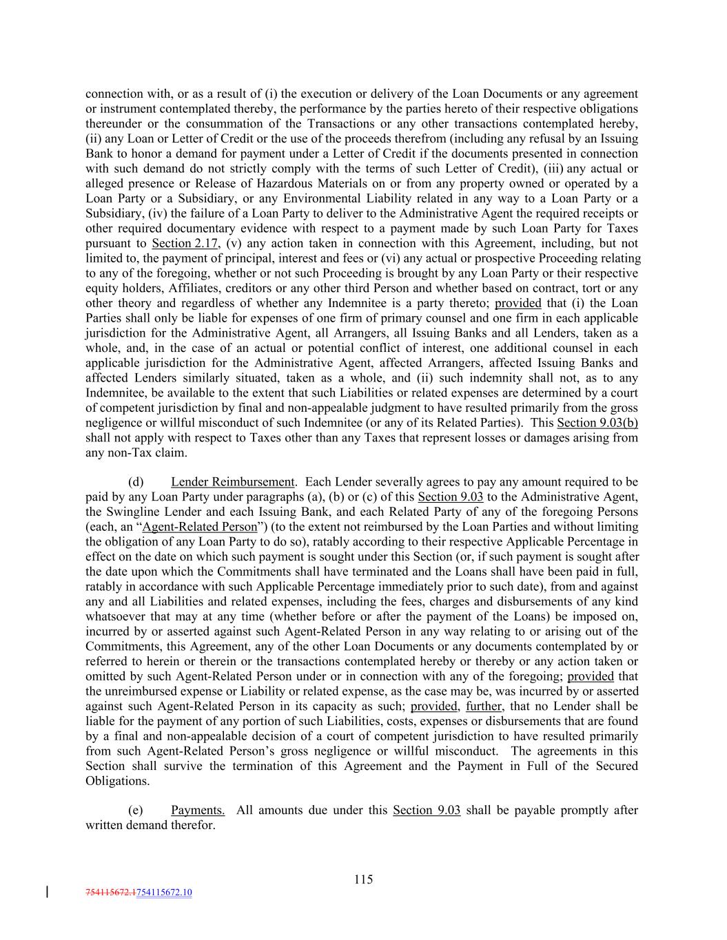 connection with, or as a result of (i) the execution or delivery of the Loan Documents or any agreement or instrument contemplated thereby, the performance by the parties hereto of their respective obligations thereunder or the consummation of the Transactions or any other transactions contemplated hereby, (ii) any Loan or Letter of Credit or the use of the proceeds therefrom (including any refusal by an Issuing Bank to honor a demand for payment under a Letter of Credit if the documents presented in connection with such demand do not strictly comply with the terms of such Letter of Credit), (iii) any actual or alleged presence or Release of Hazardous Materials on or from any property owned or operated by a Loan Party or a Subsidiary, or any Environmental Liability related in any way to a Loan Party or a Subsidiary, (iv) the failure of a Loan Party to deliver to the Administrative Agent the required receipts or other required documentary evidence with respect to a payment made by such Loan Party for Taxes pursuant to Section 2.17, (v) any action taken in connection with this Agreement, including, but not limited to, the payment of principal, interest and fees or (vi) any actual or prospective Proceeding relating to any of the foregoing, whether or not such Proceeding is brought by any Loan Party or their respective equity holders, Affiliates, creditors or any other third Person and whether based on contract, tort or any other theory and regardless of whether any Indemnitee is a party thereto; provided that (i) the Loan Parties shall only be liable for expenses of one firm of primary counsel and one firm in each applicable jurisdiction for the Administrative Agent, all Arrangers, all Issuing Banks and all Lenders, taken as a whole, and, in the case of an actual or potential conflict of interest, one additional counsel in each applicable jurisdiction for the Administrative Agent, affected Arrangers, affected Issuing Banks and affected Lenders similarly situated, taken as a whole, and (ii) such indemnity shall not, as to any Indemnitee, be available to the extent that such Liabilities or related expenses are determined by a court of competent jurisdiction by final and non-appealable judgment to have resulted primarily from the gross negligence or willful misconduct of such Indemnitee (or any of its Related Parties). This Section 9.03(b) shall not apply with respect to Taxes other than any Taxes that represent losses or damages arising from any non-Tax claim. (d) Lender Reimbursement. Each Lender severally agrees to pay any amount required to be paid by any Loan Party under paragraphs (a), (b) or (c) of this Section 9.03 to the Administrative Agent, the Swingline Lender and each Issuing Bank, and each Related Party of any of the foregoing Persons (each, an “Agent-Related Person”) (to the extent not reimbursed by the Loan Parties and without limiting the obligation of any Loan Party to do so), ratably according to their respective Applicable Percentage in effect on the date on which such payment is sought under this Section (or, if such payment is sought after the date upon which the Commitments shall have terminated and the Loans shall have been paid in full, ratably in accordance with such Applicable Percentage immediately prior to such date), from and against any and all Liabilities and related expenses, including the fees, charges and disbursements of any kind whatsoever that may at any time (whether before or after the payment of the Loans) be imposed on, incurred by or asserted against such Agent-Related Person in any way relating to or arising out of the Commitments, this Agreement, any of the other Loan Documents or any documents contemplated by or referred to herein or therein or the transactions contemplated hereby or thereby or any action taken or omitted by such Agent-Related Person under or in connection with any of the foregoing; provided that the unreimbursed expense or Liability or related expense, as the case may be, was incurred by or asserted against such Agent-Related Person in its capacity as such; provided, further, that no Lender shall be liable for the payment of any portion of such Liabilities, costs, expenses or disbursements that are found by a final and non-appealable decision of a court of competent jurisdiction to have resulted primarily from such Agent-Related Person’s gross negligence or willful misconduct. The agreements in this Section shall survive the termination of this Agreement and the Payment in Full of the Secured Obligations. (e) Payments. All amounts due under this Section 9.03 shall be payable promptly after written demand therefor. 115 754115672.1754115672.10