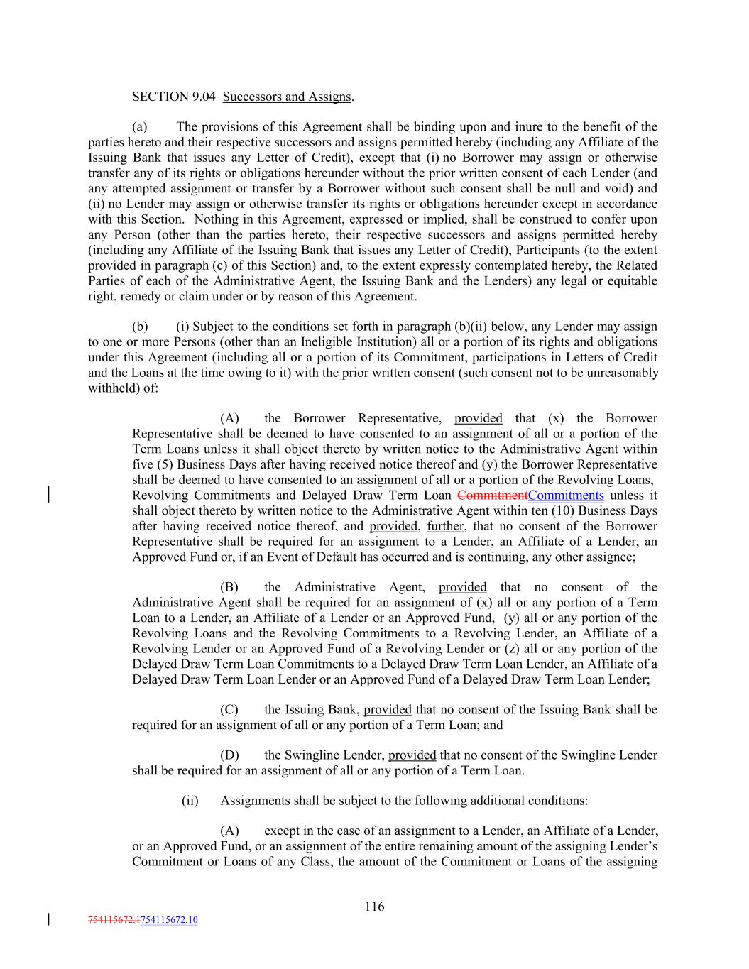 SECTION 9.04 Successors and Assigns. (a) The provisions of this Agreement shall be binding upon and inure to the benefit of the parties hereto and their respective successors and assigns permitted hereby (including any Affiliate of the Issuing Bank that issues any Letter of Credit), except that (i) no Borrower may assign or otherwise transfer any of its rights or obligations hereunder without the prior written consent of each Lender (and any attempted assignment or transfer by a Borrower without such consent shall be null and void) and (ii) no Lender may assign or otherwise transfer its rights or obligations hereunder except in accordance with this Section. Nothing in this Agreement, expressed or implied, shall be construed to confer upon any Person (other than the parties hereto, their respective successors and assigns permitted hereby (including any Affiliate of the Issuing Bank that issues any Letter of Credit), Participants (to the extent provided in paragraph (c) of this Section) and, to the extent expressly contemplated hereby, the Related Parties of each of the Administrative Agent, the Issuing Bank and the Lenders) any legal or equitable right, remedy or claim under or by reason of this Agreement. (b) (i) Subject to the conditions set forth in paragraph (b)(ii) below, any Lender may assign to one or more Persons (other than an Ineligible Institution) all or a portion of its rights and obligations under this Agreement (including all or a portion of its Commitment, participations in Letters of Credit and the Loans at the time owing to it) with the prior written consent (such consent not to be unreasonably withheld) of: (A) the Borrower Representative, provided that (x) the Borrower Representative shall be deemed to have consented to an assignment of all or a portion of the Term Loans unless it shall object thereto by written notice to the Administrative Agent within five (5) Business Days after having received notice thereof and (y) the Borrower Representative shall be deemed to have consented to an assignment of all or a portion of the Revolving Loans, Revolving Commitments and Delayed Draw Term Loan CommitmentCommitments unless it shall object thereto by written notice to the Administrative Agent within ten (10) Business Days after having received notice thereof, and provided, further, that no consent of the Borrower Representative shall be required for an assignment to a Lender, an Affiliate of a Lender, an Approved Fund or, if an Event of Default has occurred and is continuing, any other assignee; (B) the Administrative Agent, provided that no consent of the Administrative Agent shall be required for an assignment of (x) all or any portion of a Term Loan to a Lender, an Affiliate of a Lender or an Approved Fund, (y) all or any portion of the Revolving Loans and the Revolving Commitments to a Revolving Lender, an Affiliate of a Revolving Lender or an Approved Fund of a Revolving Lender or (z) all or any portion of the Delayed Draw Term Loan Commitments to a Delayed Draw Term Loan Lender, an Affiliate of a Delayed Draw Term Loan Lender or an Approved Fund of a Delayed Draw Term Loan Lender; (C) the Issuing Bank, provided that no consent of the Issuing Bank shall be required for an assignment of all or any portion of a Term Loan; and (D) the Swingline Lender, provided that no consent of the Swingline Lender shall be required for an assignment of all or any portion of a Term Loan. (ii) Assignments shall be subject to the following additional conditions: (A) except in the case of an assignment to a Lender, an Affiliate of a Lender, or an Approved Fund, or an assignment of the entire remaining amount of the assigning Lender’s Commitment or Loans of any Class, the amount of the Commitment or Loans of the assigning 116 754115672.1754115672.10