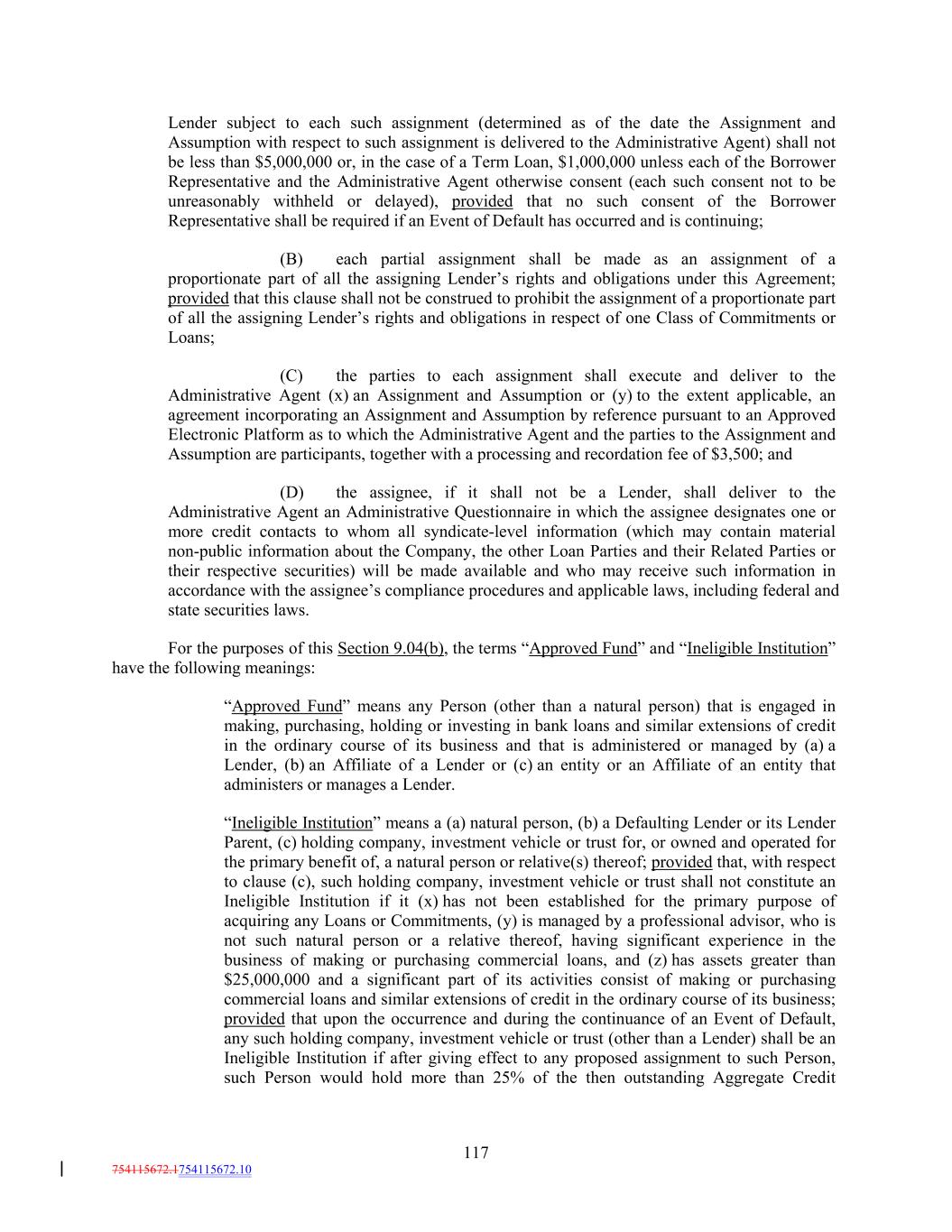 Lender subject to each such assignment (determined as of the date the Assignment and Assumption with respect to such assignment is delivered to the Administrative Agent) shall not be less than $5,000,000 or, in the case of a Term Loan, $1,000,000 unless each of the Borrower Representative and the Administrative Agent otherwise consent (each such consent not to be unreasonably withheld or delayed), provided that no such consent of the Borrower Representative shall be required if an Event of Default has occurred and is continuing; (B) each partial assignment shall be made as an assignment of a proportionate part of all the assigning Lender’s rights and obligations under this Agreement; provided that this clause shall not be construed to prohibit the assignment of a proportionate part of all the assigning Lender’s rights and obligations in respect of one Class of Commitments or Loans; (C) the parties to each assignment shall execute and deliver to the Administrative Agent (x) an Assignment and Assumption or (y) to the extent applicable, an agreement incorporating an Assignment and Assumption by reference pursuant to an Approved Electronic Platform as to which the Administrative Agent and the parties to the Assignment and Assumption are participants, together with a processing and recordation fee of $3,500; and (D) the assignee, if it shall not be a Lender, shall deliver to the Administrative Agent an Administrative Questionnaire in which the assignee designates one or more credit contacts to whom all syndicate-level information (which may contain material non-public information about the Company, the other Loan Parties and their Related Parties or their respective securities) will be made available and who may receive such information in accordance with the assignee’s compliance procedures and applicable laws, including federal and state securities laws. For the purposes of this Section 9.04(b), the terms “Approved Fund” and “Ineligible Institution” have the following meanings: “Approved Fund” means any Person (other than a natural person) that is engaged in making, purchasing, holding or investing in bank loans and similar extensions of credit in the ordinary course of its business and that is administered or managed by (a) a Lender, (b) an Affiliate of a Lender or (c) an entity or an Affiliate of an entity that administers or manages a Lender. “Ineligible Institution” means a (a) natural person, (b) a Defaulting Lender or its Lender Parent, (c) holding company, investment vehicle or trust for, or owned and operated for the primary benefit of, a natural person or relative(s) thereof; provided that, with respect to clause (c), such holding company, investment vehicle or trust shall not constitute an Ineligible Institution if it (x) has not been established for the primary purpose of acquiring any Loans or Commitments, (y) is managed by a professional advisor, who is not such natural person or a relative thereof, having significant experience in the business of making or purchasing commercial loans, and (z) has assets greater than $25,000,000 and a significant part of its activities consist of making or purchasing commercial loans and similar extensions of credit in the ordinary course of its business; provided that upon the occurrence and during the continuance of an Event of Default, any such holding company, investment vehicle or trust (other than a Lender) shall be an Ineligible Institution if after giving effect to any proposed assignment to such Person, such Person would hold more than 25% of the then outstanding Aggregate Credit 117 754115672.1754115672.10