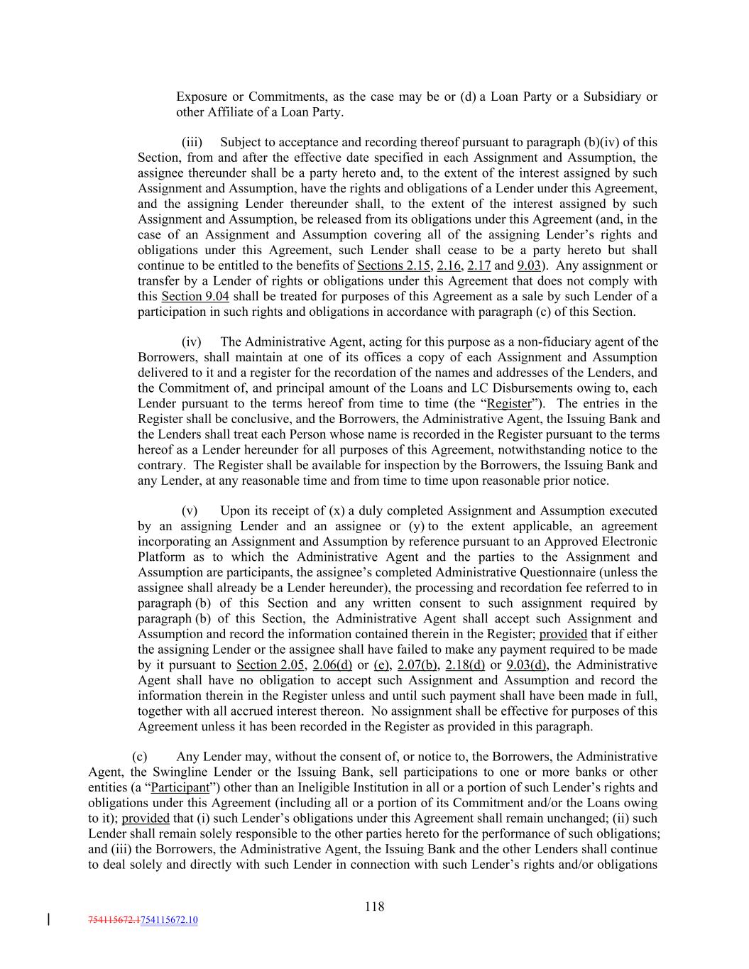 Exposure or Commitments, as the case may be or (d) a Loan Party or a Subsidiary or other Affiliate of a Loan Party. (iii) Subject to acceptance and recording thereof pursuant to paragraph (b)(iv) of this Section, from and after the effective date specified in each Assignment and Assumption, the assignee thereunder shall be a party hereto and, to the extent of the interest assigned by such Assignment and Assumption, have the rights and obligations of a Lender under this Agreement, and the assigning Lender thereunder shall, to the extent of the interest assigned by such Assignment and Assumption, be released from its obligations under this Agreement (and, in the case of an Assignment and Assumption covering all of the assigning Lender’s rights and obligations under this Agreement, such Lender shall cease to be a party hereto but shall continue to be entitled to the benefits of Sections 2.15, 2.16, 2.17 and 9.03). Any assignment or transfer by a Lender of rights or obligations under this Agreement that does not comply with this Section 9.04 shall be treated for purposes of this Agreement as a sale by such Lender of a participation in such rights and obligations in accordance with paragraph (c) of this Section. (iv) The Administrative Agent, acting for this purpose as a non-fiduciary agent of the Borrowers, shall maintain at one of its offices a copy of each Assignment and Assumption delivered to it and a register for the recordation of the names and addresses of the Lenders, and the Commitment of, and principal amount of the Loans and LC Disbursements owing to, each Lender pursuant to the terms hereof from time to time (the “Register”). The entries in the Register shall be conclusive, and the Borrowers, the Administrative Agent, the Issuing Bank and the Lenders shall treat each Person whose name is recorded in the Register pursuant to the terms hereof as a Lender hereunder for all purposes of this Agreement, notwithstanding notice to the contrary. The Register shall be available for inspection by the Borrowers, the Issuing Bank and any Lender, at any reasonable time and from time to time upon reasonable prior notice. (v) Upon its receipt of (x) a duly completed Assignment and Assumption executed by an assigning Lender and an assignee or (y) to the extent applicable, an agreement incorporating an Assignment and Assumption by reference pursuant to an Approved Electronic Platform as to which the Administrative Agent and the parties to the Assignment and Assumption are participants, the assignee’s completed Administrative Questionnaire (unless the assignee shall already be a Lender hereunder), the processing and recordation fee referred to in paragraph (b) of this Section and any written consent to such assignment required by paragraph (b) of this Section, the Administrative Agent shall accept such Assignment and Assumption and record the information contained therein in the Register; provided that if either the assigning Lender or the assignee shall have failed to make any payment required to be made by it pursuant to Section 2.05, 2.06(d) or (e), 2.07(b), 2.18(d) or 9.03(d), the Administrative Agent shall have no obligation to accept such Assignment and Assumption and record the information therein in the Register unless and until such payment shall have been made in full, together with all accrued interest thereon. No assignment shall be effective for purposes of this Agreement unless it has been recorded in the Register as provided in this paragraph. (c) Any Lender may, without the consent of, or notice to, the Borrowers, the Administrative Agent, the Swingline Lender or the Issuing Bank, sell participations to one or more banks or other entities (a “Participant”) other than an Ineligible Institution in all or a portion of such Lender’s rights and obligations under this Agreement (including all or a portion of its Commitment and/or the Loans owing to it); provided that (i) such Lender’s obligations under this Agreement shall remain unchanged; (ii) such Lender shall remain solely responsible to the other parties hereto for the performance of such obligations; and (iii) the Borrowers, the Administrative Agent, the Issuing Bank and the other Lenders shall continue to deal solely and directly with such Lender in connection with such Lender’s rights and/or obligations 118 754115672.1754115672.10