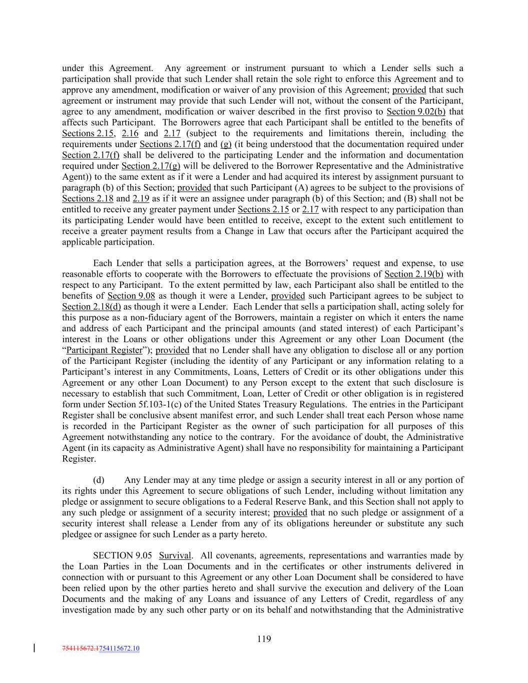 under this Agreement. Any agreement or instrument pursuant to which a Lender sells such a participation shall provide that such Lender shall retain the sole right to enforce this Agreement and to approve any amendment, modification or waiver of any provision of this Agreement; provided that such agreement or instrument may provide that such Lender will not, without the consent of the Participant, agree to any amendment, modification or waiver described in the first proviso to Section 9.02(b) that affects such Participant. The Borrowers agree that each Participant shall be entitled to the benefits of Sections 2.15, 2.16 and 2.17 (subject to the requirements and limitations therein, including the requirements under Sections 2.17(f) and (g) (it being understood that the documentation required under Section 2.17(f) shall be delivered to the participating Lender and the information and documentation required under Section 2.17(g) will be delivered to the Borrower Representative and the Administrative Agent)) to the same extent as if it were a Lender and had acquired its interest by assignment pursuant to paragraph (b) of this Section; provided that such Participant (A) agrees to be subject to the provisions of Sections 2.18 and 2.19 as if it were an assignee under paragraph (b) of this Section; and (B) shall not be entitled to receive any greater payment under Sections 2.15 or 2.17 with respect to any participation than its participating Lender would have been entitled to receive, except to the extent such entitlement to receive a greater payment results from a Change in Law that occurs after the Participant acquired the applicable participation. Each Lender that sells a participation agrees, at the Borrowers’ request and expense, to use reasonable efforts to cooperate with the Borrowers to effectuate the provisions of Section 2.19(b) with respect to any Participant. To the extent permitted by law, each Participant also shall be entitled to the benefits of Section 9.08 as though it were a Lender, provided such Participant agrees to be subject to Section 2.18(d) as though it were a Lender. Each Lender that sells a participation shall, acting solely for this purpose as a non-fiduciary agent of the Borrowers, maintain a register on which it enters the name and address of each Participant and the principal amounts (and stated interest) of each Participant’s interest in the Loans or other obligations under this Agreement or any other Loan Document (the “Participant Register”); provided that no Lender shall have any obligation to disclose all or any portion of the Participant Register (including the identity of any Participant or any information relating to a Participant’s interest in any Commitments, Loans, Letters of Credit or its other obligations under this Agreement or any other Loan Document) to any Person except to the extent that such disclosure is necessary to establish that such Commitment, Loan, Letter of Credit or other obligation is in registered form under Section 5f.103-1(c) of the United States Treasury Regulations. The entries in the Participant Register shall be conclusive absent manifest error, and such Lender shall treat each Person whose name is recorded in the Participant Register as the owner of such participation for all purposes of this Agreement notwithstanding any notice to the contrary. For the avoidance of doubt, the Administrative Agent (in its capacity as Administrative Agent) shall have no responsibility for maintaining a Participant Register. (d) Any Lender may at any time pledge or assign a security interest in all or any portion of its rights under this Agreement to secure obligations of such Lender, including without limitation any pledge or assignment to secure obligations to a Federal Reserve Bank, and this Section shall not apply to any such pledge or assignment of a security interest; provided that no such pledge or assignment of a security interest shall release a Lender from any of its obligations hereunder or substitute any such pledgee or assignee for such Lender as a party hereto. SECTION 9.05 Survival. All covenants, agreements, representations and warranties made by the Loan Parties in the Loan Documents and in the certificates or other instruments delivered in connection with or pursuant to this Agreement or any other Loan Document shall be considered to have been relied upon by the other parties hereto and shall survive the execution and delivery of the Loan Documents and the making of any Loans and issuance of any Letters of Credit, regardless of any investigation made by any such other party or on its behalf and notwithstanding that the Administrative 119 754115672.1754115672.10
