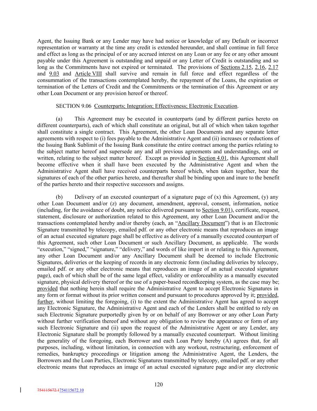 Agent, the Issuing Bank or any Lender may have had notice or knowledge of any Default or incorrect representation or warranty at the time any credit is extended hereunder, and shall continue in full force and effect as long as the principal of or any accrued interest on any Loan or any fee or any other amount payable under this Agreement is outstanding and unpaid or any Letter of Credit is outstanding and so long as the Commitments have not expired or terminated. The provisions of Sections 2.15, 2.16, 2.17 and 9.03 and Article VIII shall survive and remain in full force and effect regardless of the consummation of the transactions contemplated hereby, the repayment of the Loans, the expiration or termination of the Letters of Credit and the Commitments or the termination of this Agreement or any other Loan Document or any provision hereof or thereof. SECTION 9.06 Counterparts; Integration; Effectiveness; Electronic Execution. (a) This Agreement may be executed in counterparts (and by different parties hereto on different counterparts), each of which shall constitute an original, but all of which when taken together shall constitute a single contract. This Agreement, the other Loan Documents and any separate letter agreements with respect to (i) fees payable to the Administrative Agent and (ii) increases or reductions of the Issuing Bank Sublimit of the Issuing Bank constitute the entire contract among the parties relating to the subject matter hereof and supersede any and all previous agreements and understandings, oral or written, relating to the subject matter hereof. Except as provided in Section 4.01, this Agreement shall become effective when it shall have been executed by the Administrative Agent and when the Administrative Agent shall have received counterparts hereof which, when taken together, bear the signatures of each of the other parties hereto, and thereafter shall be binding upon and inure to the benefit of the parties hereto and their respective successors and assigns. (b) Delivery of an executed counterpart of a signature page of (x) this Agreement, (y) any other Loan Document and/or (z) any document, amendment, approval, consent, information, notice (including, for the avoidance of doubt, any notice delivered pursuant to Section 9.01), certificate, request, statement, disclosure or authorization related to this Agreement, any other Loan Document and/or the transactions contemplated hereby and/or thereby (each, an “Ancillary Document”) that is an Electronic Signature transmitted by telecopy, emailed pdf. or any other electronic means that reproduces an image of an actual executed signature page shall be effective as delivery of a manually executed counterpart of this Agreement, such other Loan Document or such Ancillary Document, as applicable. The words “execution,” “signed,” “signature,” “delivery,” and words of like import in or relating to this Agreement, any other Loan Document and/or any Ancillary Document shall be deemed to include Electronic Signatures, deliveries or the keeping of records in any electronic form (including deliveries by telecopy, emailed pdf. or any other electronic means that reproduces an image of an actual executed signature page), each of which shall be of the same legal effect, validity or enforceability as a manually executed signature, physical delivery thereof or the use of a paper-based recordkeeping system, as the case may be; provided that nothing herein shall require the Administrative Agent to accept Electronic Signatures in any form or format without its prior written consent and pursuant to procedures approved by it; provided, further, without limiting the foregoing, (i) to the extent the Administrative Agent has agreed to accept any Electronic Signature, the Administrative Agent and each of the Lenders shall be entitled to rely on such Electronic Signature purportedly given by or on behalf of any Borrower or any other Loan Party without further verification thereof and without any obligation to review the appearance or form of any such Electronic Signature and (ii) upon the request of the Administrative Agent or any Lender, any Electronic Signature shall be promptly followed by a manually executed counterpart. Without limiting the generality of the foregoing, each Borrower and each Loan Party hereby (A) agrees that, for all purposes, including, without limitation, in connection with any workout, restructuring, enforcement of remedies, bankruptcy proceedings or litigation among the Administrative Agent, the Lenders, the Borrowers and the Loan Parties, Electronic Signatures transmitted by telecopy, emailed pdf. or any other electronic means that reproduces an image of an actual executed signature page and/or any electronic 120 754115672.1754115672.10