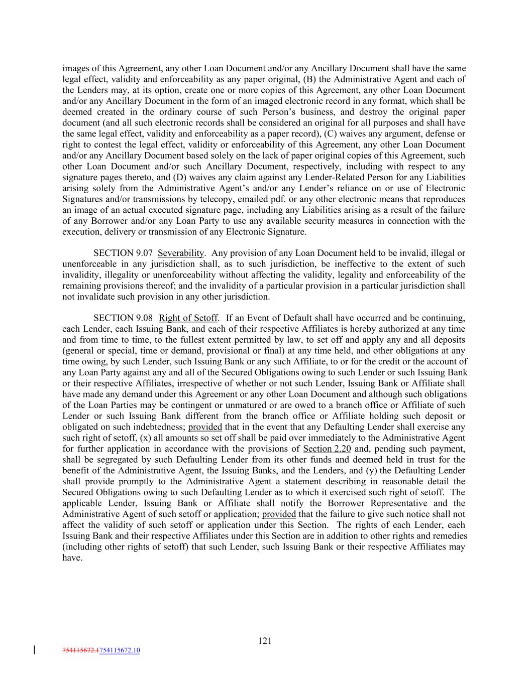 images of this Agreement, any other Loan Document and/or any Ancillary Document shall have the same legal effect, validity and enforceability as any paper original, (B) the Administrative Agent and each of the Lenders may, at its option, create one or more copies of this Agreement, any other Loan Document and/or any Ancillary Document in the form of an imaged electronic record in any format, which shall be deemed created in the ordinary course of such Person’s business, and destroy the original paper document (and all such electronic records shall be considered an original for all purposes and shall have the same legal effect, validity and enforceability as a paper record), (C) waives any argument, defense or right to contest the legal effect, validity or enforceability of this Agreement, any other Loan Document and/or any Ancillary Document based solely on the lack of paper original copies of this Agreement, such other Loan Document and/or such Ancillary Document, respectively, including with respect to any signature pages thereto, and (D) waives any claim against any Lender-Related Person for any Liabilities arising solely from the Administrative Agent’s and/or any Lender’s reliance on or use of Electronic Signatures and/or transmissions by telecopy, emailed pdf. or any other electronic means that reproduces an image of an actual executed signature page, including any Liabilities arising as a result of the failure of any Borrower and/or any Loan Party to use any available security measures in connection with the execution, delivery or transmission of any Electronic Signature. SECTION 9.07 Severability. Any provision of any Loan Document held to be invalid, illegal or unenforceable in any jurisdiction shall, as to such jurisdiction, be ineffective to the extent of such invalidity, illegality or unenforceability without affecting the validity, legality and enforceability of the remaining provisions thereof; and the invalidity of a particular provision in a particular jurisdiction shall not invalidate such provision in any other jurisdiction. SECTION 9.08 Right of Setoff. If an Event of Default shall have occurred and be continuing, each Lender, each Issuing Bank, and each of their respective Affiliates is hereby authorized at any time and from time to time, to the fullest extent permitted by law, to set off and apply any and all deposits (general or special, time or demand, provisional or final) at any time held, and other obligations at any time owing, by such Lender, such Issuing Bank or any such Affiliate, to or for the credit or the account of any Loan Party against any and all of the Secured Obligations owing to such Lender or such Issuing Bank or their respective Affiliates, irrespective of whether or not such Lender, Issuing Bank or Affiliate shall have made any demand under this Agreement or any other Loan Document and although such obligations of the Loan Parties may be contingent or unmatured or are owed to a branch office or Affiliate of such Lender or such Issuing Bank different from the branch office or Affiliate holding such deposit or obligated on such indebtedness; provided that in the event that any Defaulting Lender shall exercise any such right of setoff, (x) all amounts so set off shall be paid over immediately to the Administrative Agent for further application in accordance with the provisions of Section 2.20 and, pending such payment, shall be segregated by such Defaulting Lender from its other funds and deemed held in trust for the benefit of the Administrative Agent, the Issuing Banks, and the Lenders, and (y) the Defaulting Lender shall provide promptly to the Administrative Agent a statement describing in reasonable detail the Secured Obligations owing to such Defaulting Lender as to which it exercised such right of setoff. The applicable Lender, Issuing Bank or Affiliate shall notify the Borrower Representative and the Administrative Agent of such setoff or application; provided that the failure to give such notice shall not affect the validity of such setoff or application under this Section. The rights of each Lender, each Issuing Bank and their respective Affiliates under this Section are in addition to other rights and remedies (including other rights of setoff) that such Lender, such Issuing Bank or their respective Affiliates may have. 121 754115672.1754115672.10