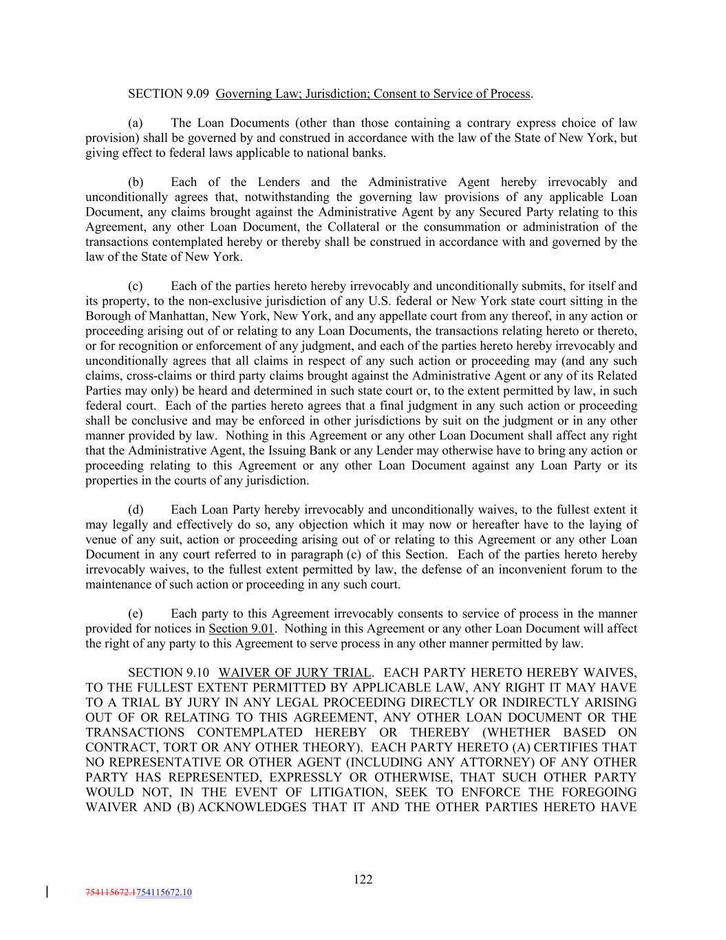 SECTION 9.09 Governing Law; Jurisdiction; Consent to Service of Process. (a) The Loan Documents (other than those containing a contrary express choice of law provision) shall be governed by and construed in accordance with the law of the State of New York, but giving effect to federal laws applicable to national banks. (b) Each of the Lenders and the Administrative Agent hereby irrevocably and unconditionally agrees that, notwithstanding the governing law provisions of any applicable Loan Document, any claims brought against the Administrative Agent by any Secured Party relating to this Agreement, any other Loan Document, the Collateral or the consummation or administration of the transactions contemplated hereby or thereby shall be construed in accordance with and governed by the law of the State of New York. (c) Each of the parties hereto hereby irrevocably and unconditionally submits, for itself and its property, to the non-exclusive jurisdiction of any U.S. federal or New York state court sitting in the Borough of Manhattan, New York, New York, and any appellate court from any thereof, in any action or proceeding arising out of or relating to any Loan Documents, the transactions relating hereto or thereto, or for recognition or enforcement of any judgment, and each of the parties hereto hereby irrevocably and unconditionally agrees that all claims in respect of any such action or proceeding may (and any such claims, cross-claims or third party claims brought against the Administrative Agent or any of its Related Parties may only) be heard and determined in such state court or, to the extent permitted by law, in such federal court. Each of the parties hereto agrees that a final judgment in any such action or proceeding shall be conclusive and may be enforced in other jurisdictions by suit on the judgment or in any other manner provided by law. Nothing in this Agreement or any other Loan Document shall affect any right that the Administrative Agent, the Issuing Bank or any Lender may otherwise have to bring any action or proceeding relating to this Agreement or any other Loan Document against any Loan Party or its properties in the courts of any jurisdiction. (d) Each Loan Party hereby irrevocably and unconditionally waives, to the fullest extent it may legally and effectively do so, any objection which it may now or hereafter have to the laying of venue of any suit, action or proceeding arising out of or relating to this Agreement or any other Loan Document in any court referred to in paragraph (c) of this Section. Each of the parties hereto hereby irrevocably waives, to the fullest extent permitted by law, the defense of an inconvenient forum to the maintenance of such action or proceeding in any such court. (e) Each party to this Agreement irrevocably consents to service of process in the manner provided for notices in Section 9.01. Nothing in this Agreement or any other Loan Document will affect the right of any party to this Agreement to serve process in any other manner permitted by law. SECTION 9.10 WAIVER OF JURY TRIAL. EACH PARTY HERETO HEREBY WAIVES, TO THE FULLEST EXTENT PERMITTED BY APPLICABLE LAW, ANY RIGHT IT MAY HAVE TO A TRIAL BY JURY IN ANY LEGAL PROCEEDING DIRECTLY OR INDIRECTLY ARISING OUT OF OR RELATING TO THIS AGREEMENT, ANY OTHER LOAN DOCUMENT OR THE TRANSACTIONS CONTEMPLATED HEREBY OR THEREBY (WHETHER BASED ON CONTRACT, TORT OR ANY OTHER THEORY). EACH PARTY HERETO (A) CERTIFIES THAT NO REPRESENTATIVE OR OTHER AGENT (INCLUDING ANY ATTORNEY) OF ANY OTHER PARTY HAS REPRESENTED, EXPRESSLY OR OTHERWISE, THAT SUCH OTHER PARTY WOULD NOT, IN THE EVENT OF LITIGATION, SEEK TO ENFORCE THE FOREGOING WAIVER AND (B) ACKNOWLEDGES THAT IT AND THE OTHER PARTIES HERETO HAVE 122 754115672.1754115672.10