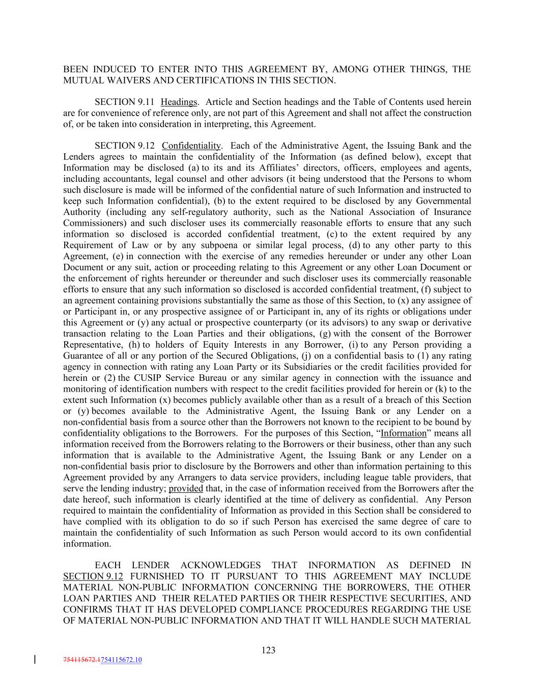 BEEN INDUCED TO ENTER INTO THIS AGREEMENT BY, AMONG OTHER THINGS, THE MUTUAL WAIVERS AND CERTIFICATIONS IN THIS SECTION. SECTION 9.11 Headings. Article and Section headings and the Table of Contents used herein are for convenience of reference only, are not part of this Agreement and shall not affect the construction of, or be taken into consideration in interpreting, this Agreement. SECTION 9.12 Confidentiality. Each of the Administrative Agent, the Issuing Bank and the Lenders agrees to maintain the confidentiality of the Information (as defined below), except that Information may be disclosed (a) to its and its Affiliates’ directors, officers, employees and agents, including accountants, legal counsel and other advisors (it being understood that the Persons to whom such disclosure is made will be informed of the confidential nature of such Information and instructed to keep such Information confidential), (b) to the extent required to be disclosed by any Governmental Authority (including any self-regulatory authority, such as the National Association of Insurance Commissioners) and such discloser uses its commercially reasonable efforts to ensure that any such information so disclosed is accorded confidential treatment, (c) to the extent required by any Requirement of Law or by any subpoena or similar legal process, (d) to any other party to this Agreement, (e) in connection with the exercise of any remedies hereunder or under any other Loan Document or any suit, action or proceeding relating to this Agreement or any other Loan Document or the enforcement of rights hereunder or thereunder and such discloser uses its commercially reasonable efforts to ensure that any such information so disclosed is accorded confidential treatment, (f) subject to an agreement containing provisions substantially the same as those of this Section, to (x) any assignee of or Participant in, or any prospective assignee of or Participant in, any of its rights or obligations under this Agreement or (y) any actual or prospective counterparty (or its advisors) to any swap or derivative transaction relating to the Loan Parties and their obligations, (g) with the consent of the Borrower Representative, (h) to holders of Equity Interests in any Borrower, (i) to any Person providing a Guarantee of all or any portion of the Secured Obligations, (j) on a confidential basis to (1) any rating agency in connection with rating any Loan Party or its Subsidiaries or the credit facilities provided for herein or (2) the CUSIP Service Bureau or any similar agency in connection with the issuance and monitoring of identification numbers with respect to the credit facilities provided for herein or (k) to the extent such Information (x) becomes publicly available other than as a result of a breach of this Section or (y) becomes available to the Administrative Agent, the Issuing Bank or any Lender on a non-confidential basis from a source other than the Borrowers not known to the recipient to be bound by confidentiality obligations to the Borrowers. For the purposes of this Section, “Information” means all information received from the Borrowers relating to the Borrowers or their business, other than any such information that is available to the Administrative Agent, the Issuing Bank or any Lender on a non-confidential basis prior to disclosure by the Borrowers and other than information pertaining to this Agreement provided by any Arrangers to data service providers, including league table providers, that serve the lending industry; provided that, in the case of information received from the Borrowers after the date hereof, such information is clearly identified at the time of delivery as confidential. Any Person required to maintain the confidentiality of Information as provided in this Section shall be considered to have complied with its obligation to do so if such Person has exercised the same degree of care to maintain the confidentiality of such Information as such Person would accord to its own confidential information. EACH LENDER ACKNOWLEDGES THAT INFORMATION AS DEFINED IN SECTION 9.12 FURNISHED TO IT PURSUANT TO THIS AGREEMENT MAY INCLUDE MATERIAL NON-PUBLIC INFORMATION CONCERNING THE BORROWERS, THE OTHER LOAN PARTIES AND THEIR RELATED PARTIES OR THEIR RESPECTIVE SECURITIES, AND CONFIRMS THAT IT HAS DEVELOPED COMPLIANCE PROCEDURES REGARDING THE USE OF MATERIAL NON-PUBLIC INFORMATION AND THAT IT WILL HANDLE SUCH MATERIAL 123 754115672.1754115672.10