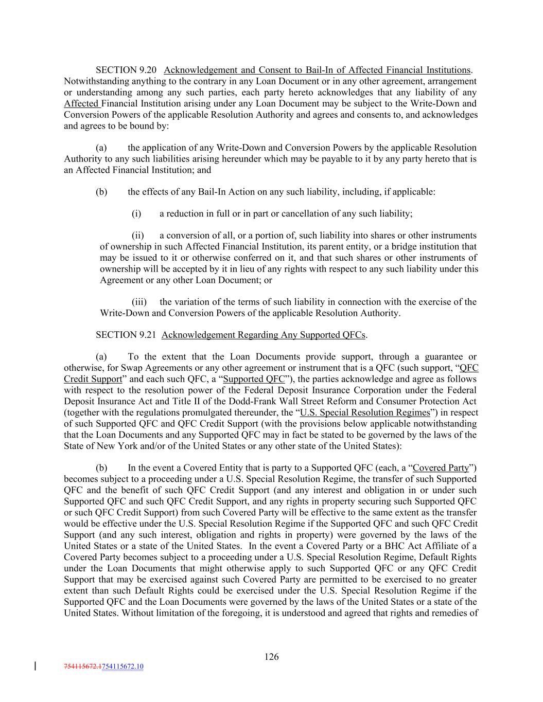 SECTION 9.20 Acknowledgement and Consent to Bail-In of Affected Financial Institutions. Notwithstanding anything to the contrary in any Loan Document or in any other agreement, arrangement or understanding among any such parties, each party hereto acknowledges that any liability of any Affected Financial Institution arising under any Loan Document may be subject to the Write-Down and Conversion Powers of the applicable Resolution Authority and agrees and consents to, and acknowledges and agrees to be bound by: (a) the application of any Write-Down and Conversion Powers by the applicable Resolution Authority to any such liabilities arising hereunder which may be payable to it by any party hereto that is an Affected Financial Institution; and (b) the effects of any Bail-In Action on any such liability, including, if applicable: (i) a reduction in full or in part or cancellation of any such liability; (ii) a conversion of all, or a portion of, such liability into shares or other instruments of ownership in such Affected Financial Institution, its parent entity, or a bridge institution that may be issued to it or otherwise conferred on it, and that such shares or other instruments of ownership will be accepted by it in lieu of any rights with respect to any such liability under this Agreement or any other Loan Document; or (iii) the variation of the terms of such liability in connection with the exercise of the Write-Down and Conversion Powers of the applicable Resolution Authority. SECTION 9.21 Acknowledgement Regarding Any Supported QFCs. (a) To the extent that the Loan Documents provide support, through a guarantee or otherwise, for Swap Agreements or any other agreement or instrument that is a QFC (such support, “QFC Credit Support” and each such QFC, a “Supported QFC”), the parties acknowledge and agree as follows with respect to the resolution power of the Federal Deposit Insurance Corporation under the Federal Deposit Insurance Act and Title II of the Dodd-Frank Wall Street Reform and Consumer Protection Act (together with the regulations promulgated thereunder, the “U.S. Special Resolution Regimes”) in respect of such Supported QFC and QFC Credit Support (with the provisions below applicable notwithstanding that the Loan Documents and any Supported QFC may in fact be stated to be governed by the laws of the State of New York and/or of the United States or any other state of the United States): (b) In the event a Covered Entity that is party to a Supported QFC (each, a “Covered Party”) becomes subject to a proceeding under a U.S. Special Resolution Regime, the transfer of such Supported QFC and the benefit of such QFC Credit Support (and any interest and obligation in or under such Supported QFC and such QFC Credit Support, and any rights in property securing such Supported QFC or such QFC Credit Support) from such Covered Party will be effective to the same extent as the transfer would be effective under the U.S. Special Resolution Regime if the Supported QFC and such QFC Credit Support (and any such interest, obligation and rights in property) were governed by the laws of the United States or a state of the United States. In the event a Covered Party or a BHC Act Affiliate of a Covered Party becomes subject to a proceeding under a U.S. Special Resolution Regime, Default Rights under the Loan Documents that might otherwise apply to such Supported QFC or any QFC Credit Support that may be exercised against such Covered Party are permitted to be exercised to no greater extent than such Default Rights could be exercised under the U.S. Special Resolution Regime if the Supported QFC and the Loan Documents were governed by the laws of the United States or a state of the United States. Without limitation of the foregoing, it is understood and agreed that rights and remedies of 126 754115672.1754115672.10