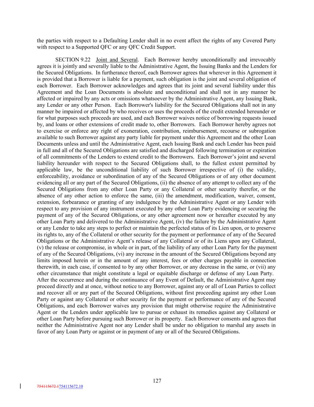 the parties with respect to a Defaulting Lender shall in no event affect the rights of any Covered Party with respect to a Supported QFC or any QFC Credit Support. SECTION 9.22 Joint and Several. Each Borrower hereby unconditionally and irrevocably agrees it is jointly and severally liable to the Administrative Agent, the Issuing Banks and the Lenders for the Secured Obligations. In furtherance thereof, each Borrower agrees that wherever in this Agreement it is provided that a Borrower is liable for a payment, such obligation is the joint and several obligation of each Borrower. Each Borrower acknowledges and agrees that its joint and several liability under this Agreement and the Loan Documents is absolute and unconditional and shall not in any manner be affected or impaired by any acts or omissions whatsoever by the Administrative Agent, any Issuing Bank, any Lender or any other Person. Each Borrower's liability for the Secured Obligations shall not in any manner be impaired or affected by who receives or uses the proceeds of the credit extended hereunder or for what purposes such proceeds are used, and each Borrower waives notice of borrowing requests issued by, and loans or other extensions of credit made to, other Borrowers. Each Borrower hereby agrees not to exercise or enforce any right of exoneration, contribution, reimbursement, recourse or subrogation available to such Borrower against any party liable for payment under this Agreement and the other Loan Documents unless and until the Administrative Agent, each Issuing Bank and each Lender has been paid in full and all of the Secured Obligations are satisfied and discharged following termination or expiration of all commitments of the Lenders to extend credit to the Borrowers. Each Borrower’s joint and several liability hereunder with respect to the Secured Obligations shall, to the fullest extent permitted by applicable law, be the unconditional liability of such Borrower irrespective of (i) the validity, enforceability, avoidance or subordination of any of the Secured Obligations or of any other document evidencing all or any part of the Secured Obligations, (ii) the absence of any attempt to collect any of the Secured Obligations from any other Loan Party or any Collateral or other security therefor, or the absence of any other action to enforce the same, (iii) the amendment, modification, waiver, consent, extension, forbearance or granting of any indulgence by the Administrative Agent or any Lender with respect to any provision of any instrument executed by any other Loan Party evidencing or securing the payment of any of the Secured Obligations, or any other agreement now or hereafter executed by any other Loan Party and delivered to the Administrative Agent, (iv) the failure by the Administrative Agent or any Lender to take any steps to perfect or maintain the perfected status of its Lien upon, or to preserve its rights to, any of the Collateral or other security for the payment or performance of any of the Secured Obligations or the Administrative Agent’s release of any Collateral or of its Liens upon any Collateral, (v) the release or compromise, in whole or in part, of the liability of any other Loan Party for the payment of any of the Secured Obligations, (vi) any increase in the amount of the Secured Obligations beyond any limits imposed herein or in the amount of any interest, fees or other charges payable in connection therewith, in each case, if consented to by any other Borrower, or any decrease in the same, or (vii) any other circumstance that might constitute a legal or equitable discharge or defense of any Loan Party. After the occurrence and during the continuance of any Event of Default, the Administrative Agent may proceed directly and at once, without notice to any Borrower, against any or all of Loan Parties to collect and recover all or any part of the Secured Obligations, without first proceeding against any other Loan Party or against any Collateral or other security for the payment or performance of any of the Secured Obligations, and each Borrower waives any provision that might otherwise require the Administrative Agent or the Lenders under applicable law to pursue or exhaust its remedies against any Collateral or other Loan Party before pursuing such Borrower or its property. Each Borrower consents and agrees that neither the Administrative Agent nor any Lender shall be under no obligation to marshal any assets in favor of any Loan Party or against or in payment of any or all of the Secured Obligations. 127 754115672.1754115672.10