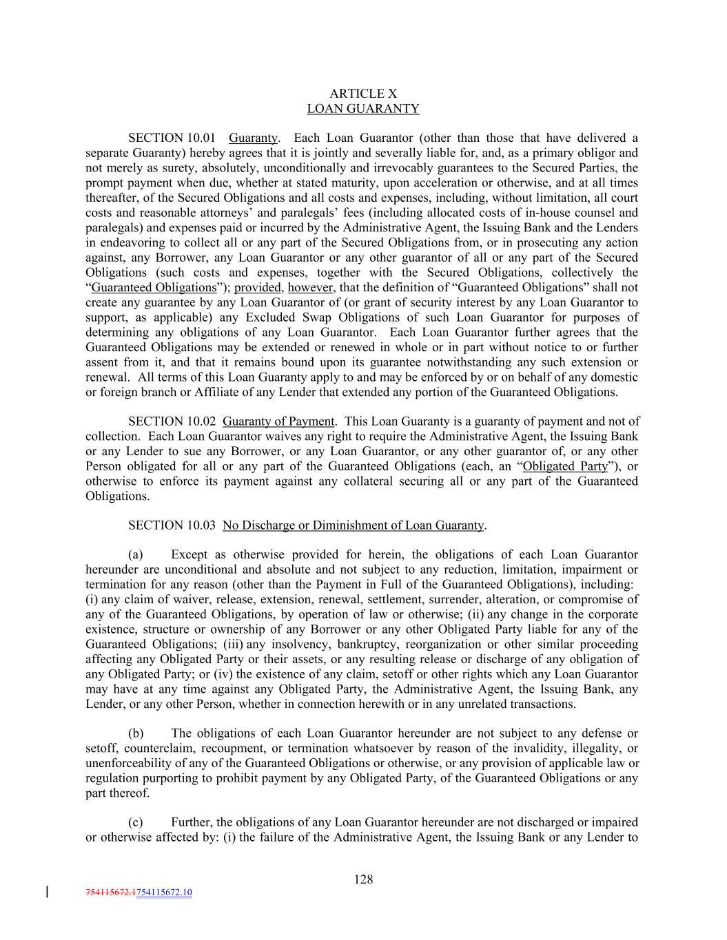 ARTICLE X LOAN GUARANTY SECTION 10.01 Guaranty. Each Loan Guarantor (other than those that have delivered a separate Guaranty) hereby agrees that it is jointly and severally liable for, and, as a primary obligor and not merely as surety, absolutely, unconditionally and irrevocably guarantees to the Secured Parties, the prompt payment when due, whether at stated maturity, upon acceleration or otherwise, and at all times thereafter, of the Secured Obligations and all costs and expenses, including, without limitation, all court costs and reasonable attorneys’ and paralegals’ fees (including allocated costs of in-house counsel and paralegals) and expenses paid or incurred by the Administrative Agent, the Issuing Bank and the Lenders in endeavoring to collect all or any part of the Secured Obligations from, or in prosecuting any action against, any Borrower, any Loan Guarantor or any other guarantor of all or any part of the Secured Obligations (such costs and expenses, together with the Secured Obligations, collectively the “Guaranteed Obligations”); provided, however, that the definition of “Guaranteed Obligations” shall not create any guarantee by any Loan Guarantor of (or grant of security interest by any Loan Guarantor to support, as applicable) any Excluded Swap Obligations of such Loan Guarantor for purposes of determining any obligations of any Loan Guarantor. Each Loan Guarantor further agrees that the Guaranteed Obligations may be extended or renewed in whole or in part without notice to or further assent from it, and that it remains bound upon its guarantee notwithstanding any such extension or renewal. All terms of this Loan Guaranty apply to and may be enforced by or on behalf of any domestic or foreign branch or Affiliate of any Lender that extended any portion of the Guaranteed Obligations. SECTION 10.02 Guaranty of Payment. This Loan Guaranty is a guaranty of payment and not of collection. Each Loan Guarantor waives any right to require the Administrative Agent, the Issuing Bank or any Lender to sue any Borrower, or any Loan Guarantor, or any other guarantor of, or any other Person obligated for all or any part of the Guaranteed Obligations (each, an “Obligated Party”), or otherwise to enforce its payment against any collateral securing all or any part of the Guaranteed Obligations. SECTION 10.03 No Discharge or Diminishment of Loan Guaranty. (a) Except as otherwise provided for herein, the obligations of each Loan Guarantor hereunder are unconditional and absolute and not subject to any reduction, limitation, impairment or termination for any reason (other than the Payment in Full of the Guaranteed Obligations), including: (i) any claim of waiver, release, extension, renewal, settlement, surrender, alteration, or compromise of any of the Guaranteed Obligations, by operation of law or otherwise; (ii) any change in the corporate existence, structure or ownership of any Borrower or any other Obligated Party liable for any of the Guaranteed Obligations; (iii) any insolvency, bankruptcy, reorganization or other similar proceeding affecting any Obligated Party or their assets, or any resulting release or discharge of any obligation of any Obligated Party; or (iv) the existence of any claim, setoff or other rights which any Loan Guarantor may have at any time against any Obligated Party, the Administrative Agent, the Issuing Bank, any Lender, or any other Person, whether in connection herewith or in any unrelated transactions. (b) The obligations of each Loan Guarantor hereunder are not subject to any defense or setoff, counterclaim, recoupment, or termination whatsoever by reason of the invalidity, illegality, or unenforceability of any of the Guaranteed Obligations or otherwise, or any provision of applicable law or regulation purporting to prohibit payment by any Obligated Party, of the Guaranteed Obligations or any part thereof. (c) Further, the obligations of any Loan Guarantor hereunder are not discharged or impaired or otherwise affected by: (i) the failure of the Administrative Agent, the Issuing Bank or any Lender to 128 754115672.1754115672.10