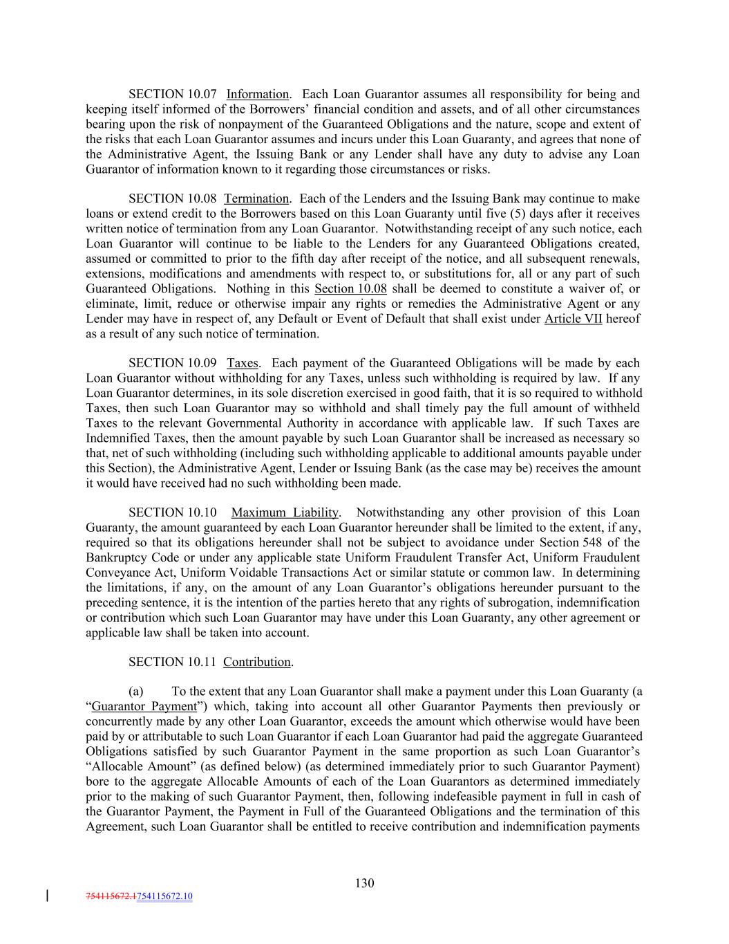 SECTION 10.07 Information. Each Loan Guarantor assumes all responsibility for being and keeping itself informed of the Borrowers’ financial condition and assets, and of all other circumstances bearing upon the risk of nonpayment of the Guaranteed Obligations and the nature, scope and extent of the risks that each Loan Guarantor assumes and incurs under this Loan Guaranty, and agrees that none of the Administrative Agent, the Issuing Bank or any Lender shall have any duty to advise any Loan Guarantor of information known to it regarding those circumstances or risks. SECTION 10.08 Termination. Each of the Lenders and the Issuing Bank may continue to make loans or extend credit to the Borrowers based on this Loan Guaranty until five (5) days after it receives written notice of termination from any Loan Guarantor. Notwithstanding receipt of any such notice, each Loan Guarantor will continue to be liable to the Lenders for any Guaranteed Obligations created, assumed or committed to prior to the fifth day after receipt of the notice, and all subsequent renewals, extensions, modifications and amendments with respect to, or substitutions for, all or any part of such Guaranteed Obligations. Nothing in this Section 10.08 shall be deemed to constitute a waiver of, or eliminate, limit, reduce or otherwise impair any rights or remedies the Administrative Agent or any Lender may have in respect of, any Default or Event of Default that shall exist under Article VII hereof as a result of any such notice of termination. SECTION 10.09 Taxes. Each payment of the Guaranteed Obligations will be made by each Loan Guarantor without withholding for any Taxes, unless such withholding is required by law. If any Loan Guarantor determines, in its sole discretion exercised in good faith, that it is so required to withhold Taxes, then such Loan Guarantor may so withhold and shall timely pay the full amount of withheld Taxes to the relevant Governmental Authority in accordance with applicable law. If such Taxes are Indemnified Taxes, then the amount payable by such Loan Guarantor shall be increased as necessary so that, net of such withholding (including such withholding applicable to additional amounts payable under this Section), the Administrative Agent, Lender or Issuing Bank (as the case may be) receives the amount it would have received had no such withholding been made. SECTION 10.10 Maximum Liability. Notwithstanding any other provision of this Loan Guaranty, the amount guaranteed by each Loan Guarantor hereunder shall be limited to the extent, if any, required so that its obligations hereunder shall not be subject to avoidance under Section 548 of the Bankruptcy Code or under any applicable state Uniform Fraudulent Transfer Act, Uniform Fraudulent Conveyance Act, Uniform Voidable Transactions Act or similar statute or common law. In determining the limitations, if any, on the amount of any Loan Guarantor’s obligations hereunder pursuant to the preceding sentence, it is the intention of the parties hereto that any rights of subrogation, indemnification or contribution which such Loan Guarantor may have under this Loan Guaranty, any other agreement or applicable law shall be taken into account. SECTION 10.11 Contribution. (a) To the extent that any Loan Guarantor shall make a payment under this Loan Guaranty (a “Guarantor Payment”) which, taking into account all other Guarantor Payments then previously or concurrently made by any other Loan Guarantor, exceeds the amount which otherwise would have been paid by or attributable to such Loan Guarantor if each Loan Guarantor had paid the aggregate Guaranteed Obligations satisfied by such Guarantor Payment in the same proportion as such Loan Guarantor’s “Allocable Amount” (as defined below) (as determined immediately prior to such Guarantor Payment) bore to the aggregate Allocable Amounts of each of the Loan Guarantors as determined immediately prior to the making of such Guarantor Payment, then, following indefeasible payment in full in cash of the Guarantor Payment, the Payment in Full of the Guaranteed Obligations and the termination of this Agreement, such Loan Guarantor shall be entitled to receive contribution and indemnification payments 130 754115672.1754115672.10