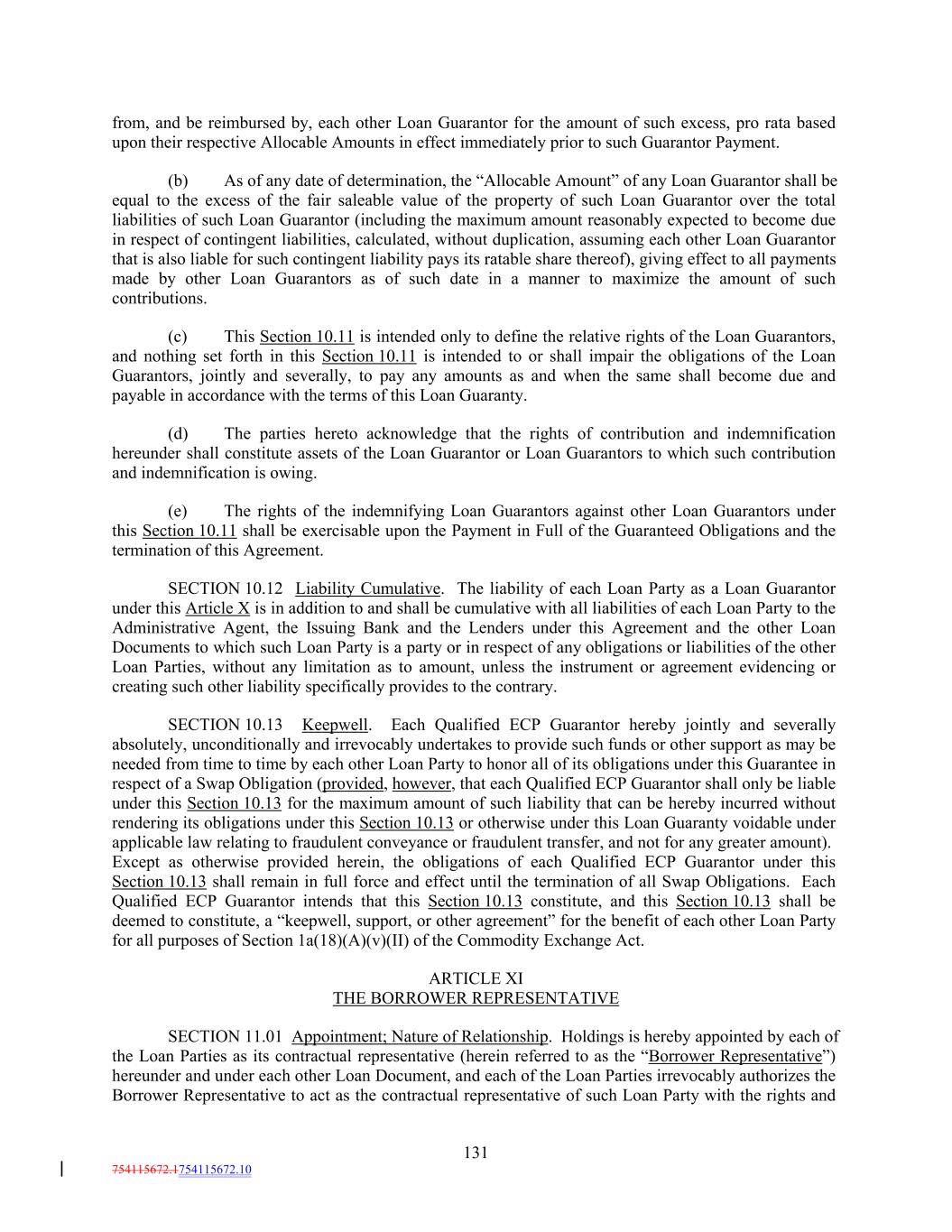 from, and be reimbursed by, each other Loan Guarantor for the amount of such excess, pro rata based upon their respective Allocable Amounts in effect immediately prior to such Guarantor Payment. (b) As of any date of determination, the “Allocable Amount” of any Loan Guarantor shall be equal to the excess of the fair saleable value of the property of such Loan Guarantor over the total liabilities of such Loan Guarantor (including the maximum amount reasonably expected to become due in respect of contingent liabilities, calculated, without duplication, assuming each other Loan Guarantor that is also liable for such contingent liability pays its ratable share thereof), giving effect to all payments made by other Loan Guarantors as of such date in a manner to maximize the amount of such contributions. (c) This Section 10.11 is intended only to define the relative rights of the Loan Guarantors, and nothing set forth in this Section 10.11 is intended to or shall impair the obligations of the Loan Guarantors, jointly and severally, to pay any amounts as and when the same shall become due and payable in accordance with the terms of this Loan Guaranty. (d) The parties hereto acknowledge that the rights of contribution and indemnification hereunder shall constitute assets of the Loan Guarantor or Loan Guarantors to which such contribution and indemnification is owing. (e) The rights of the indemnifying Loan Guarantors against other Loan Guarantors under this Section 10.11 shall be exercisable upon the Payment in Full of the Guaranteed Obligations and the termination of this Agreement. SECTION 10.12 Liability Cumulative. The liability of each Loan Party as a Loan Guarantor under this Article X is in addition to and shall be cumulative with all liabilities of each Loan Party to the Administrative Agent, the Issuing Bank and the Lenders under this Agreement and the other Loan Documents to which such Loan Party is a party or in respect of any obligations or liabilities of the other Loan Parties, without any limitation as to amount, unless the instrument or agreement evidencing or creating such other liability specifically provides to the contrary. SECTION 10.13 Keepwell. Each Qualified ECP Guarantor hereby jointly and severally absolutely, unconditionally and irrevocably undertakes to provide such funds or other support as may be needed from time to time by each other Loan Party to honor all of its obligations under this Guarantee in respect of a Swap Obligation (provided, however, that each Qualified ECP Guarantor shall only be liable under this Section 10.13 for the maximum amount of such liability that can be hereby incurred without rendering its obligations under this Section 10.13 or otherwise under this Loan Guaranty voidable under applicable law relating to fraudulent conveyance or fraudulent transfer, and not for any greater amount). Except as otherwise provided herein, the obligations of each Qualified ECP Guarantor under this Section 10.13 shall remain in full force and effect until the termination of all Swap Obligations. Each Qualified ECP Guarantor intends that this Section 10.13 constitute, and this Section 10.13 shall be deemed to constitute, a “keepwell, support, or other agreement” for the benefit of each other Loan Party for all purposes of Section 1a(18)(A)(v)(II) of the Commodity Exchange Act. ARTICLE XI THE BORROWER REPRESENTATIVE SECTION 11.01 Appointment; Nature of Relationship. Holdings is hereby appointed by each of the Loan Parties as its contractual representative (herein referred to as the “Borrower Representative”) hereunder and under each other Loan Document, and each of the Loan Parties irrevocably authorizes the Borrower Representative to act as the contractual representative of such Loan Party with the rights and 131 754115672.1754115672.10