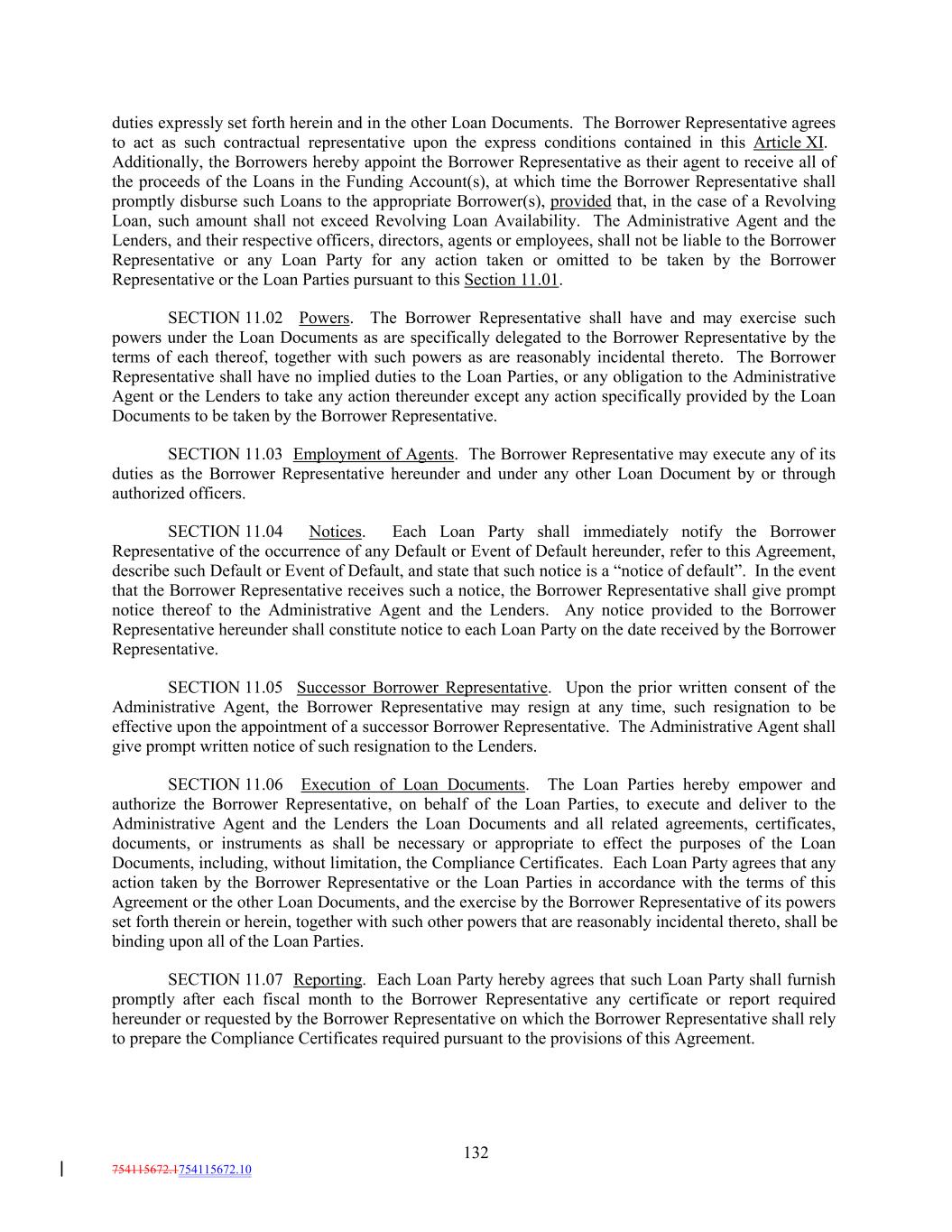 duties expressly set forth herein and in the other Loan Documents. The Borrower Representative agrees to act as such contractual representative upon the express conditions contained in this Article XI. Additionally, the Borrowers hereby appoint the Borrower Representative as their agent to receive all of the proceeds of the Loans in the Funding Account(s), at which time the Borrower Representative shall promptly disburse such Loans to the appropriate Borrower(s), provided that, in the case of a Revolving Loan, such amount shall not exceed Revolving Loan Availability. The Administrative Agent and the Lenders, and their respective officers, directors, agents or employees, shall not be liable to the Borrower Representative or any Loan Party for any action taken or omitted to be taken by the Borrower Representative or the Loan Parties pursuant to this Section 11.01. SECTION 11.02 Powers. The Borrower Representative shall have and may exercise such powers under the Loan Documents as are specifically delegated to the Borrower Representative by the terms of each thereof, together with such powers as are reasonably incidental thereto. The Borrower Representative shall have no implied duties to the Loan Parties, or any obligation to the Administrative Agent or the Lenders to take any action thereunder except any action specifically provided by the Loan Documents to be taken by the Borrower Representative. SECTION 11.03 Employment of Agents. The Borrower Representative may execute any of its duties as the Borrower Representative hereunder and under any other Loan Document by or through authorized officers. SECTION 11.04 Notices. Each Loan Party shall immediately notify the Borrower Representative of the occurrence of any Default or Event of Default hereunder, refer to this Agreement, describe such Default or Event of Default, and state that such notice is a “notice of default”. In the event that the Borrower Representative receives such a notice, the Borrower Representative shall give prompt notice thereof to the Administrative Agent and the Lenders. Any notice provided to the Borrower Representative hereunder shall constitute notice to each Loan Party on the date received by the Borrower Representative. SECTION 11.05 Successor Borrower Representative. Upon the prior written consent of the Administrative Agent, the Borrower Representative may resign at any time, such resignation to be effective upon the appointment of a successor Borrower Representative. The Administrative Agent shall give prompt written notice of such resignation to the Lenders. SECTION 11.06 Execution of Loan Documents. The Loan Parties hereby empower and authorize the Borrower Representative, on behalf of the Loan Parties, to execute and deliver to the Administrative Agent and the Lenders the Loan Documents and all related agreements, certificates, documents, or instruments as shall be necessary or appropriate to effect the purposes of the Loan Documents, including, without limitation, the Compliance Certificates. Each Loan Party agrees that any action taken by the Borrower Representative or the Loan Parties in accordance with the terms of this Agreement or the other Loan Documents, and the exercise by the Borrower Representative of its powers set forth therein or herein, together with such other powers that are reasonably incidental thereto, shall be binding upon all of the Loan Parties. SECTION 11.07 Reporting. Each Loan Party hereby agrees that such Loan Party shall furnish promptly after each fiscal month to the Borrower Representative any certificate or report required hereunder or requested by the Borrower Representative on which the Borrower Representative shall rely to prepare the Compliance Certificates required pursuant to the provisions of this Agreement. 132 754115672.1754115672.10