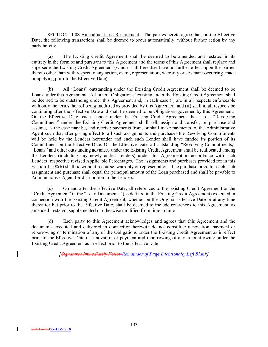 SECTION 11.08 Amendment and Restatement. The parties hereto agree that, on the Effective Date, the following transactions shall be deemed to occur automatically, without further action by any party hereto: (a) The Existing Credit Agreement shall be deemed to be amended and restated in its entirety in the form of and pursuant to this Agreement and the terms of this Agreement shall replace and supersede the Existing Credit Agreement (which shall hereafter have no further effect upon the parties thereto other than with respect to any action, event, representation, warranty or covenant occurring, made or applying prior to the Effective Date). (b) All “Loans” outstanding under the Existing Credit Agreement shall be deemed to be Loans under this Agreement. All other “Obligations” existing under the Existing Credit Agreement shall be deemed to be outstanding under this Agreement and, in each case (i) are in all respects enforceable with only the terms thereof being modified as provided by this Agreement and (ii) shall in all respects be continuing after the Effective Date and shall be deemed to be Obligations governed by this Agreement. On the Effective Date, each Lender under the Existing Credit Agreement that has a “Revolving Commitment” under the Existing Credit Agreement shall sell, assign and transfer, or purchase and assume, as the case may be, and receive payments from, or shall make payments to, the Administrative Agent such that after giving effect to all such assignments and purchases the Revolving Commitments will be held by the Lenders hereunder and each such Lender shall have funded its portion of its Commitment on the Effective Date. On the Effective Date, all outstanding “Revolving Commitments,” “Loans” and other outstanding advances under the Existing Credit Agreement shall be reallocated among the Lenders (including any newly added Lenders) under this Agreement in accordance with such Lenders’ respective revised Applicable Percentages. The assignments and purchases provided for in this Section 11.08(b) shall be without recourse, warranty or representation. The purchase price for each such assignment and purchase shall equal the principal amount of the Loan purchased and shall be payable to Administrative Agent for distribution to the Lenders. (c) On and after the Effective Date, all references to the Existing Credit Agreement or the “Credit Agreement” in the “Loan Documents” (as defined in the Existing Credit Agreement) executed in connection with the Existing Credit Agreement, whether on the Original Effective Date or at any time thereafter but prior to the Effective Date, shall be deemed to include references to this Agreement, as amended, restated, supplemented or otherwise modified from time to time. (d) Each party to this Agreement acknowledges and agrees that this Agreement and the documents executed and delivered in connection herewith do not constitute a novation, payment or reborrowing or termination of any of the Obligations under the Existing Credit Agreement as in effect prior to the Effective Date or a novation or payment and reborrowing of any amount owing under the Existing Credit Agreement as in effect prior to the Effective Date. [Signatures Immediately FollowRemainder of Page Intentionally Left Blank] 133 754115672.1754115672.10