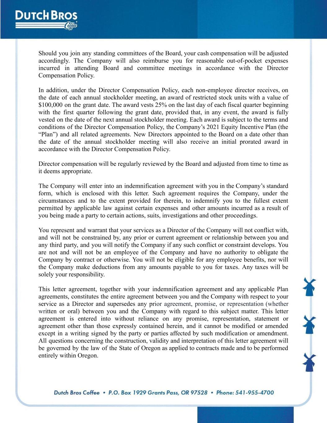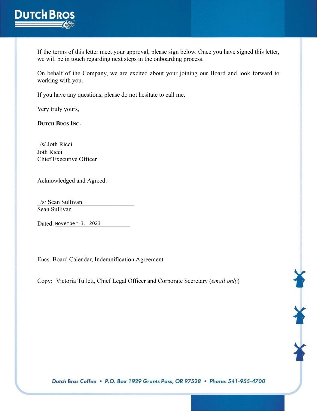 If the terms of this letter meet your approval, please sign below. Once you have signed this letter, we will be in touch regarding next steps in the onboarding process. On behalf of the Company, we are excited about your joining our Board and look forward to working with you. If you have any questions, please do not hesitate to call me. Very truly yours, DUTCH BROS INC. ________________________________ Joth Ricci Chief Executive Officer Acknowledged and Agreed: _______________________________ Sean Sullivan Dated: ________________________ Encs. Board Calendar, Indemnification Agreement Copy: Victoria Tullett, Chief Legal Officer and Corporate Secretary (email only) November 3, 2023 /s/ Joth Ricci /s/ Sean Sullivan