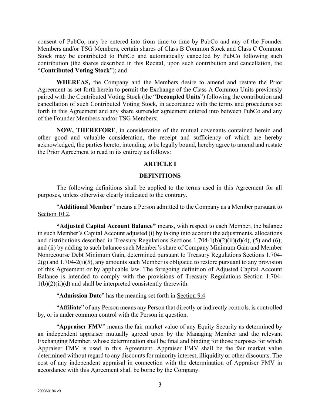 299360196 v9 3 consent of PubCo, may be entered into from time to time by PubCo and any of the Founder Members and/or TSG Members, certain shares of Class B Common Stock and Class C Common Stock may be contributed to PubCo and automatically cancelled by PubCo following such contribution (the shares described in this Recital, upon such contribution and cancellation, the “Contributed Voting Stock”); and WHEREAS, the Company and the Members desire to amend and restate the Prior Agreement as set forth herein to permit the Exchange of the Class A Common Units previously paired with the Contributed Voting Stock (the “Decoupled Units”) following the contribution and cancellation of such Contributed Voting Stock, in accordance with the terms and procedures set forth in this Agreement and any share surrender agreement entered into between PubCo and any of the Founder Members and/or TSG Members; NOW, THEREFORE, in consideration of the mutual covenants contained herein and other good and valuable consideration, the receipt and sufficiency of which are hereby acknowledged, the parties hereto, intending to be legally bound, hereby agree to amend and restate the Prior Agreement to read in its entirety as follows: ARTICLE I DEFINITIONS The following definitions shall be applied to the terms used in this Agreement for all purposes, unless otherwise clearly indicated to the contrary. “Additional Member” means a Person admitted to the Company as a Member pursuant to Section 10.2. “Adjusted Capital Account Balance” means, with respect to each Member, the balance in such Member’s Capital Account adjusted (i) by taking into account the adjustments, allocations and distributions described in Treasury Regulations Sections 1.704-1(b)(2)(ii)(d)(4), (5) and (6); and (ii) by adding to such balance such Member’s share of Company Minimum Gain and Member Nonrecourse Debt Minimum Gain, determined pursuant to Treasury Regulations Sections 1.704- 2(g) and 1.704-2(i)(5), any amounts such Member is obligated to restore pursuant to any provision of this Agreement or by applicable law. The foregoing definition of Adjusted Capital Account Balance is intended to comply with the provisions of Treasury Regulations Section 1.704- 1(b)(2)(ii)(d) and shall be interpreted consistently therewith. “Admission Date” has the meaning set forth in Section 9.4. “Affiliate” of any Person means any Person that directly or indirectly controls, is controlled by, or is under common control with the Person in question. “Appraiser FMV” means the fair market value of any Equity Security as determined by an independent appraiser mutually agreed upon by the Managing Member and the relevant Exchanging Member, whose determination shall be final and binding for those purposes for which Appraiser FMV is used in this Agreement. Appraiser FMV shall be the fair market value determined without regard to any discounts for minority interest, illiquidity or other discounts. The cost of any independent appraisal in connection with the determination of Appraiser FMV in accordance with this Agreement shall be borne by the Company.