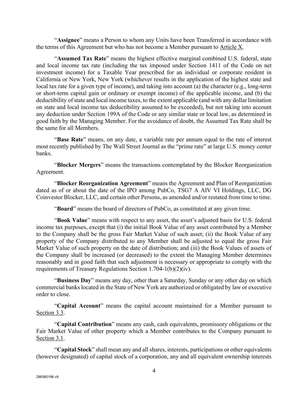 299360196 v9 4 “Assignee” means a Person to whom any Units have been Transferred in accordance with the terms of this Agreement but who has not become a Member pursuant to Article X. “Assumed Tax Rate” means the highest effective marginal combined U.S. federal, state and local income tax rate (including the tax imposed under Section 1411 of the Code on net investment income) for a Taxable Year prescribed for an individual or corporate resident in California or New York, New York (whichever results in the application of the highest state and local tax rate for a given type of income), and taking into account (a) the character (e.g., long-term or short-term capital gain or ordinary or exempt income) of the applicable income, and (b) the deductibility of state and local income taxes, to the extent applicable (and with any dollar limitation on state and local income tax deductibility assumed to be exceeded), but not taking into account any deduction under Section 199A of the Code or any similar state or local law, as determined in good faith by the Managing Member. For the avoidance of doubt, the Assumed Tax Rate shall be the same for all Members. “Base Rate” means, on any date, a variable rate per annum equal to the rate of interest most recently published by The Wall Street Journal as the “prime rate” at large U.S. money center banks. “Blocker Mergers” means the transactions contemplated by the Blocker Reorganization Agreement. “Blocker Reorganization Agreement” means the Agreement and Plan of Reorganization dated as of or about the date of the IPO among PubCo, TSG7 A AIV VI Holdings, LLC, DG Coinvestor Blocker, LLC, and certain other Persons, as amended and/or restated from time to time. “Board” means the board of directors of PubCo, as constituted at any given time. “Book Value” means with respect to any asset, the asset’s adjusted basis for U.S. federal income tax purposes, except that (i) the initial Book Value of any asset contributed by a Member to the Company shall be the gross Fair Market Value of such asset; (ii) the Book Value of any property of the Company distributed to any Member shall be adjusted to equal the gross Fair Market Value of such property on the date of distribution; and (iii) the Book Values of assets of the Company shall be increased (or decreased) to the extent the Managing Member determines reasonably and in good faith that such adjustment is necessary or appropriate to comply with the requirements of Treasury Regulations Section 1.704-1(b)(2)(iv). “Business Day” means any day, other than a Saturday, Sunday or any other day on which commercial banks located in the State of New York are authorized or obligated by law or executive order to close. “Capital Account” means the capital account maintained for a Member pursuant to Section 3.3. “Capital Contribution” means any cash, cash equivalents, promissory obligations or the Fair Market Value of other property which a Member contributes to the Company pursuant to Section 3.1. “Capital Stock” shall mean any and all shares, interests, participations or other equivalents (however designated) of capital stock of a corporation, any and all equivalent ownership interests